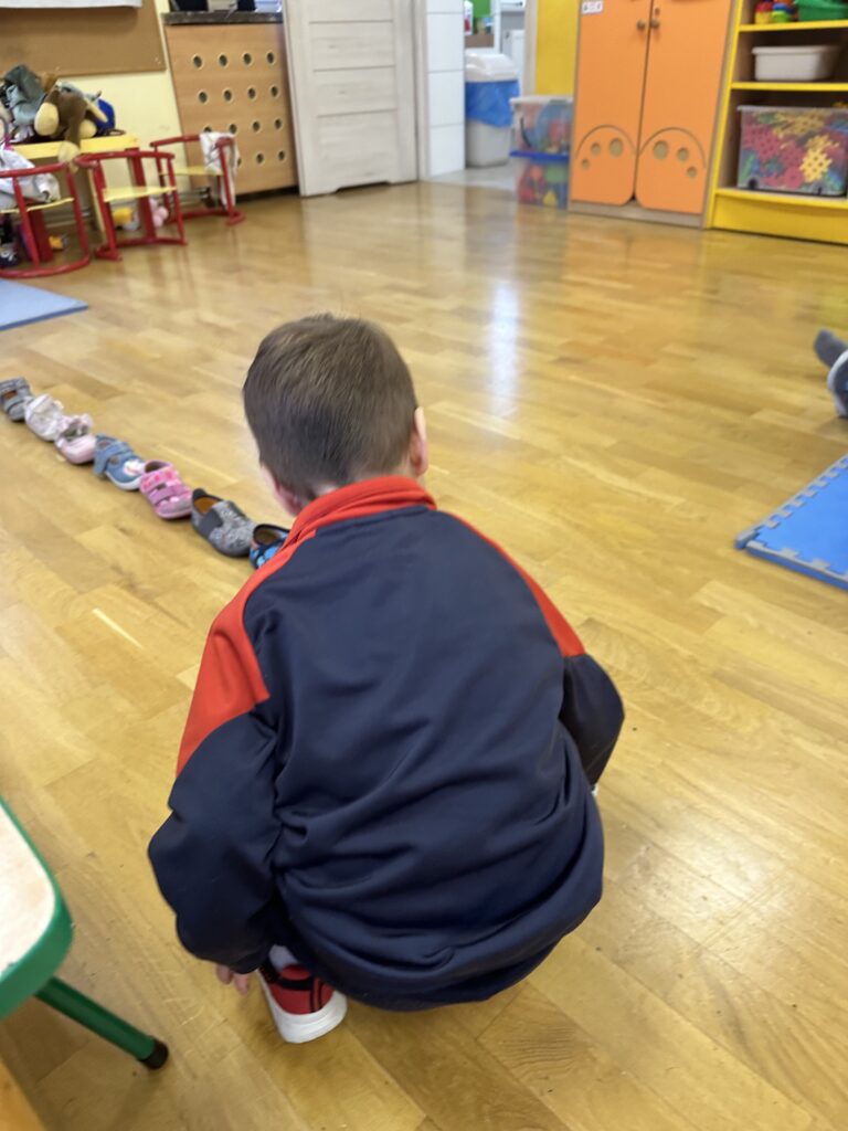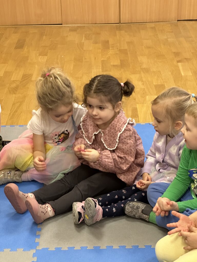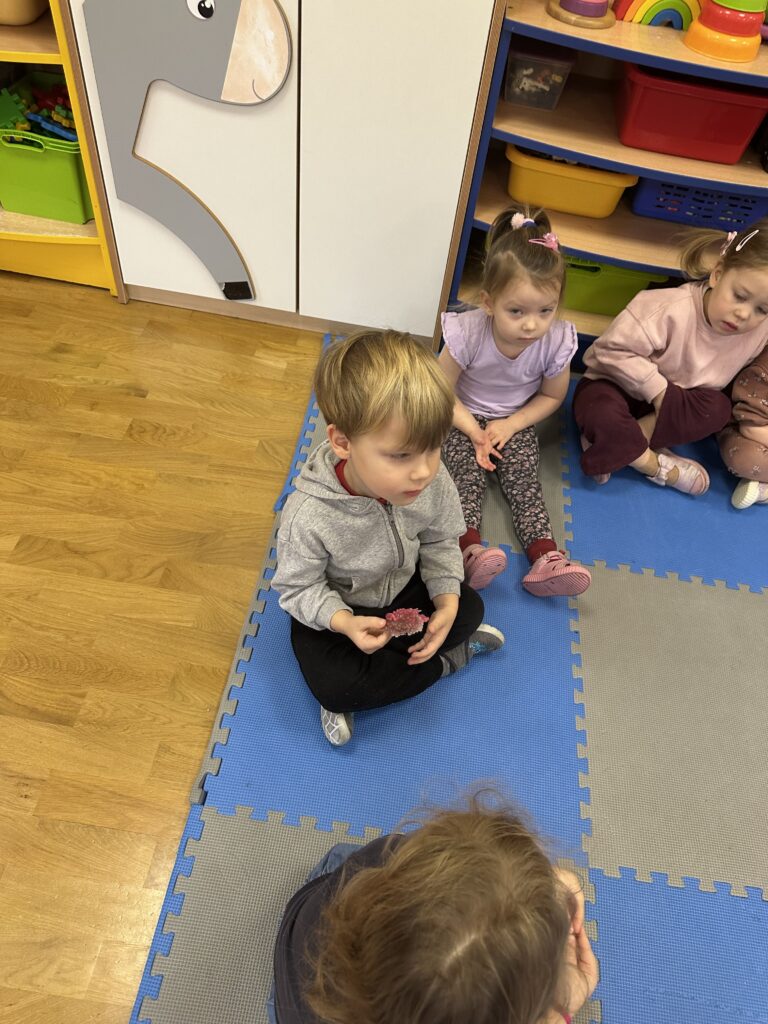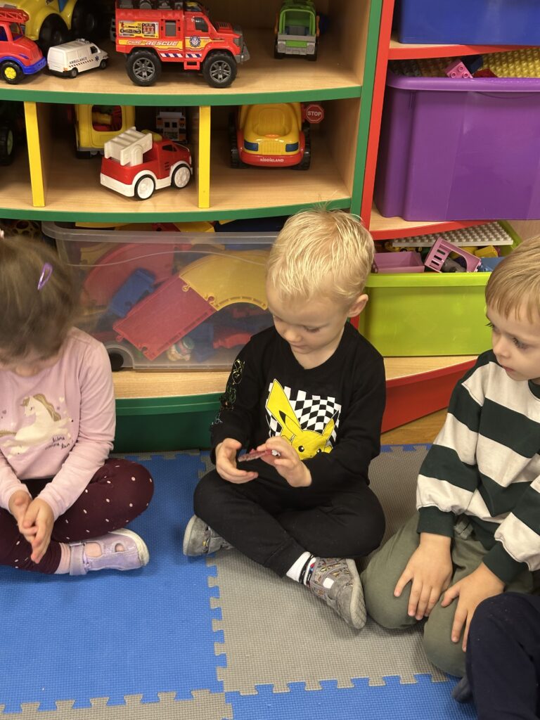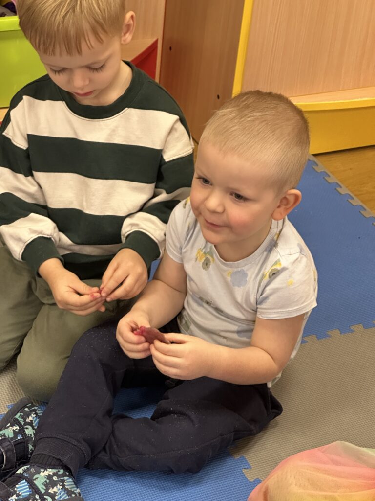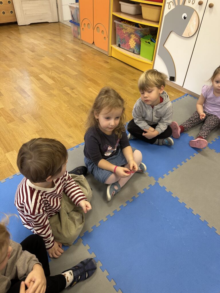 Dzieci ćwiczyły małą motorykę. Dzielnie nawlekali koraliki na sznurek.