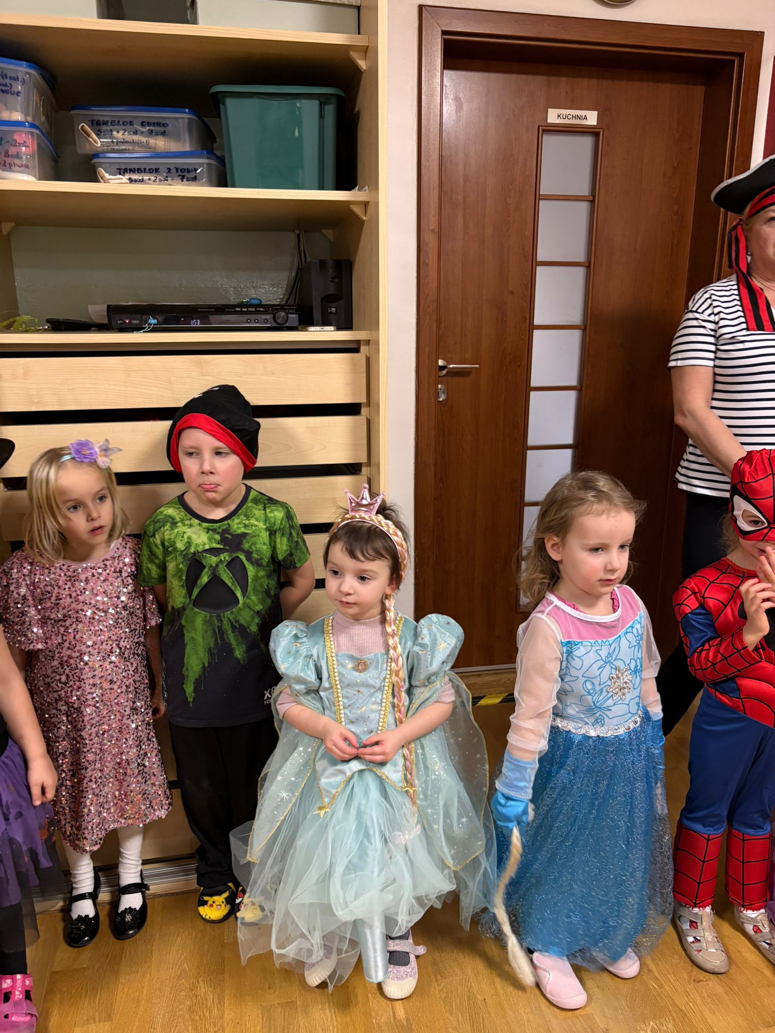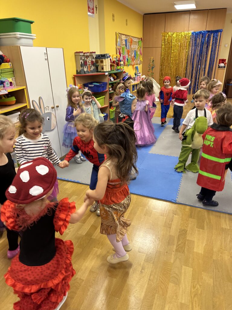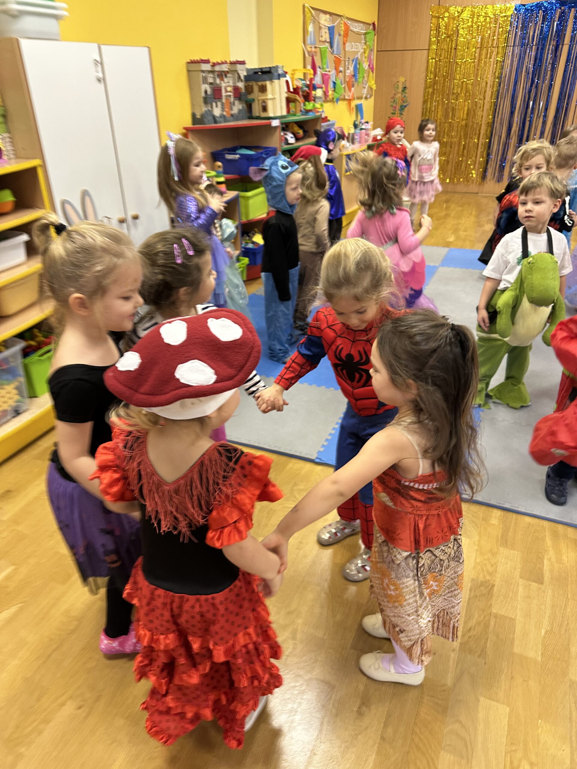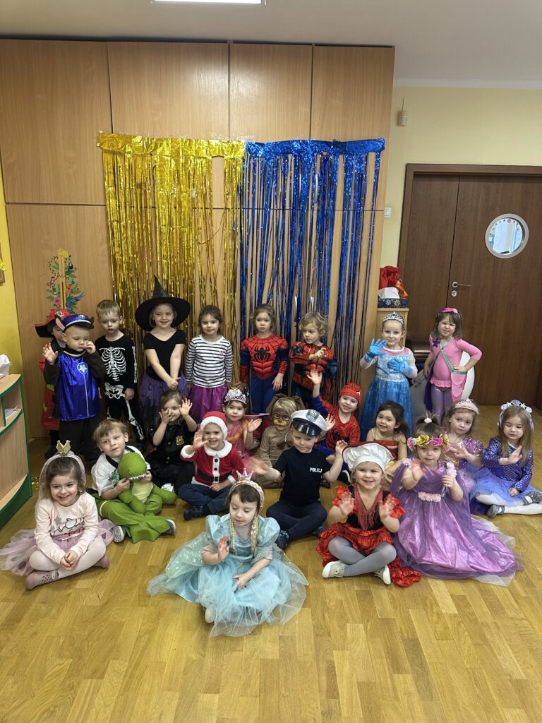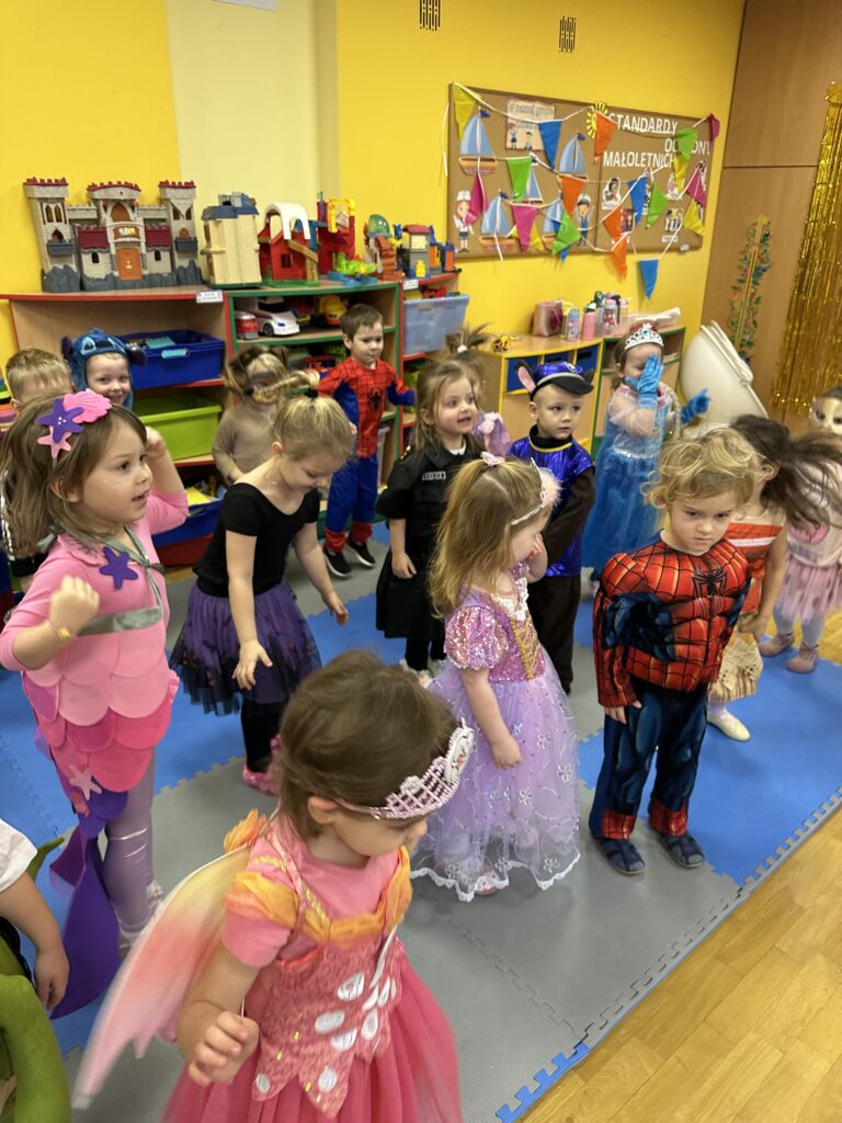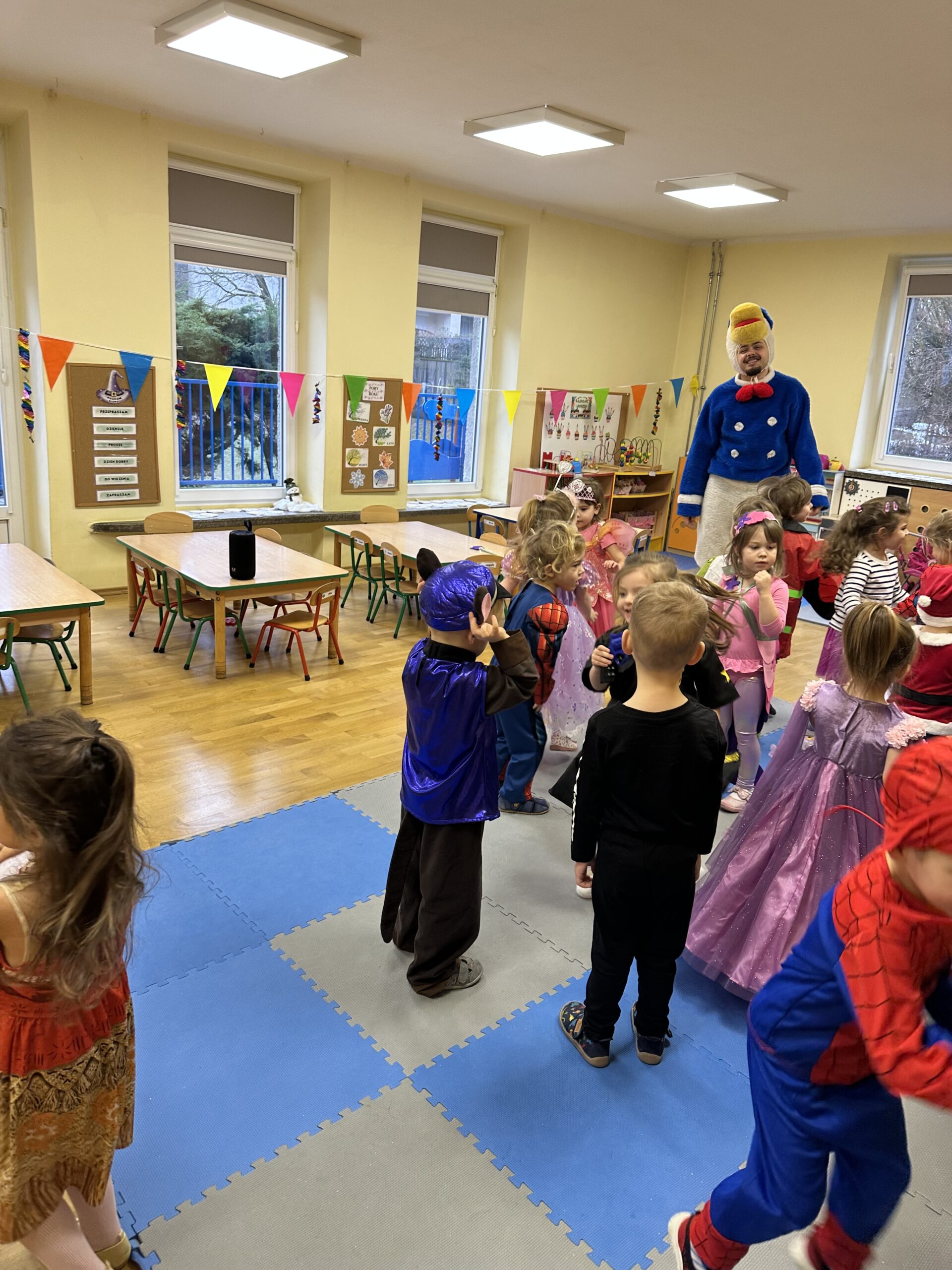 Piątek w naszym przedszkolu był niezwykłym dniem. Każdy z nas mógł zostać kim tylko chciał! Włożyliśmy przeróżne stroje i staliśmy się księżniczkami, superbohaterami, zwierzętami i innymi ulubionymi postaciami. Przed udziałem w przedszkolnym balu, w naszej sali zrobiliśmy małą rozgrzewkę, która wprowadziła nas w karnawałowy nastrój. No a potem, wspólnie ze starszymi kolegami i koleżankami uczestniczyliśmy w zabawie karnawałowej. Tańczyliśmy, braliśmy udział w zabawach, a przy tym było oczywiście dużo radości. Dodatkowo po południu każdy z nas zaprojektował swoją karnawałową maskę. To był niezapomniany dzień! 🎭
