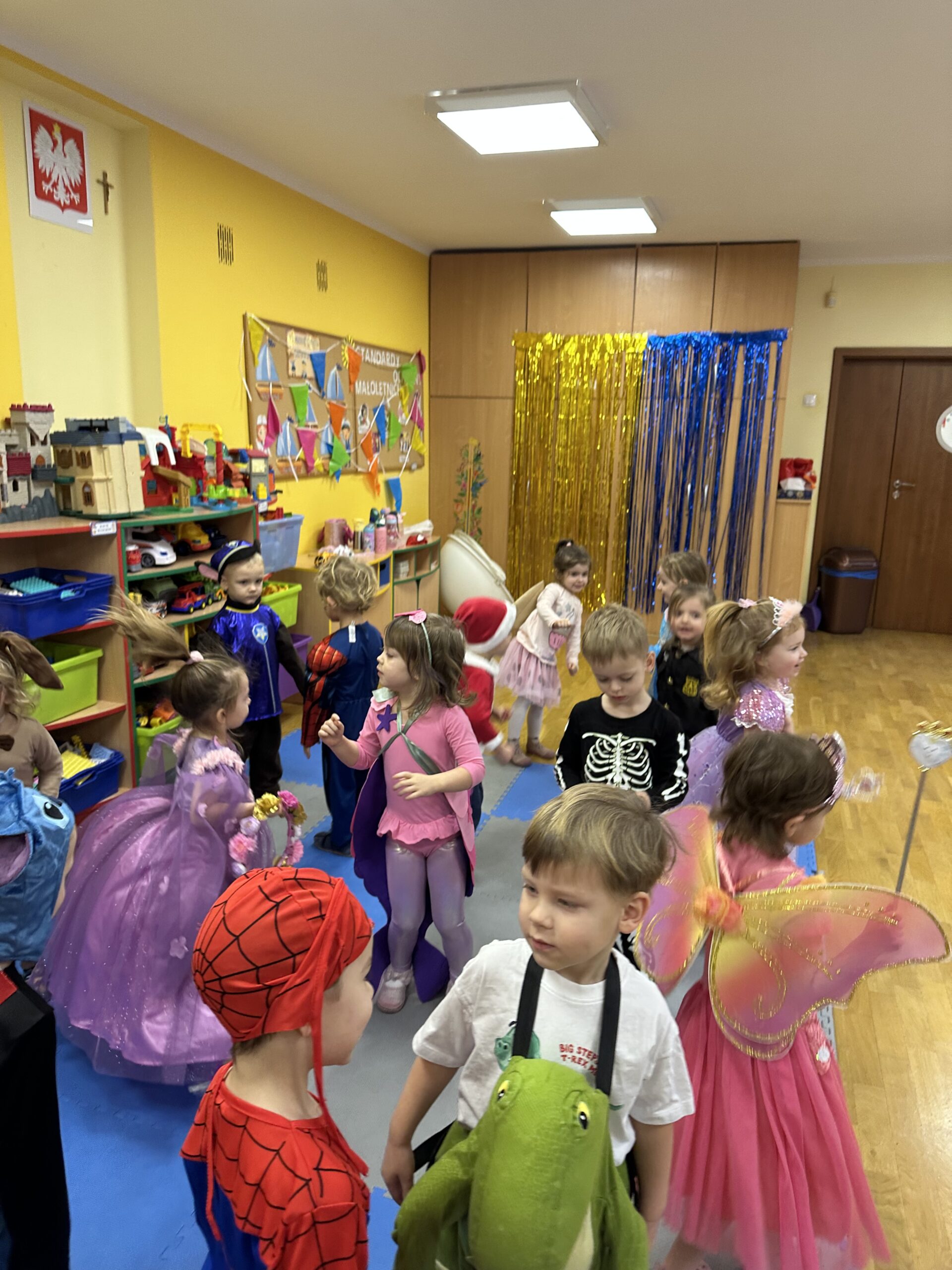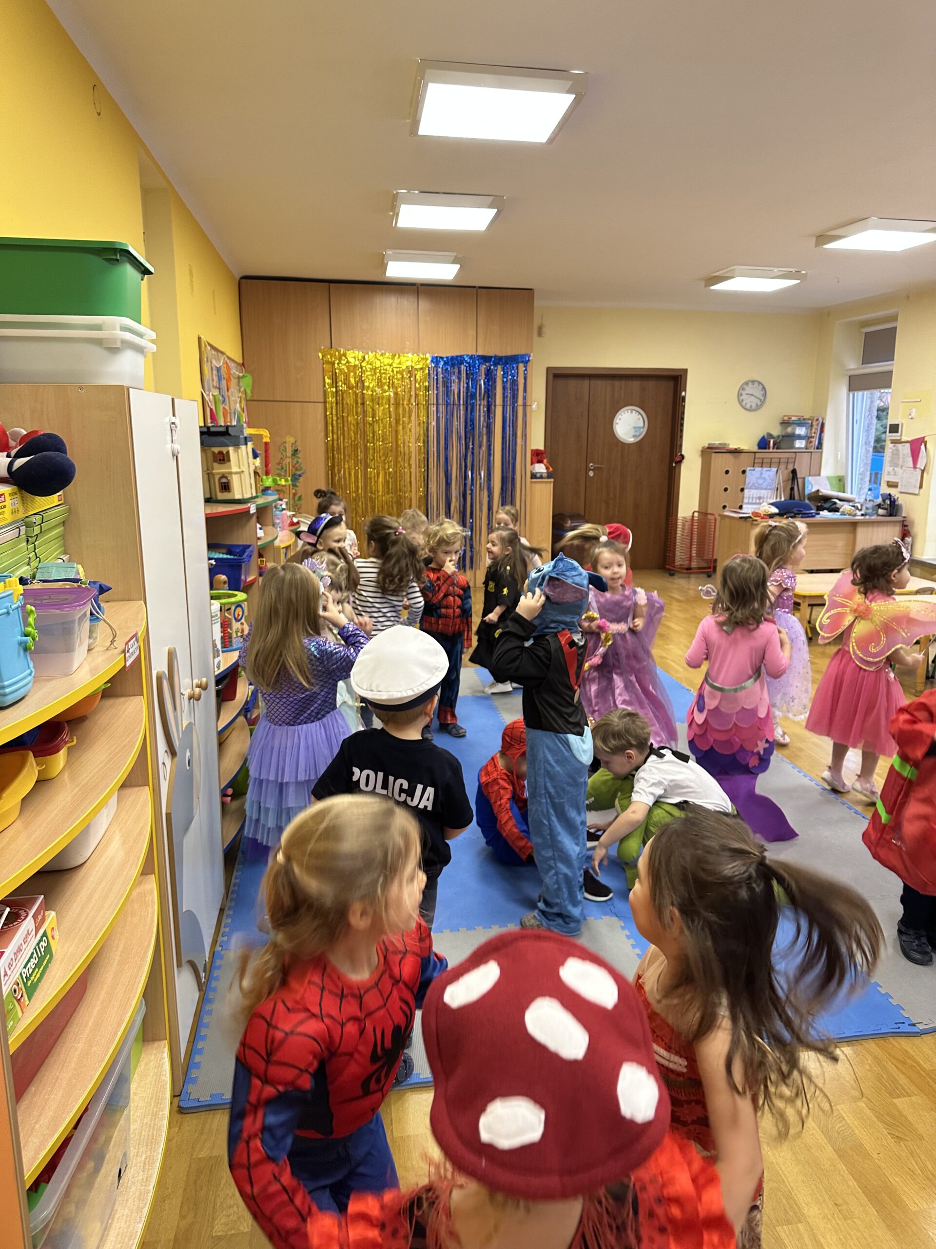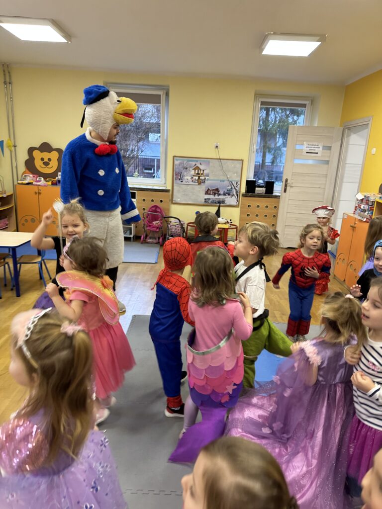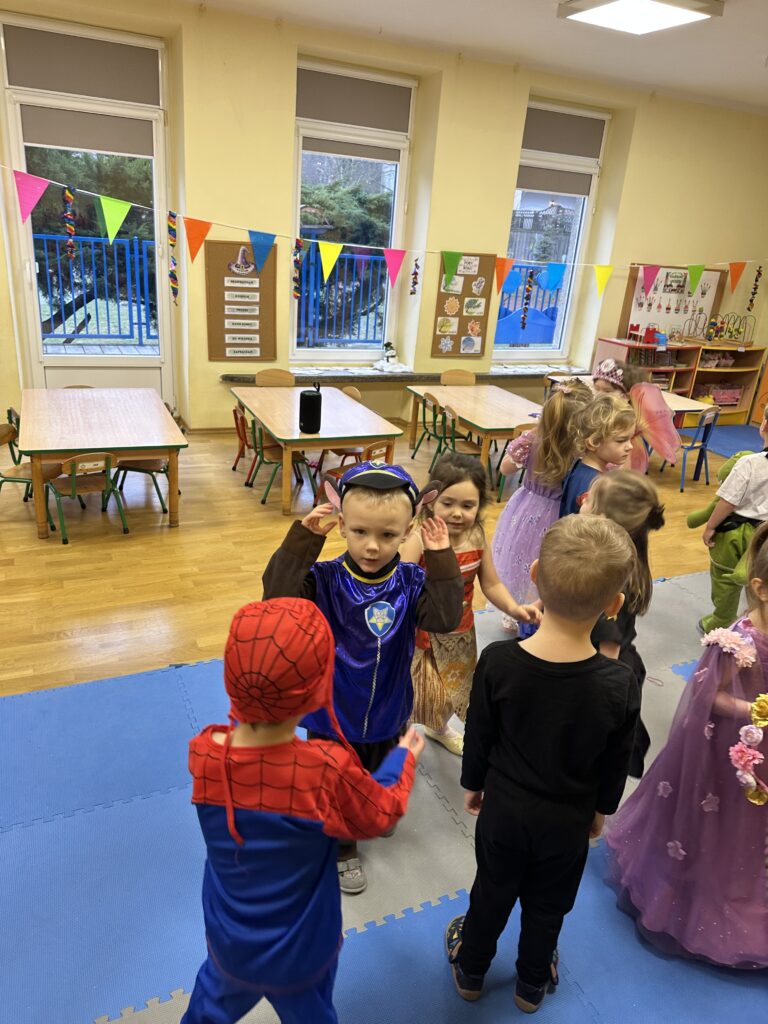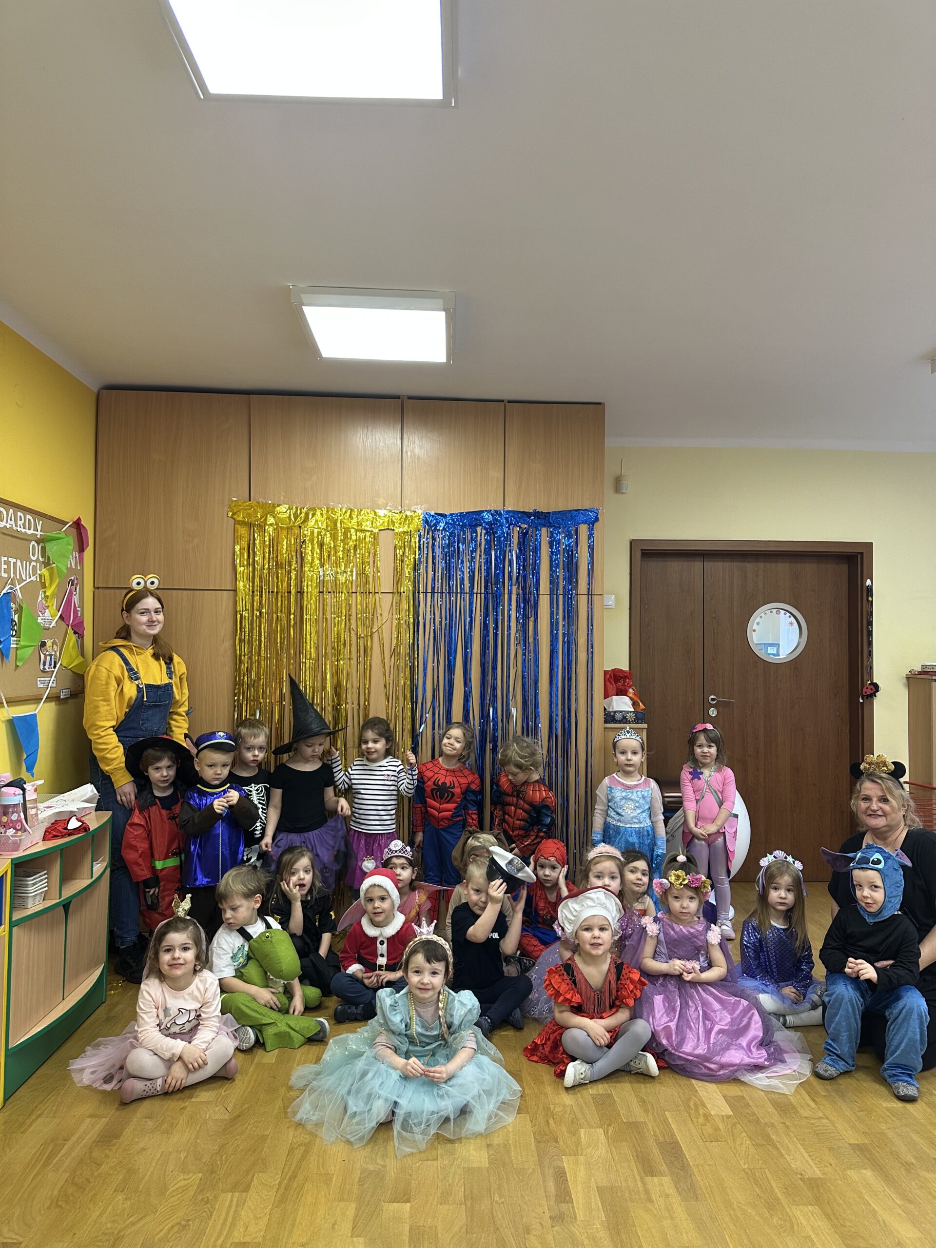 Piątek w naszym przedszkolu był niezwykłym dniem. Każdy z nas mógł zostać kim tylko chciał! Włożyliśmy przeróżne stroje i staliśmy się księżniczkami, superbohaterami, zwierzętami i innymi ulubionymi postaciami. Przed udziałem w przedszkolnym balu, w naszej sali zrobiliśmy małą rozgrzewkę, która wprowadziła nas w karnawałowy nastrój. No a potem, wspólnie ze starszymi kolegami i koleżankami uczestniczyliśmy w zabawie karnawałowej. Tańczyliśmy, braliśmy udział w zabawach, a przy tym było oczywiście dużo radości. Dodatkowo po południu każdy z nas zaprojektował swoją karnawałową maskę. To był niezapomniany dzień! 🎭