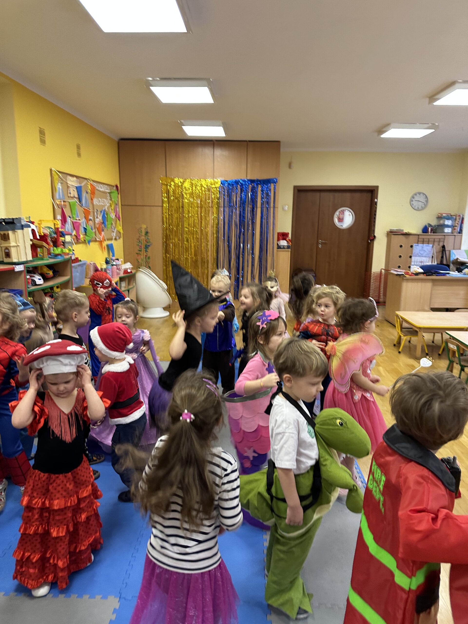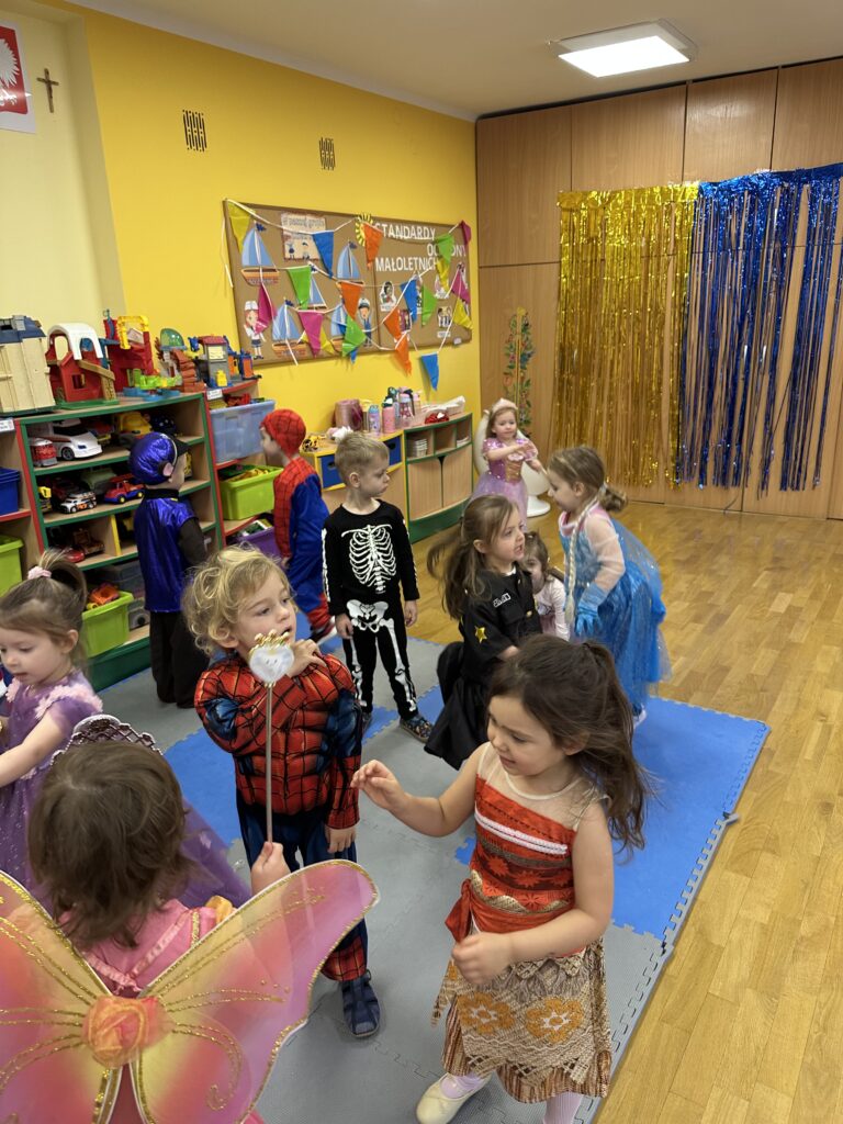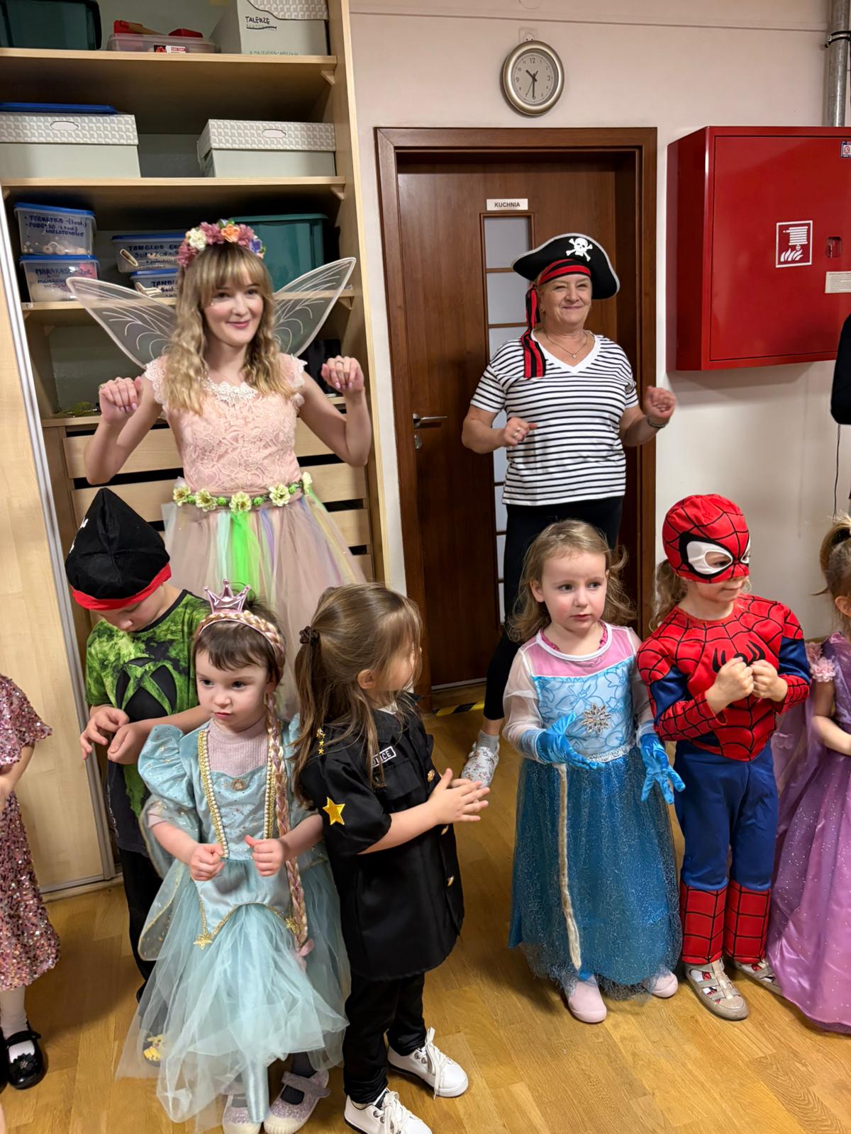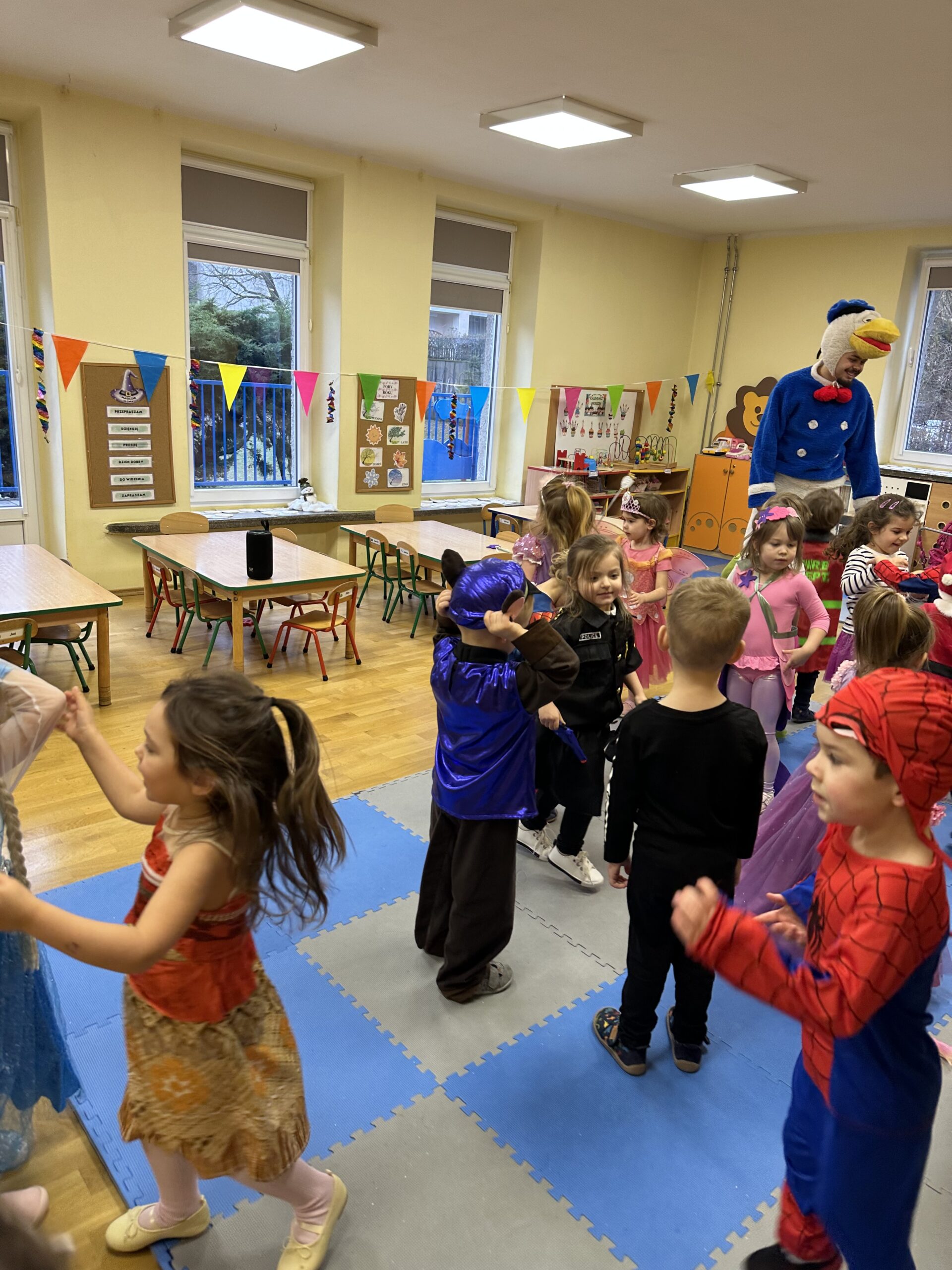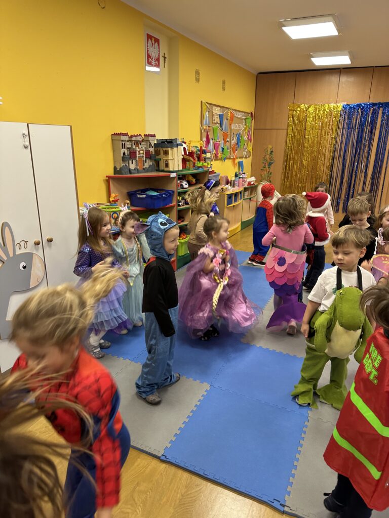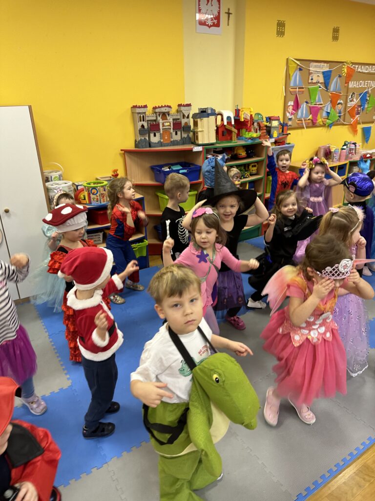 Piątek w naszym przedszkolu był niezwykłym dniem. Każdy z nas mógł zostać kim tylko chciał! Włożyliśmy przeróżne stroje i staliśmy się księżniczkami, superbohaterami, zwierzętami i innymi ulubionymi postaciami. Przed udziałem w przedszkolnym balu, w naszej sali zrobiliśmy małą rozgrzewkę, która wprowadziła nas w karnawałowy nastrój. No a potem, wspólnie ze starszymi kolegami i koleżankami uczestniczyliśmy w zabawie karnawałowej. Tańczyliśmy, braliśmy udział w zabawach, a przy tym było oczywiście dużo radości. Dodatkowo po południu każdy z nas zaprojektował swoją karnawałową maskę. To był niezapomniany dzień! 🎭