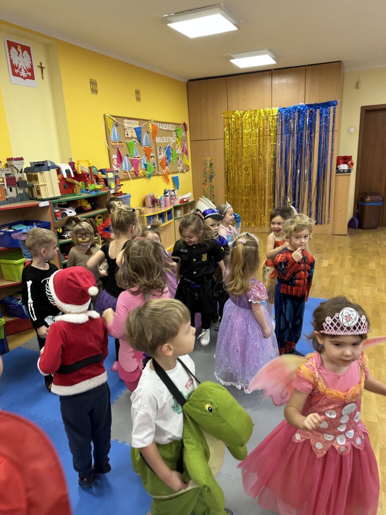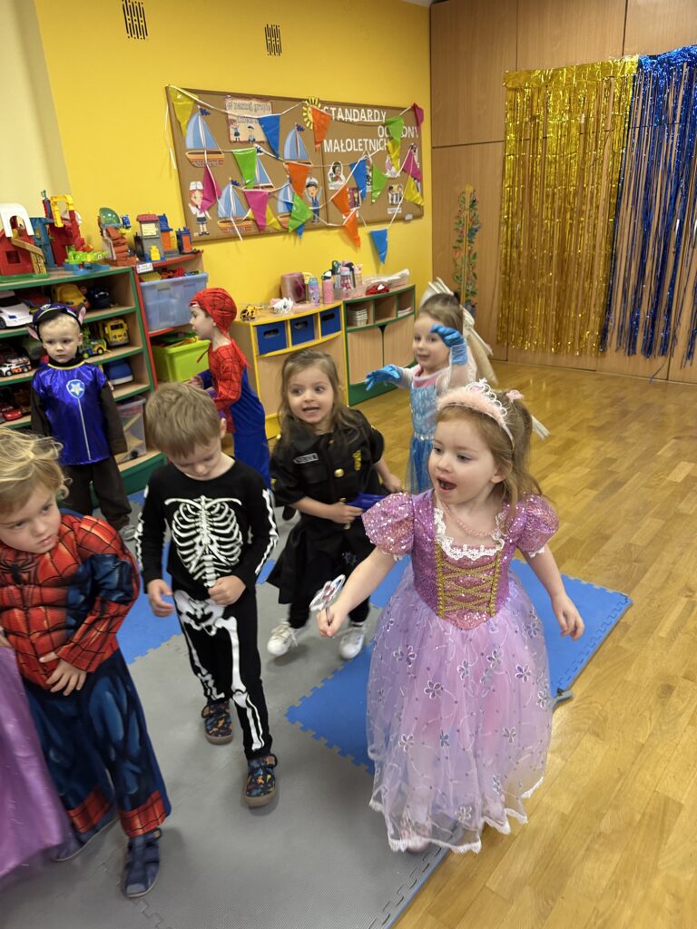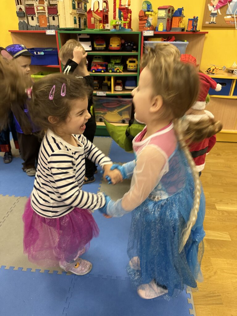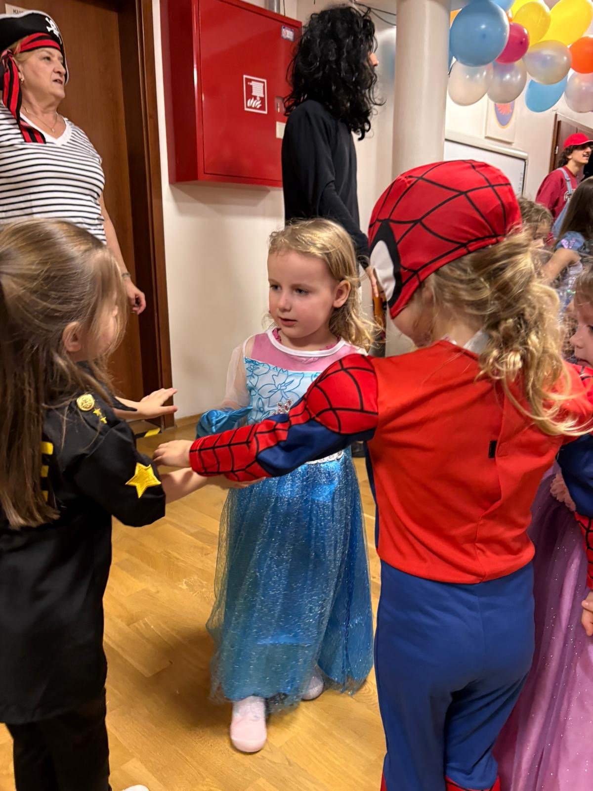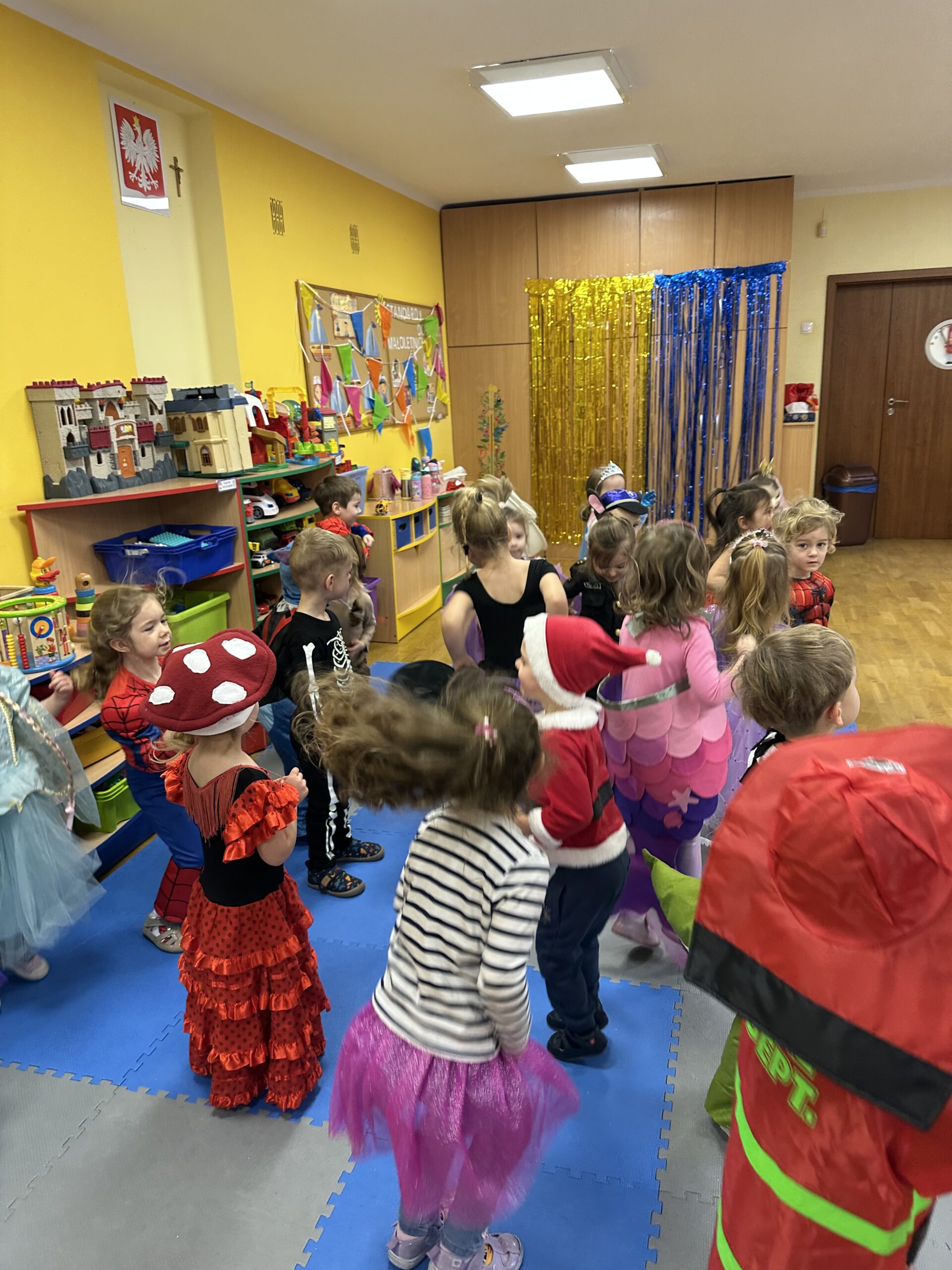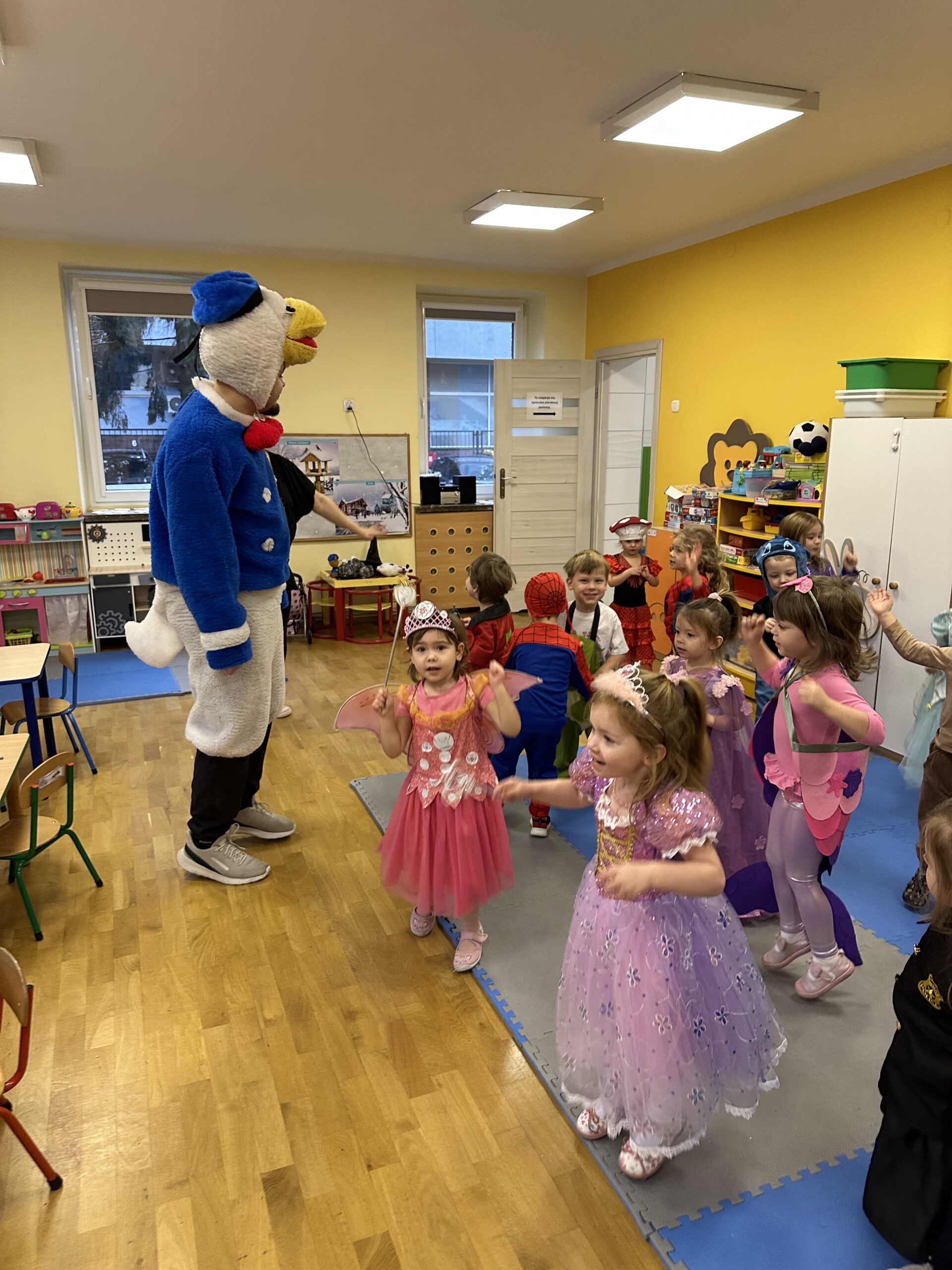 Piątek w naszym przedszkolu był niezwykłym dniem. Każdy z nas mógł zostać kim tylko chciał! Włożyliśmy przeróżne stroje i staliśmy się księżniczkami, superbohaterami, zwierzętami i innymi ulubionymi postaciami. Przed udziałem w przedszkolnym balu, w naszej sali zrobiliśmy małą rozgrzewkę, która wprowadziła nas w karnawałowy nastrój. No a potem, wspólnie ze starszymi kolegami i koleżankami uczestniczyliśmy w zabawie karnawałowej. Tańczyliśmy, braliśmy udział w zabawach, a przy tym było oczywiście dużo radości. Dodatkowo po południu każdy z nas zaprojektował swoją karnawałową maskę. To był niezapomniany dzień! 🎭