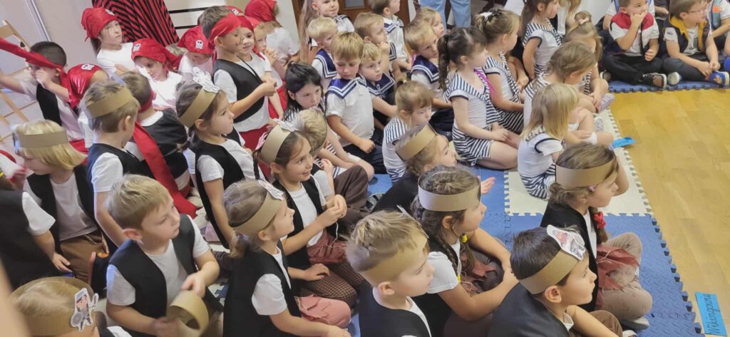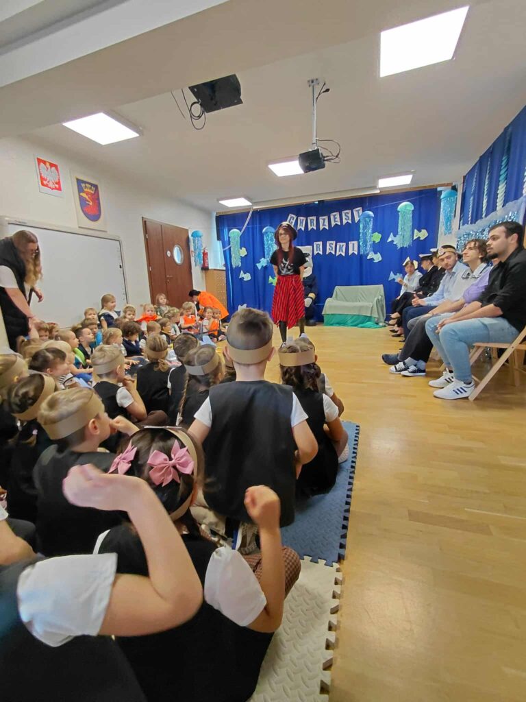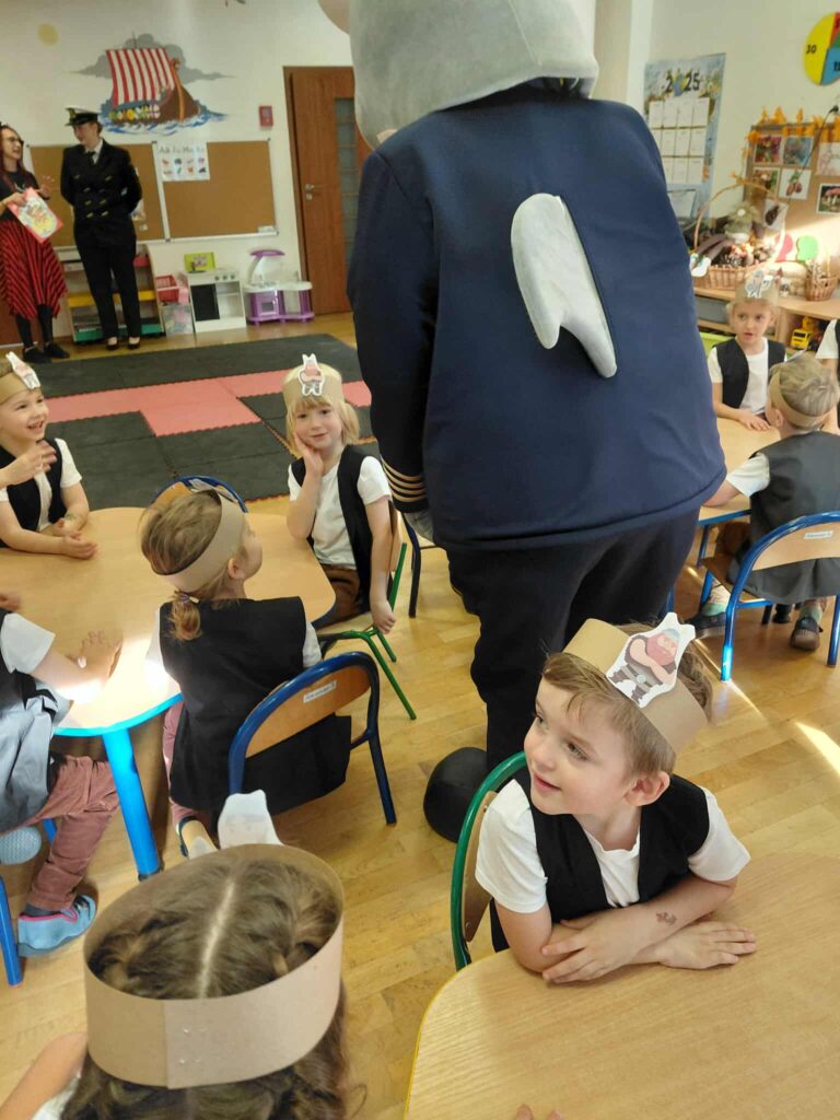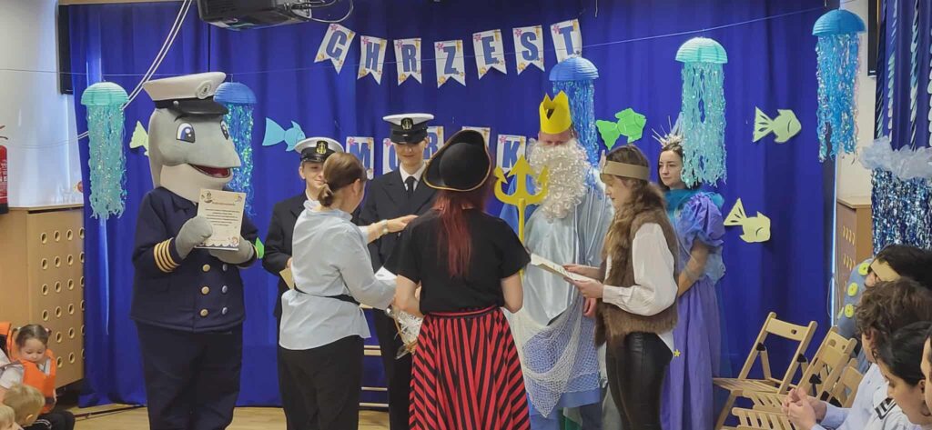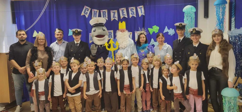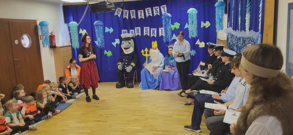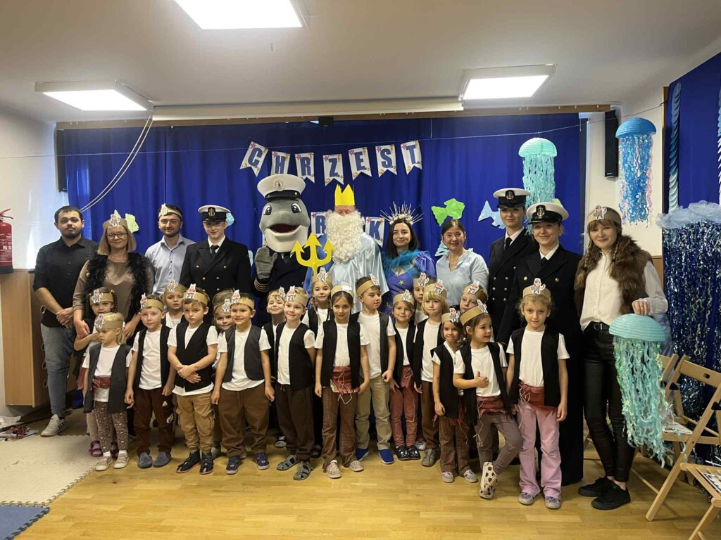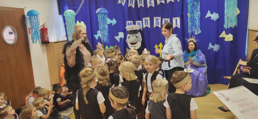 Dzisiaj nasze przedszkole zamieniło się w morski świat. Odwiedzili nas wspaniali goście, którzy uczestniczyli w bardzo ważnym dla nas dniu… Od dziś oficjalnie zostaliśmy Wikingami. Ale żeby zostać prawdziwym Wikingiem trzeba było wykazać się wiedzą, siłą i odwagą. Każdy Wiking doskonale poradził sobie z zadaniami, które mieliśmy do wykonania. Naszym zmaganiom uważnie przyglądał się sam władca mórz i oceanów Neptun razem z Prozerpiną. Na naszej uroczystości pojawił się również zaprzyjaźniony Morświn z Politechniki Morskiej, który jak tylko usłyszał o słonej wodzie to postanowił, że nie może go zabraknąć. Dzisiaj też swój chrzest przeszli nasi wolontariusze, którzy rownież poradzili sobie z zadaniami. To był cudowny dzień. Dziękujemy bardzo naszym kochanym rodzicom Stasia F., którzy poświęcili swój czas i zaangażowali się w organizację uroczystości. 🙂