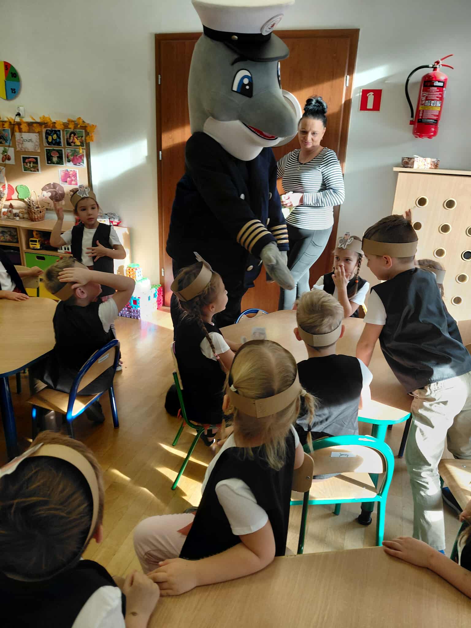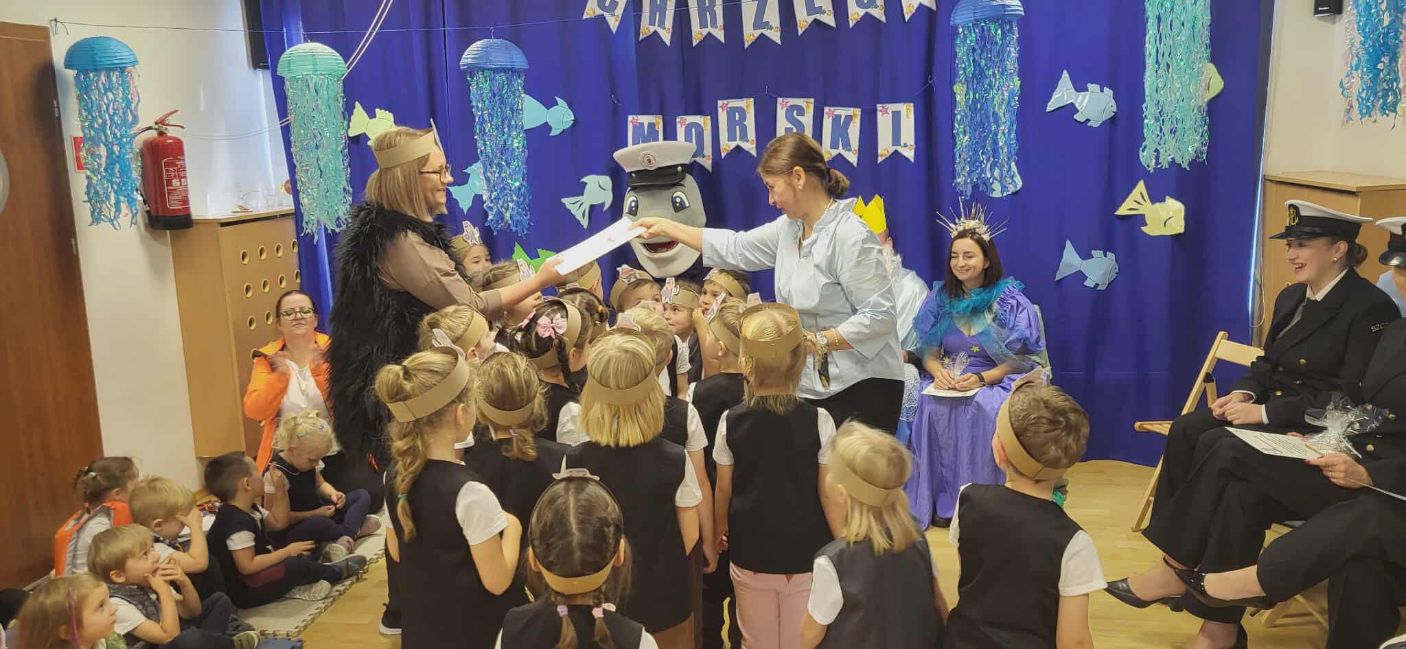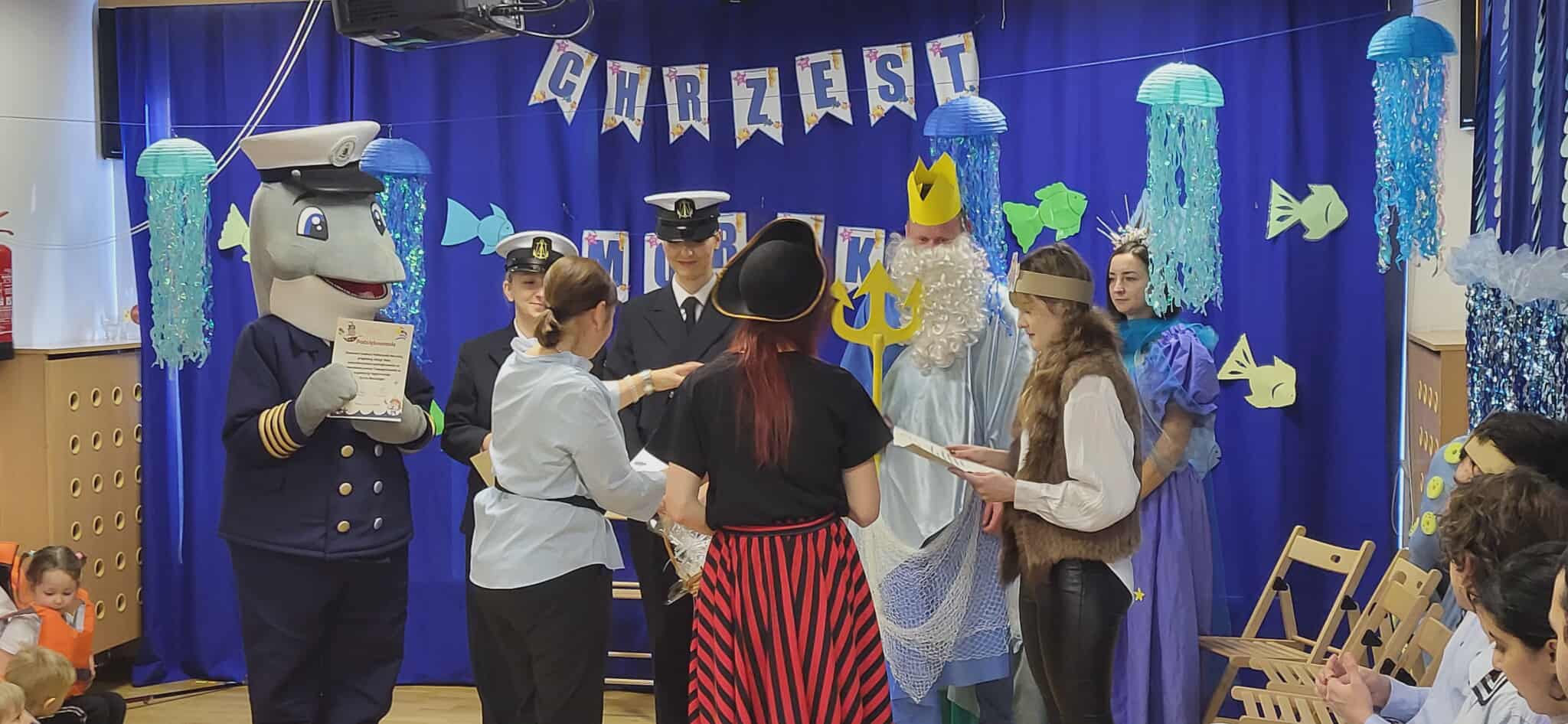 Dzisiaj nasze przedszkole zamieniło się w morski świat. Odwiedzili nas wspaniali goście, którzy uczestniczyli w bardzo ważnym dla nas dniu… Od dziś oficjalnie zostaliśmy Wikingami. Ale żeby zostać prawdziwym Wikingiem trzeba było wykazać się wiedzą, siłą i odwagą. Każdy Wiking doskonale poradził sobie z zadaniami, które mieliśmy do wykonania. Naszym zmaganiom uważnie przyglądał się sam władca mórz i oceanów Neptun razem z Prozerpiną. Na naszej uroczystości pojawił się również zaprzyjaźniony Morświn z Politechniki Morskiej, który jak tylko usłyszał o słonej wodzie to postanowił, że nie może go zabraknąć. Dzisiaj też swój chrzest przeszli nasi wolontariusze, którzy rownież poradzili sobie z zadaniami. To był cudowny dzień. Dziękujemy bardzo naszym kochanym rodzicom Stasia F., którzy poświęcili swój czas i zaangażowali się w organizację uroczystości. 🙂