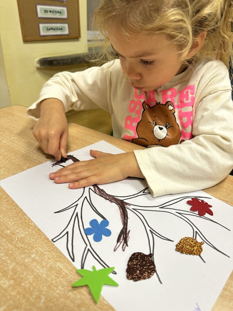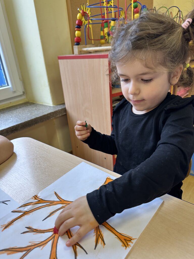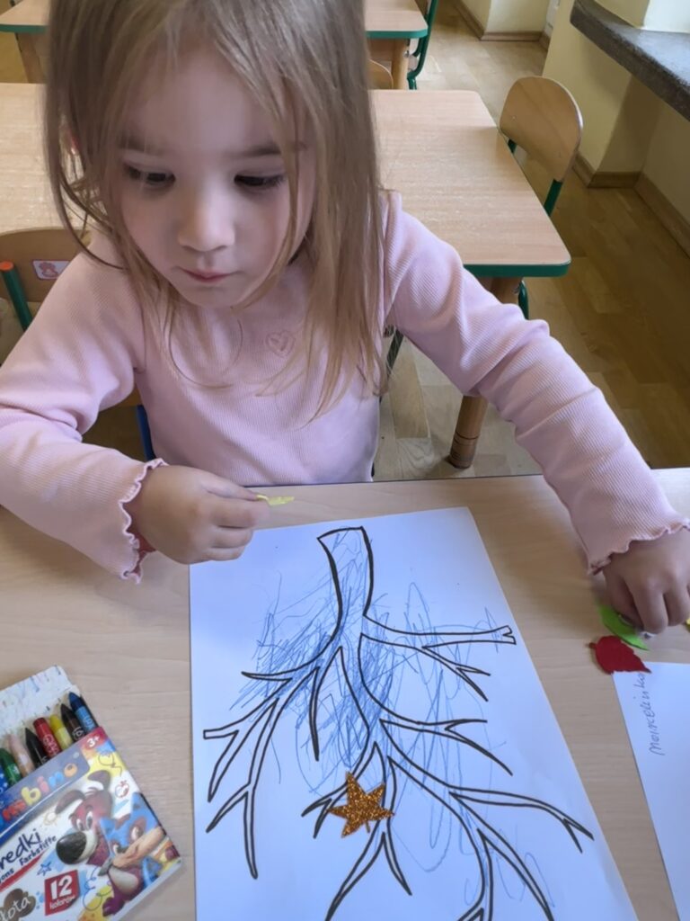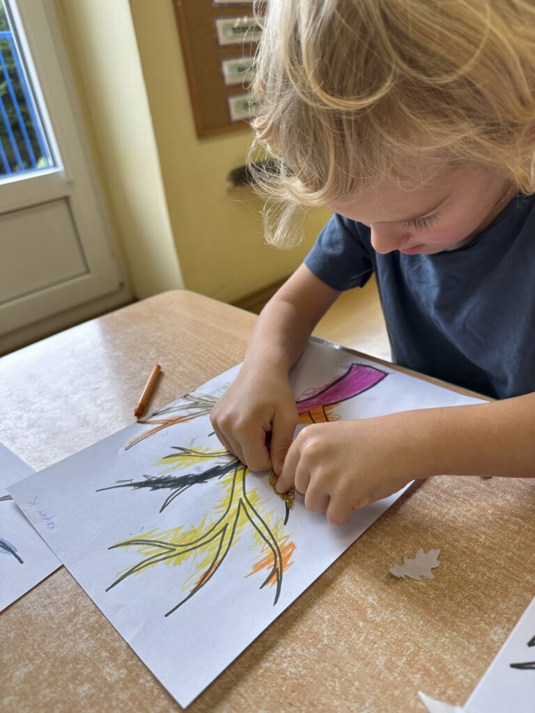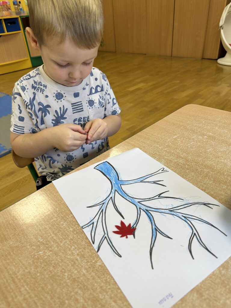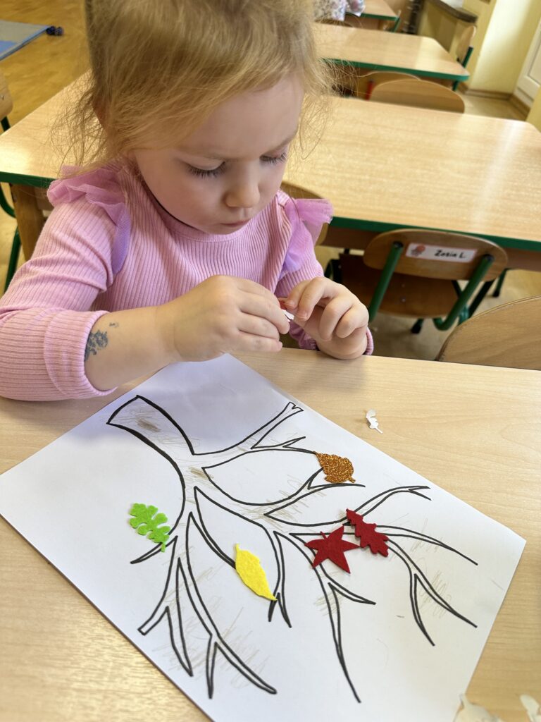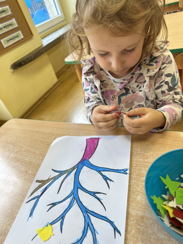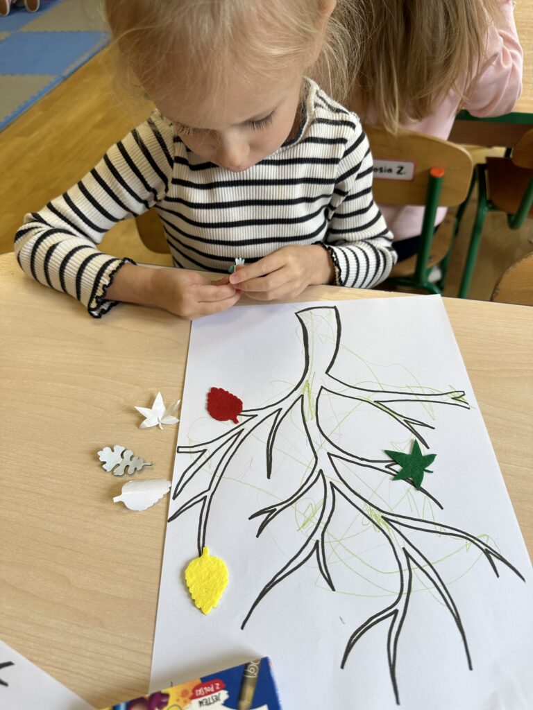 10 października w naszej grupie obchodziliśmy Dzień Drzewa. Z tej okazji wybraliśmy się na spacer na Wały Chrobrego. W okolicy znajduje się wiele drzew, które bacznie obserwowaliśmy. Dowiedzieliśmy się jaka jest budowa drzewa. Dostrzegaliśmy różne jego części: pień, korzenie, gałęzie i liście. Uczyliśmy się także nazw poszczególnych drzew. Na koniec wykonaliśmy pracę plastyczną, dzięki której ćwiczyliśmy sprawność naszych paluszków.