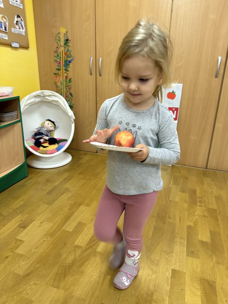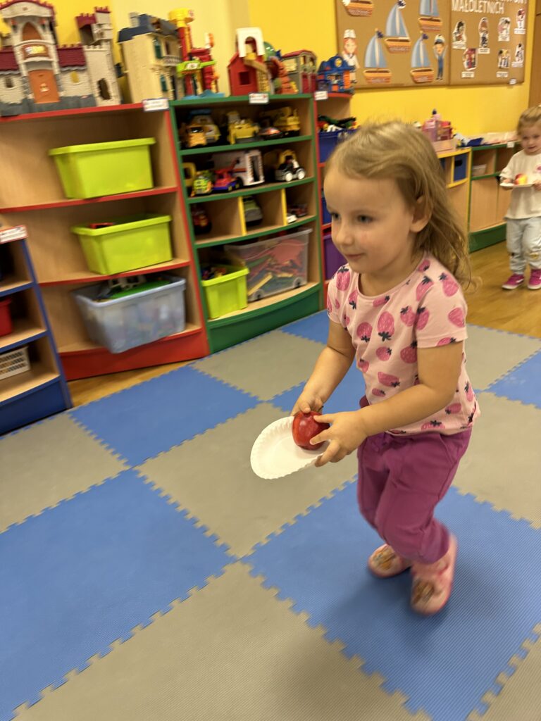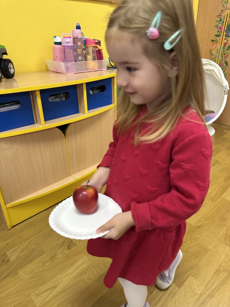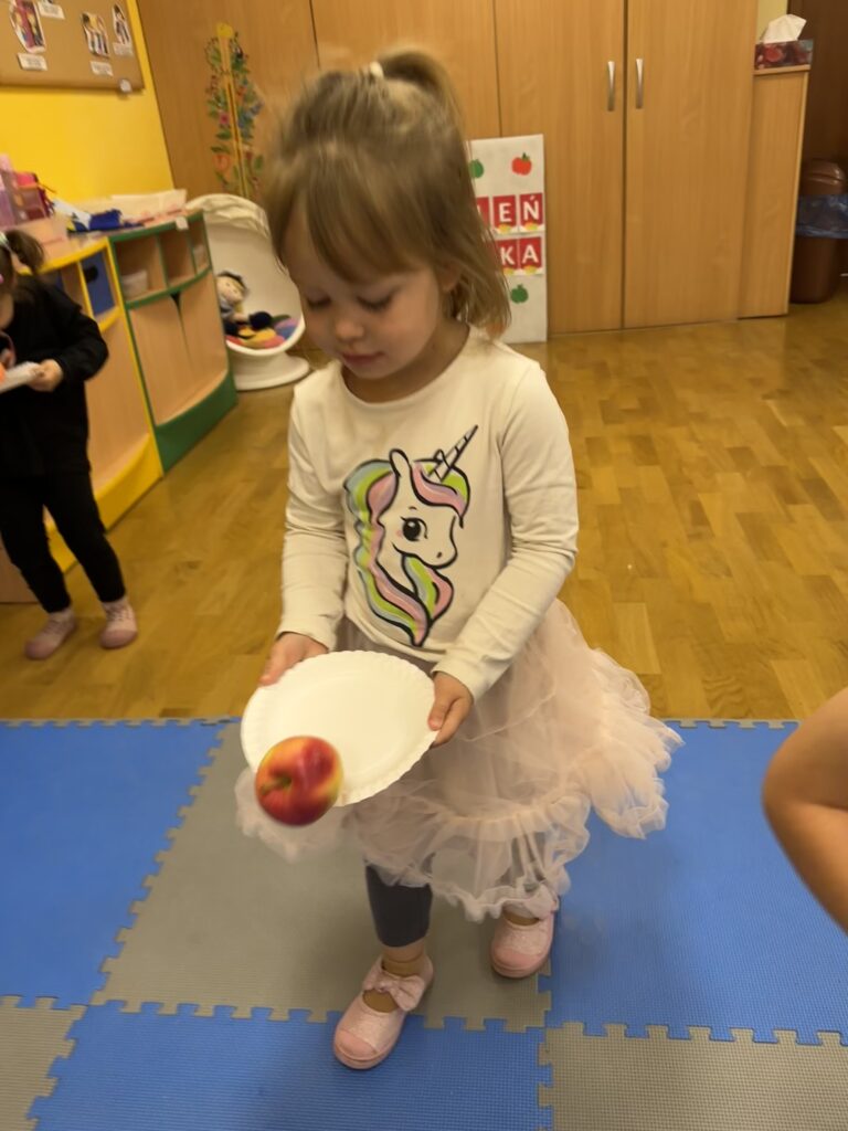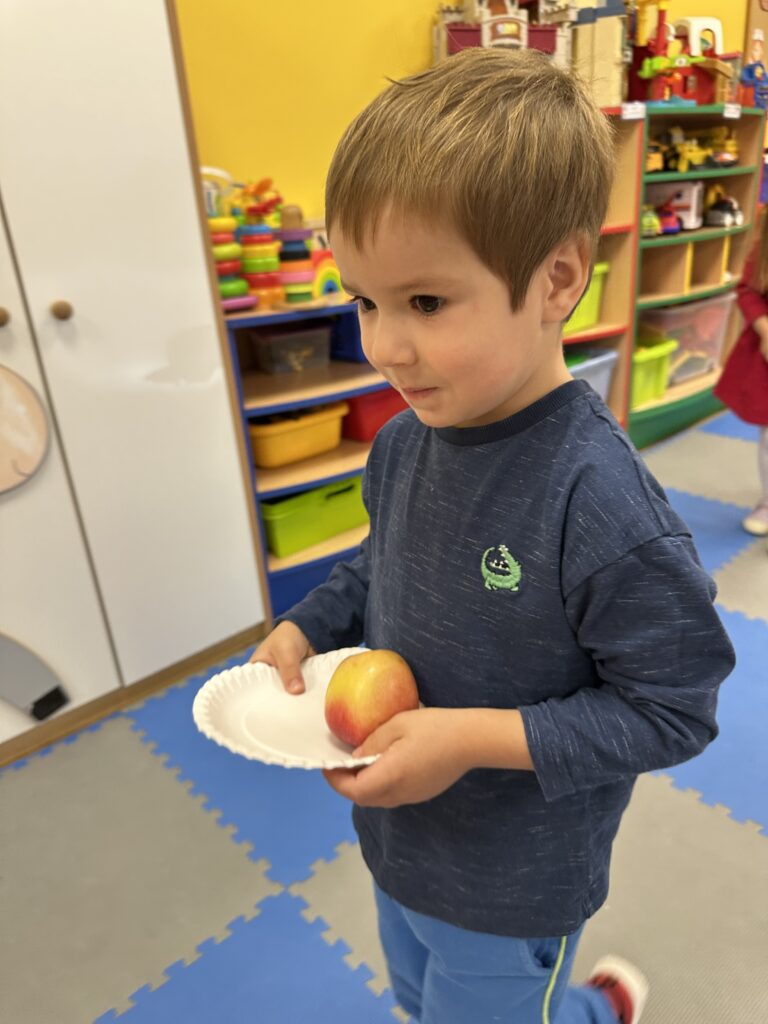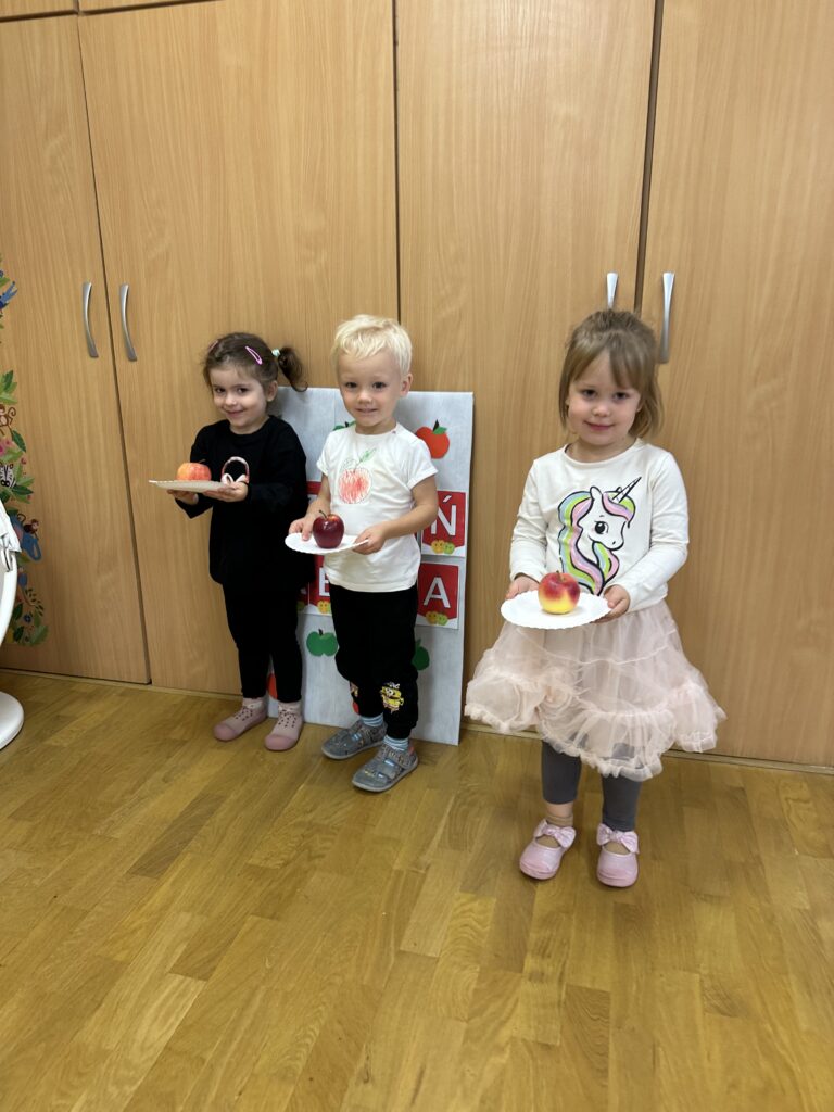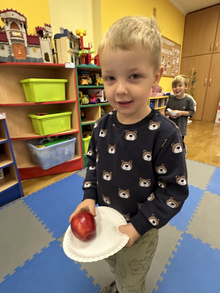 Dzień Jabłka w naszej grupie był pełen różnorodnych atrakcji. Na sam początek zobaczyliśmy, że jabłka mogą mieć różne kolory. Po przekrojeniu ich dowiedzieliśmy się, że w środku wszystkie z nich są takie same, a na dodatek mają pestki. Każdy z nas skosztował jabłuszko i określił jego smak. Większość była naprawdę słodziutka. Mieliśmy także okazję wziąć udział w wyścigu jabłek. Każdy z nas musiał utrzymać je na talerzyku tak, aby nie spadło. Wcale nie było to takie łatwe 🙂 Udało nam się też wykleić jabłko plasteliną, tworząc pracę, którą zabraliśmy do domu. Bawiliśmy się naprawdę super.