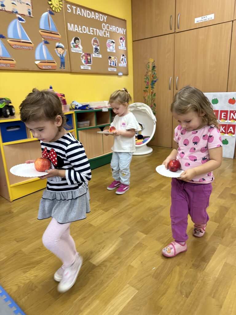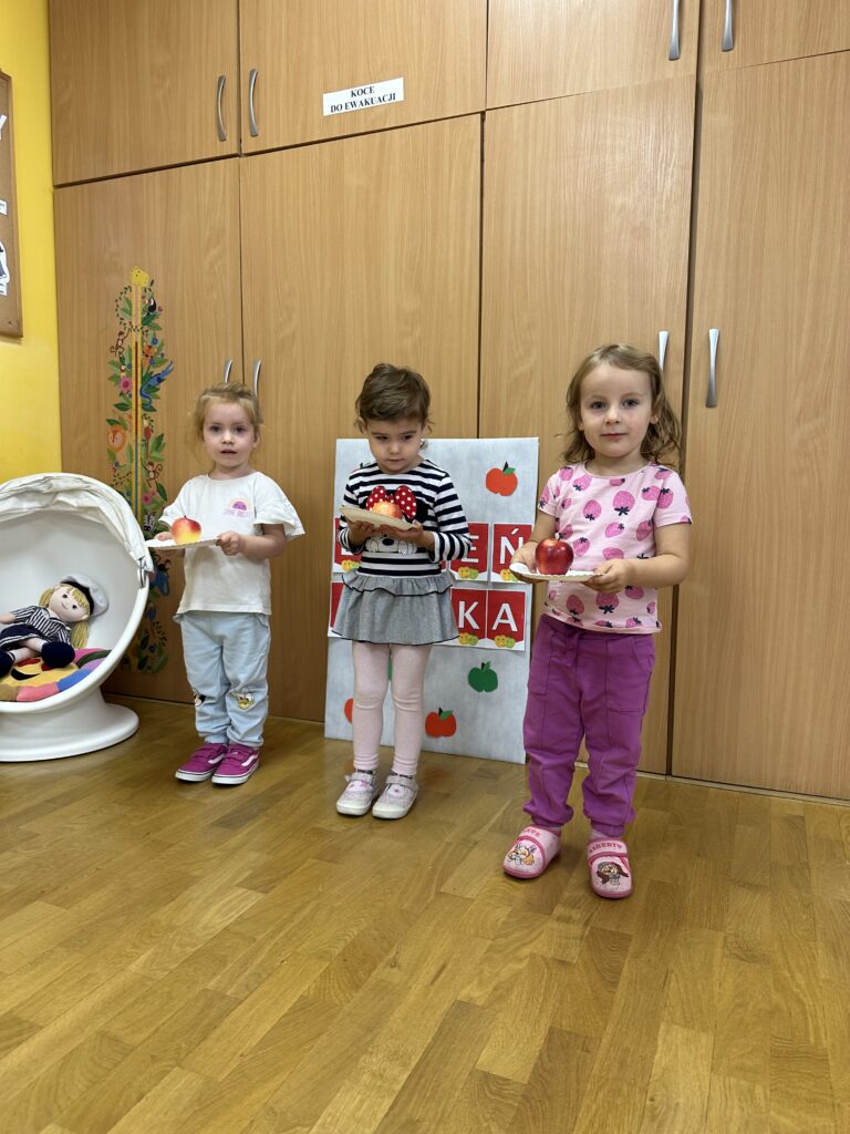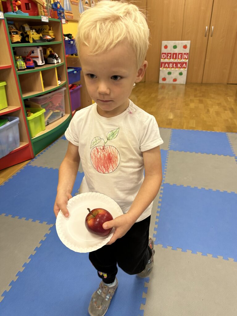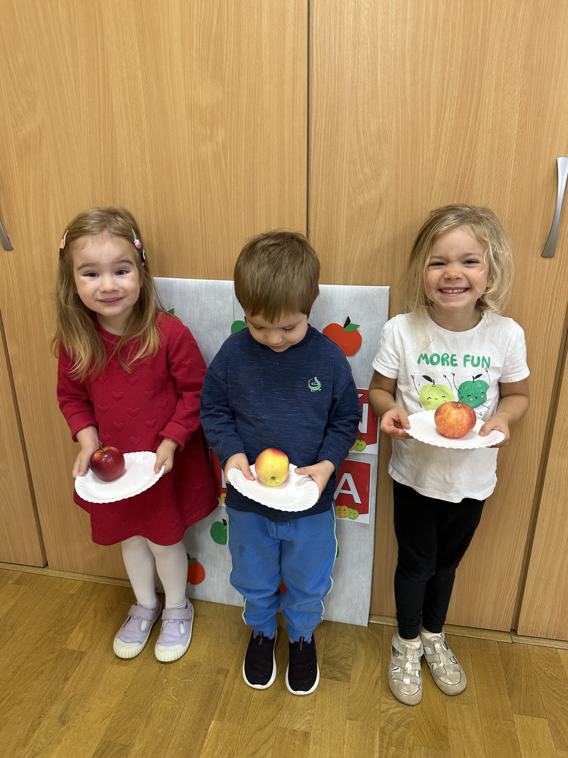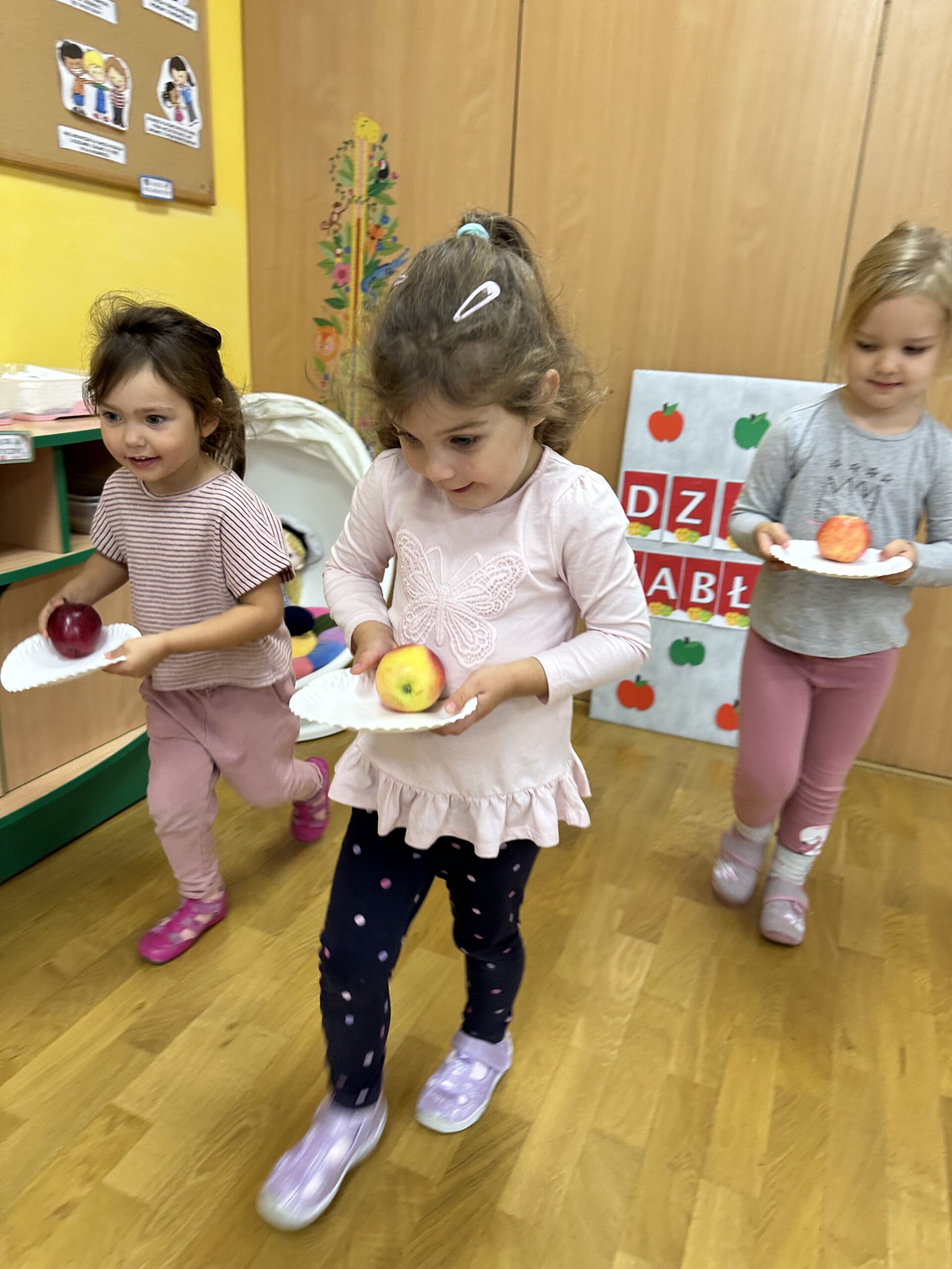 Dzień Jabłka w naszej grupie był pełen różnorodnych atrakcji. Na sam początek zobaczyliśmy, że jabłka mogą mieć różne kolory. Po przekrojeniu ich dowiedzieliśmy się, że w środku wszystkie z nich są takie same, a na dodatek mają pestki. Każdy z nas skosztował jabłuszko i określił jego smak. Większość była naprawdę słodziutka. Mieliśmy także okazję wziąć udział w wyścigu jabłek. Każdy z nas musiał utrzymać je na talerzyku tak, aby nie spadło. Wcale nie było to takie łatwe 🙂 Udało nam się też wykleić jabłko plasteliną, tworząc pracę, którą zabraliśmy do domu. Bawiliśmy się naprawdę super.