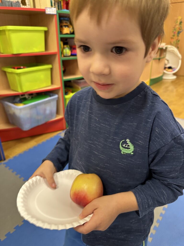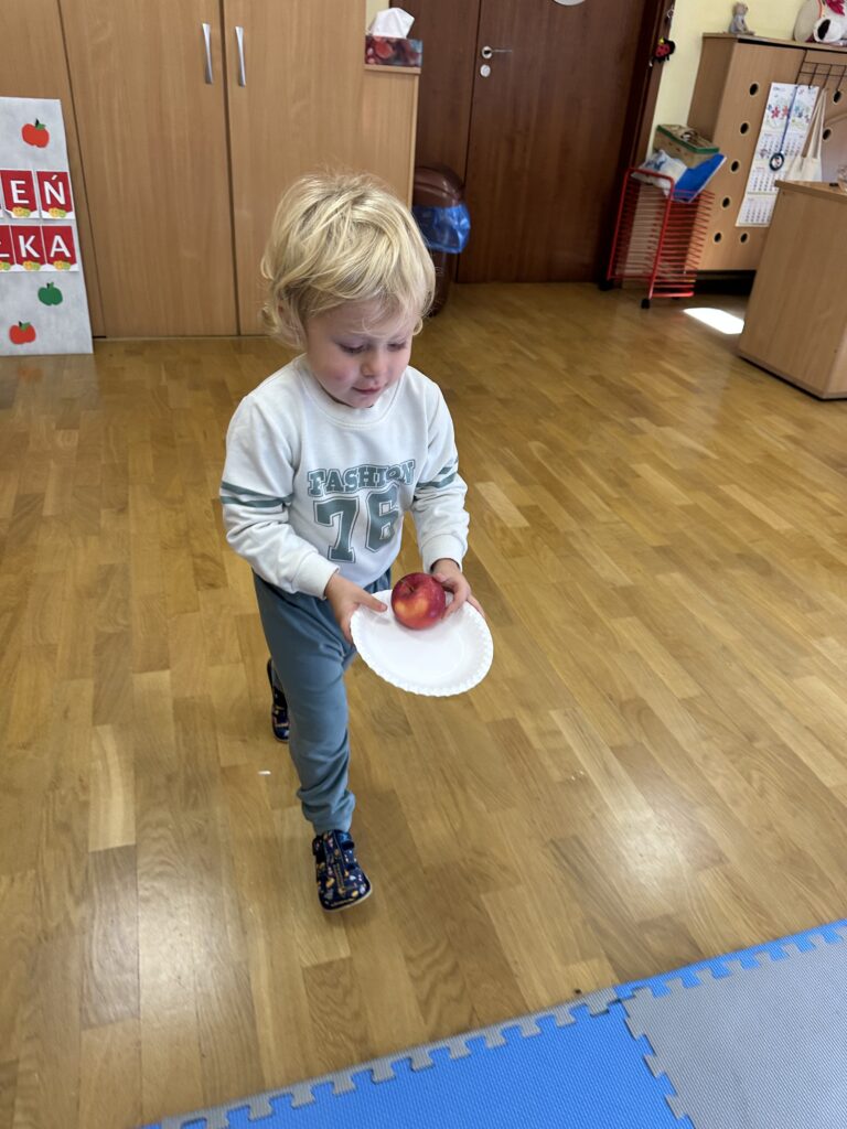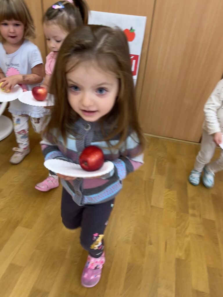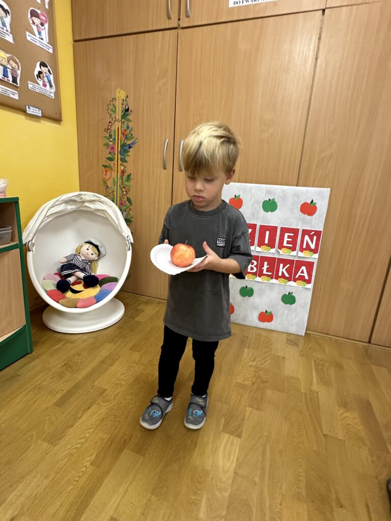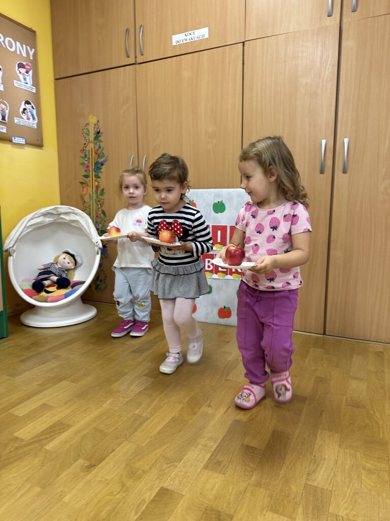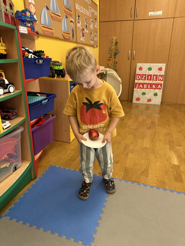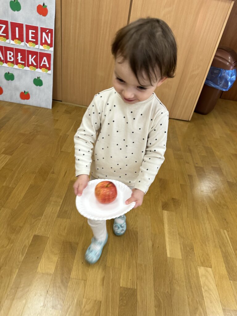 Dzień Jabłka w naszej grupie był pełen różnorodnych atrakcji. Na sam początek zobaczyliśmy, że jabłka mogą mieć różne kolory. Po przekrojeniu ich dowiedzieliśmy się, że w środku wszystkie z nich są takie same, a na dodatek mają pestki. Każdy z nas skosztował jabłuszko i określił jego smak. Większość była naprawdę słodziutka. Mieliśmy także okazję wziąć udział w wyścigu jabłek. Każdy z nas musiał utrzymać je na talerzyku tak, aby nie spadło. Wcale nie było to takie łatwe 🙂 Udało nam się też wykleić jabłko plasteliną, tworząc pracę, którą zabraliśmy do domu. Bawiliśmy się naprawdę super.