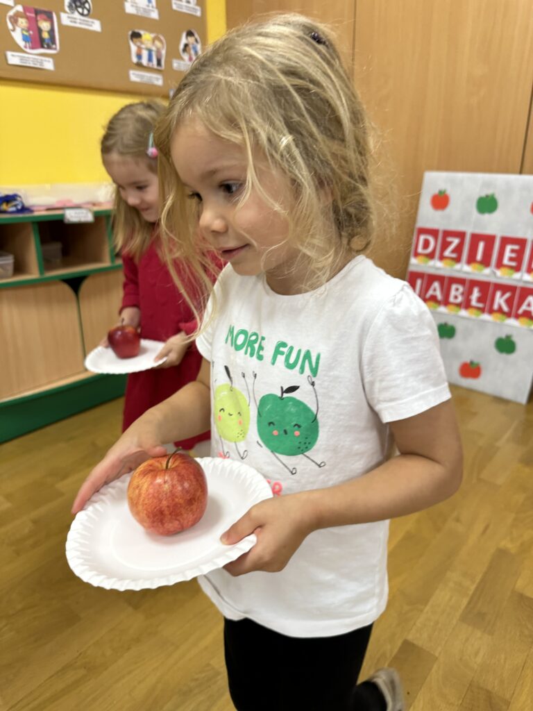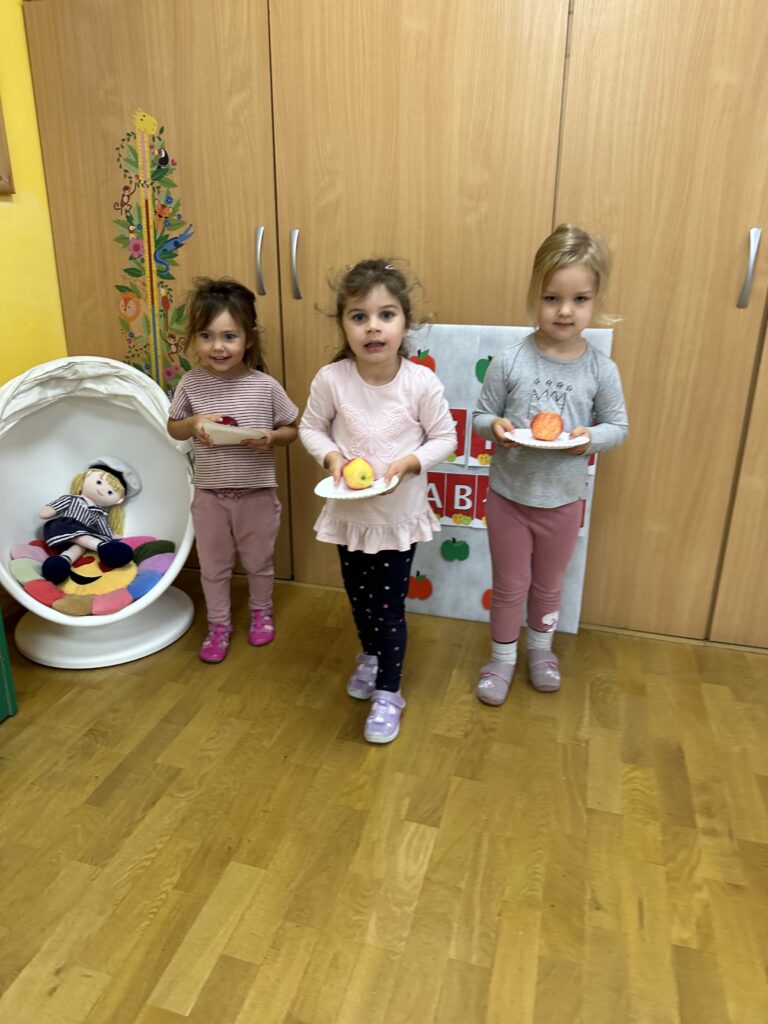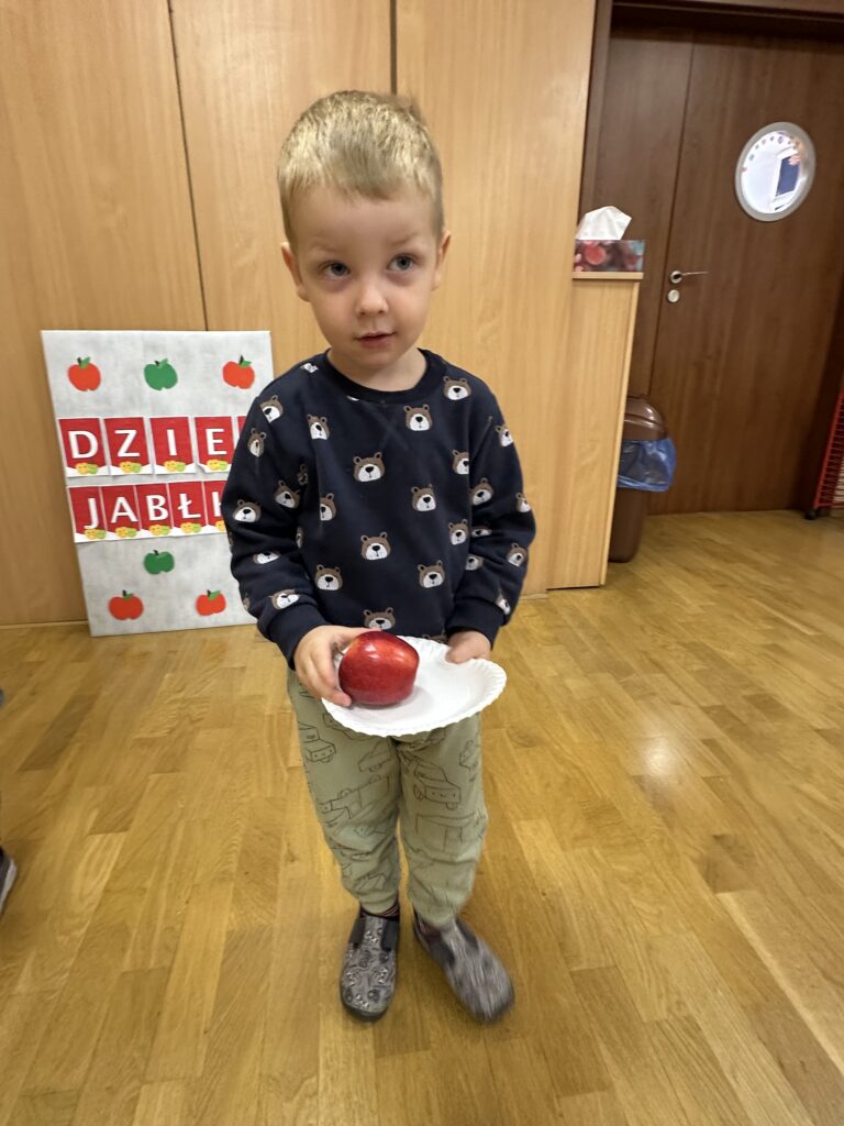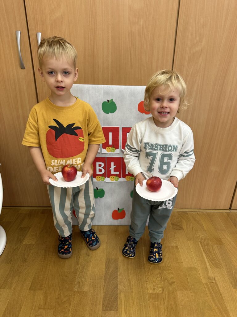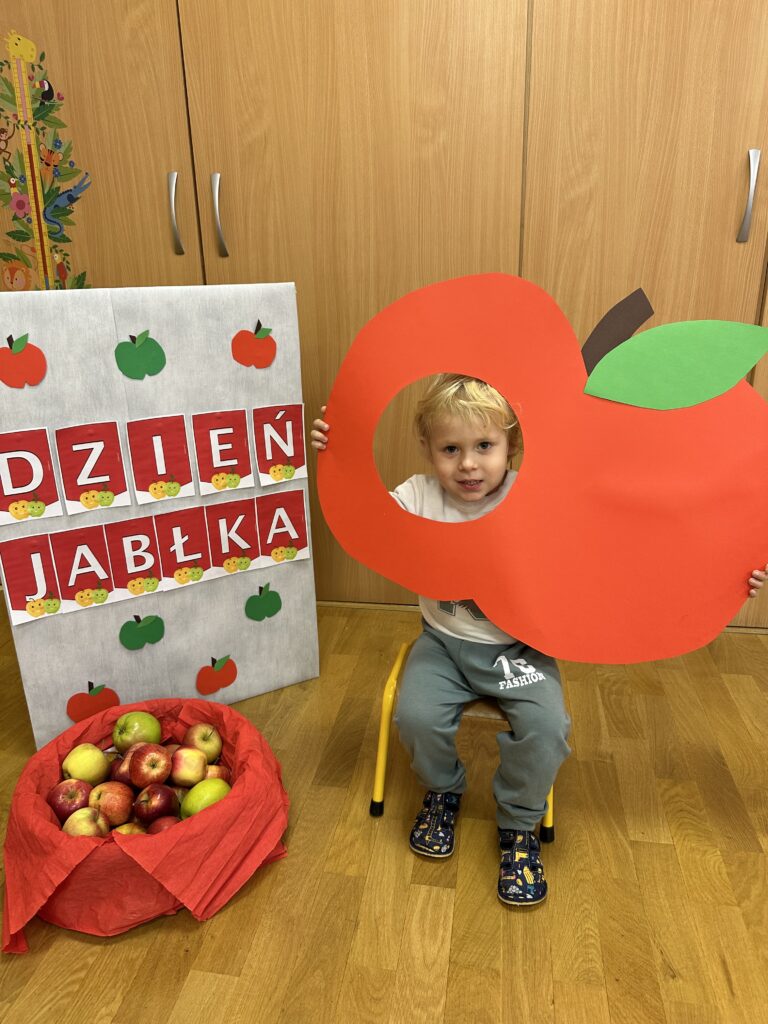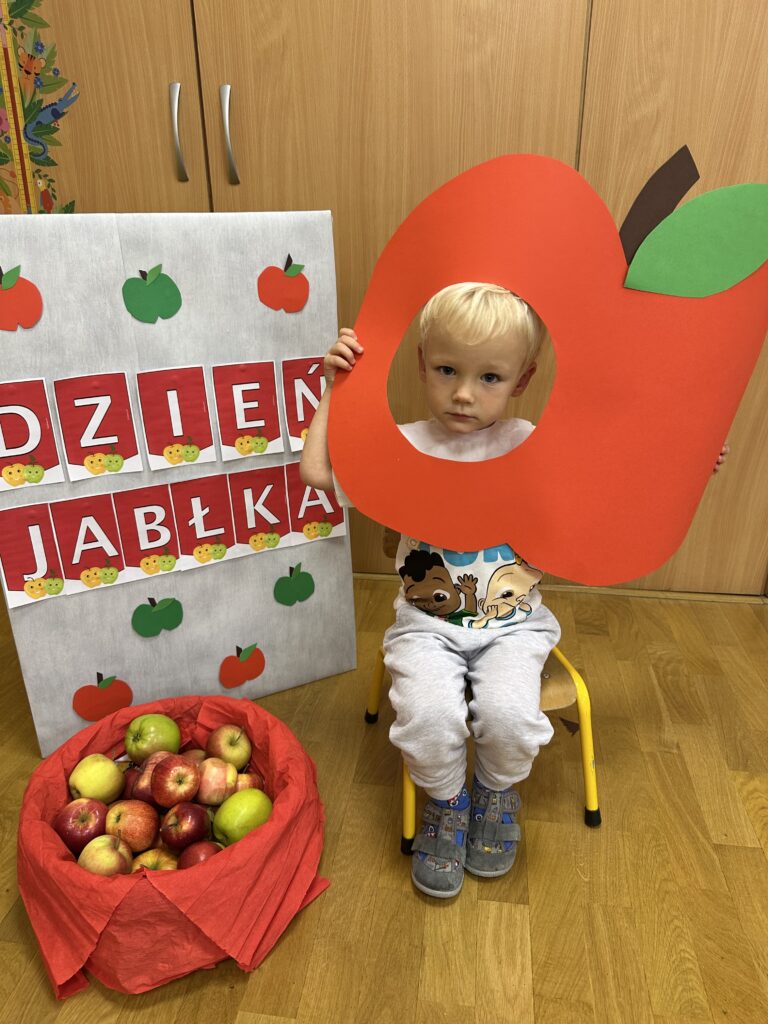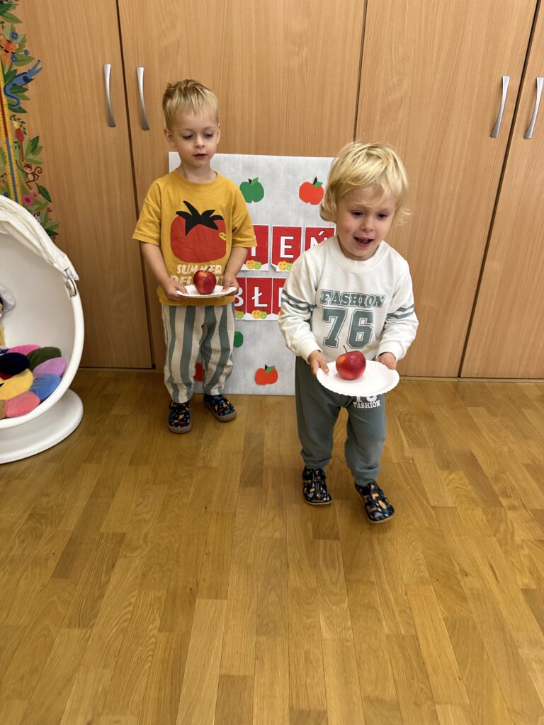 Dzień Jabłka w naszej grupie był pełen różnorodnych atrakcji. Na sam początek zobaczyliśmy, że jabłka mogą mieć różne kolory. Po przekrojeniu ich dowiedzieliśmy się, że w środku wszystkie z nich są takie same, a na dodatek mają pestki. Każdy z nas skosztował jabłuszko i określił jego smak. Większość była naprawdę słodziutka. Mieliśmy także okazję wziąć udział w wyścigu jabłek. Każdy z nas musiał utrzymać je na talerzyku tak, aby nie spadło. Wcale nie było to takie łatwe 🙂 Udało nam się też wykleić jabłko plasteliną, tworząc pracę, którą zabraliśmy do domu. Bawiliśmy się naprawdę super.