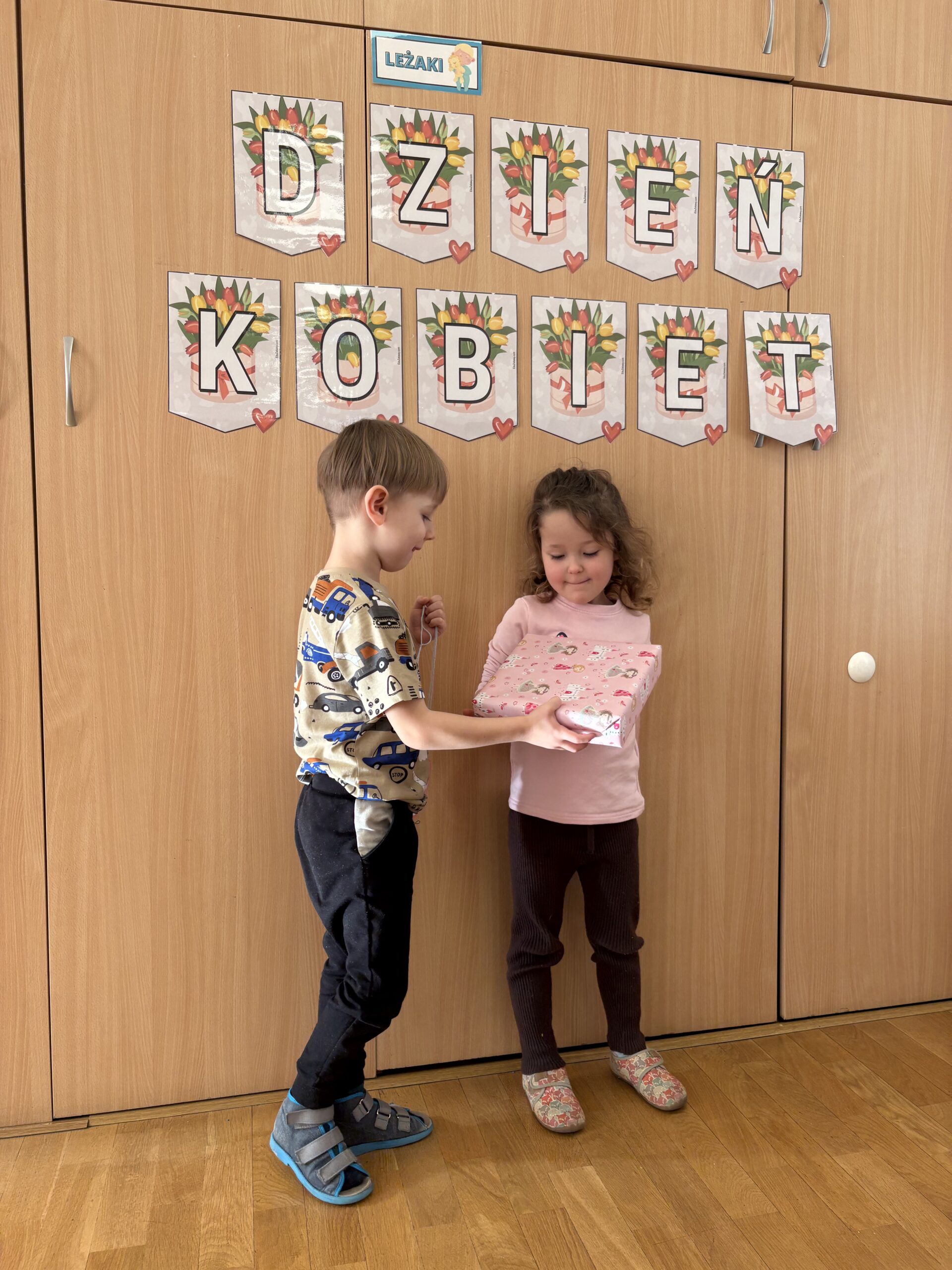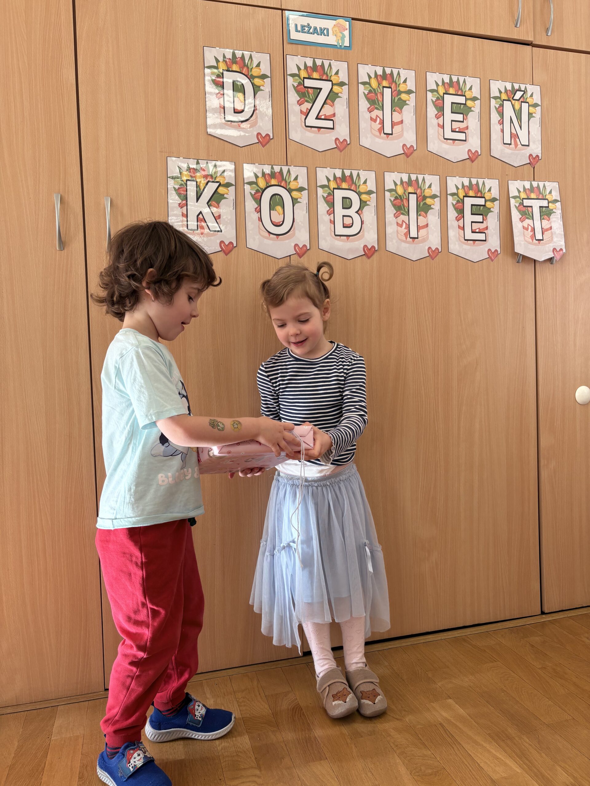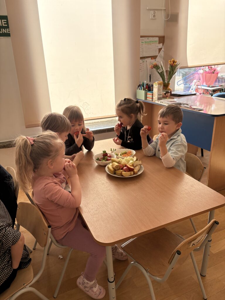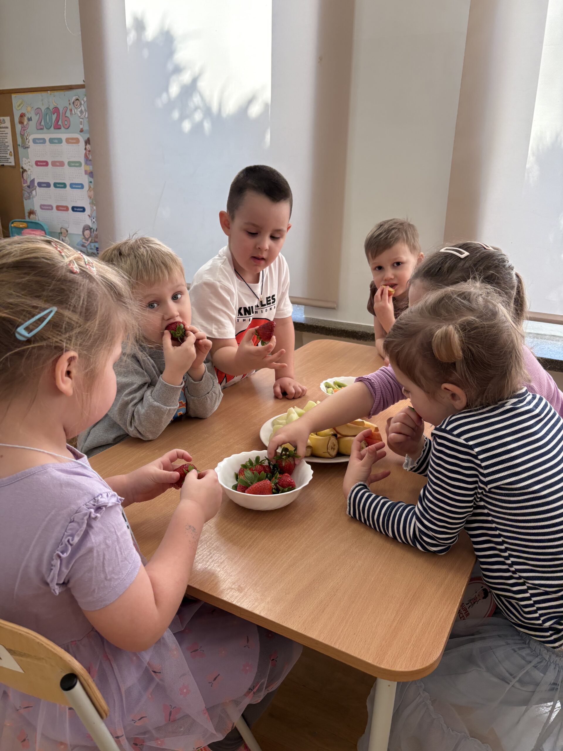 Chłopcy z dużym zaangażowaniem wręczyli koleżankom upominki oraz pamiątkowe medale, składając im serdeczne życzenia. Na zakończenie wszyscy wspólnie świętowaliśmy przy zdrowym poczęstunku – na dzieci czekały pyszne i kolorowe owoce.