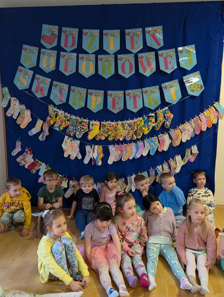Na znak solidarności i akceptacji dzieci założyły dwie różne, kolorowe skarpetki. Rozmawialiśmy o tym, że każdy z nas jest inny, wyjątkowy i tak samo ważny. To był dobry moment, okaby uczyć dzieci empatii, szacunku i otwartości na innych.Dziękujemy wszystkim za zaangażowanie i włączenie się w tę piękną akcję. Razem uczymy dzieci, że różnorodność jest czymś pięknym i wartościowym.