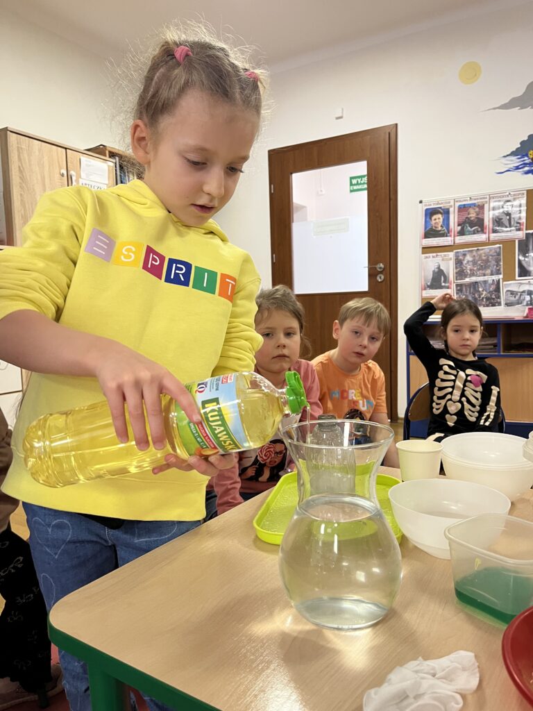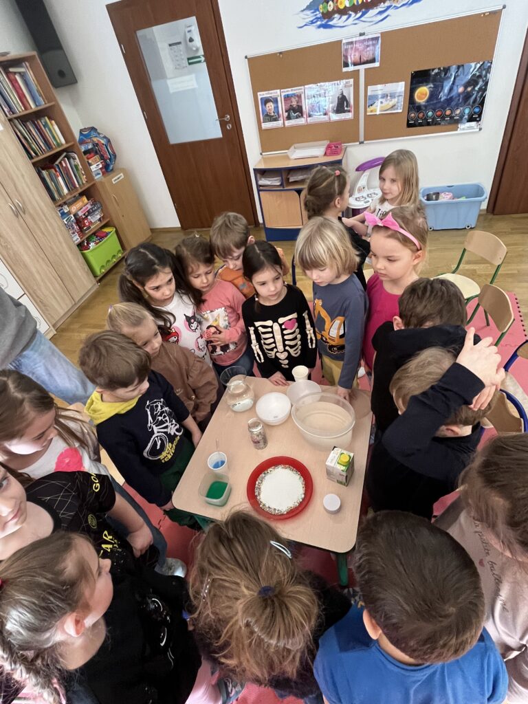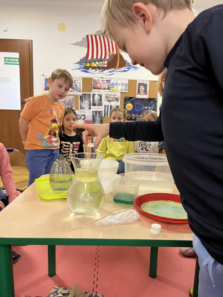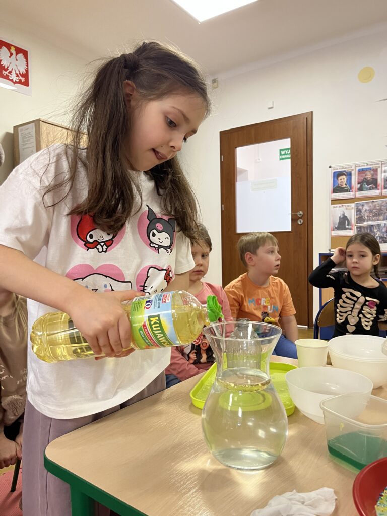 Kolejną inspirującą postacią była Maria Skłodowska-Curie. Przedszkolaki dowiedziały się, że odkryła dwa pierwiastki i stworzyła ” Małe Curie”, była dwukrotną laureatką Nagrody Nobla. Wcielając się w małych badaczy, dzieci wykonywały proste i bezpieczne eksperymenty, odkrywając tajemnice nauki poprzez zabawę i doświadczenie.