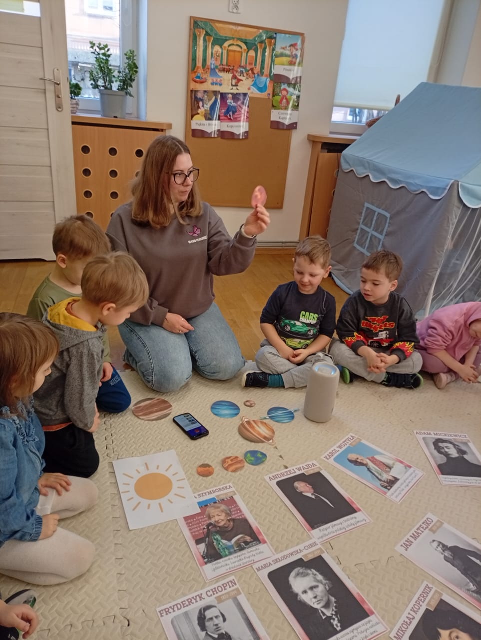Dzieci odkryły też świat muzyki klasycznej dzięki postaci Fryderyk Chopin, poznając kim był i wsłuchując się w fragment jego utworów. Nie zabrakło również fascynującej historii Mikołaja Kopernika, o którym dowiedziały się, że „wstrzymał Słońce, ruszył Ziemię”. Zainspirowane jego odkryciem, samodzielnie stworzyły model Układu Słonecznego, utrwalając kolejność planet.