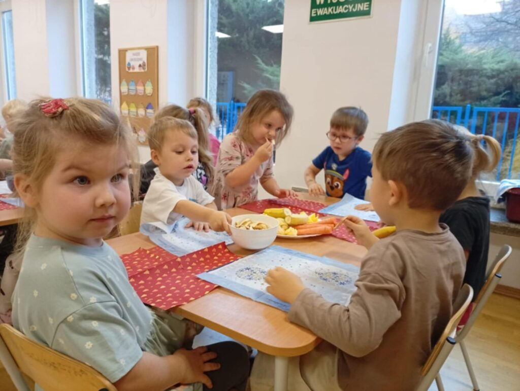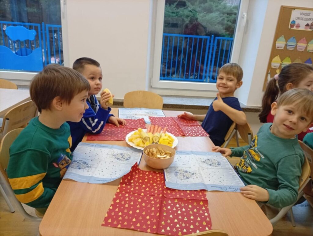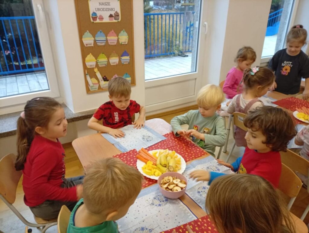 Ten dzień był dla naszej grupy szczególnie wyjątkowy, ponieważ świętowaliśmy także urodziny Zuzi. Dzieci z radością zaśpiewały gromkie „Sto lat”, złożyły koleżance serdeczne życzenia, a następnie wspólnie częstowały się pysznymi owocami przygotowanymi z tej okazji.