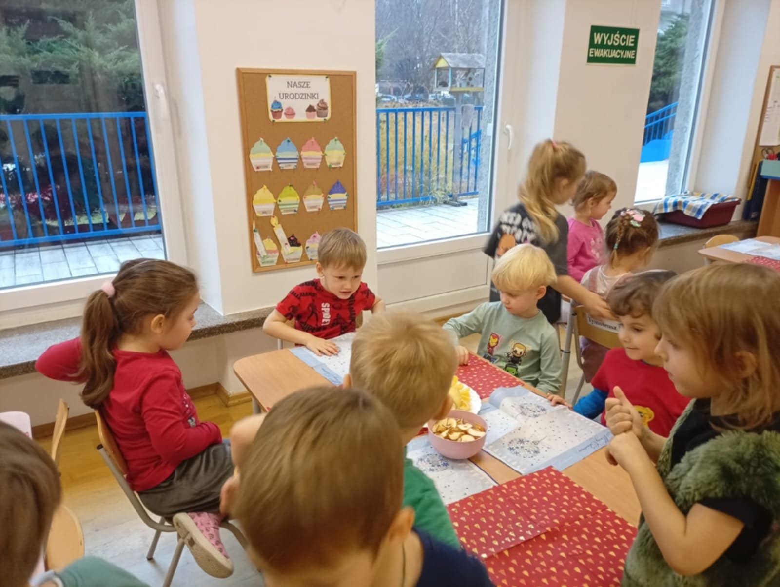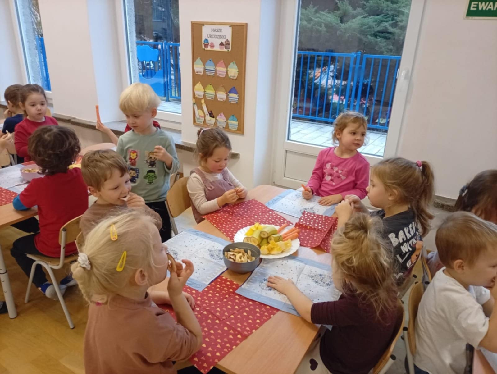Ten dzień był dla naszej grupy szczególnie wyjątkowy, ponieważ świętowaliśmy także urodziny Zuzi. Dzieci z radością zaśpiewały gromkie „Sto lat”, złożyły koleżance serdeczne życzenia, a następnie wspólnie częstowały się pysznymi owocami przygotowanymi z tej okazji.