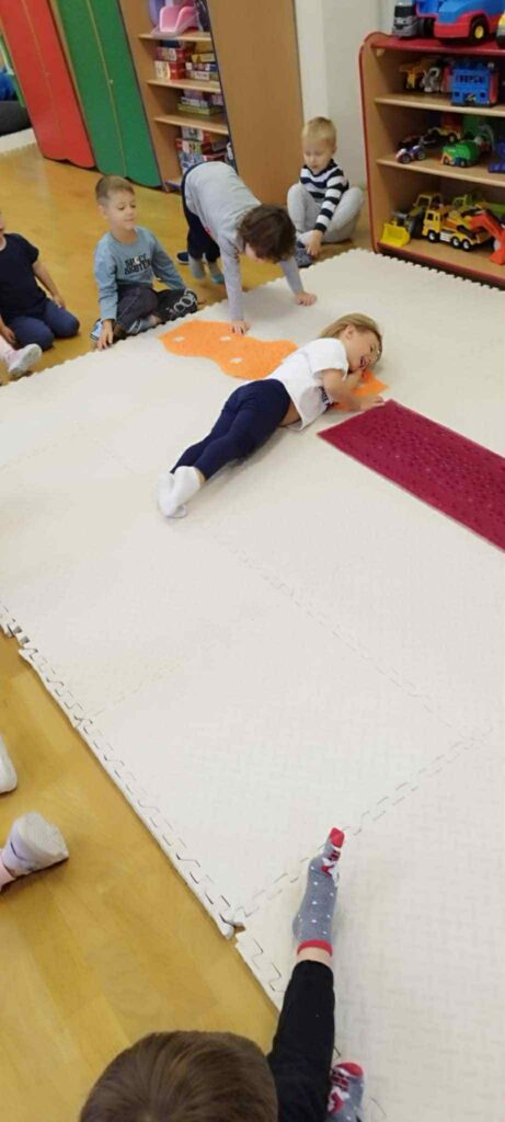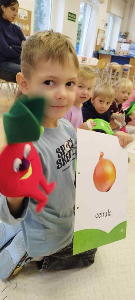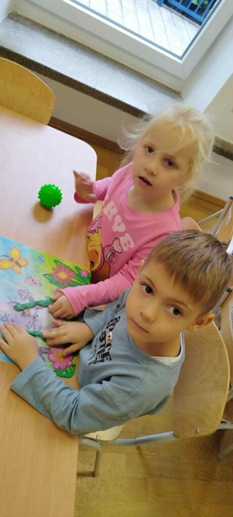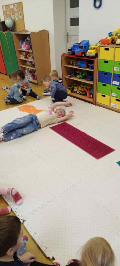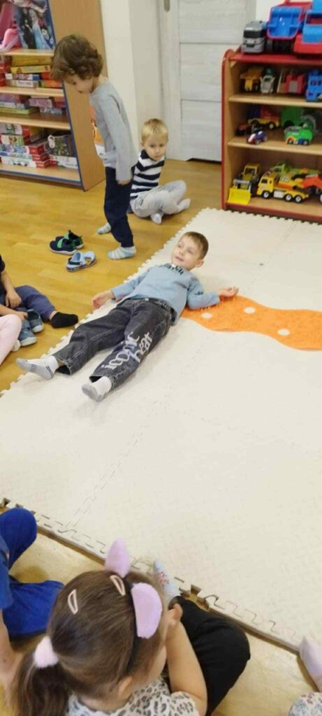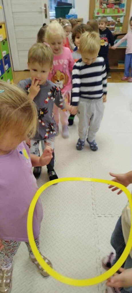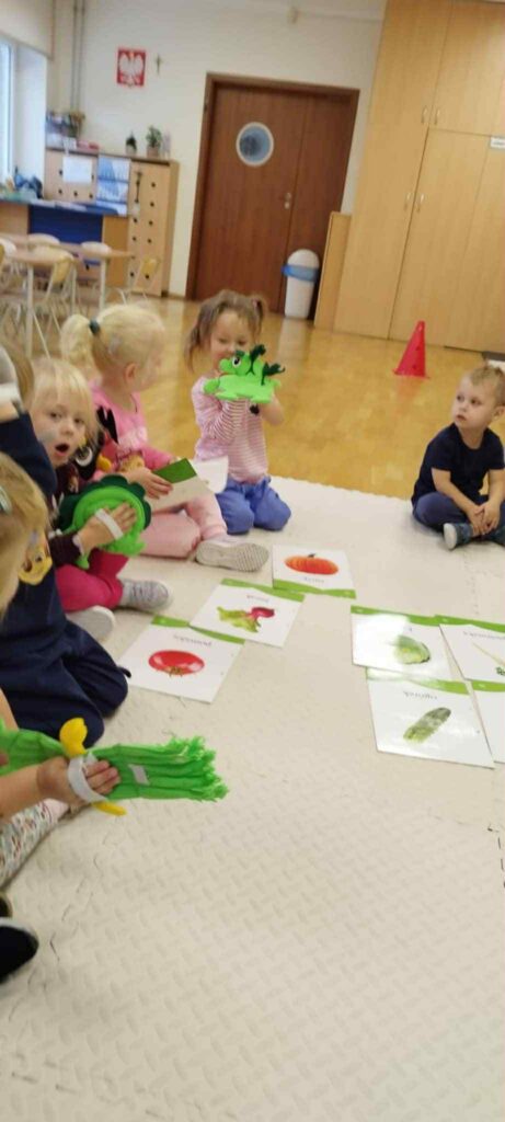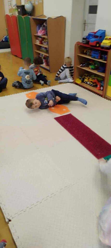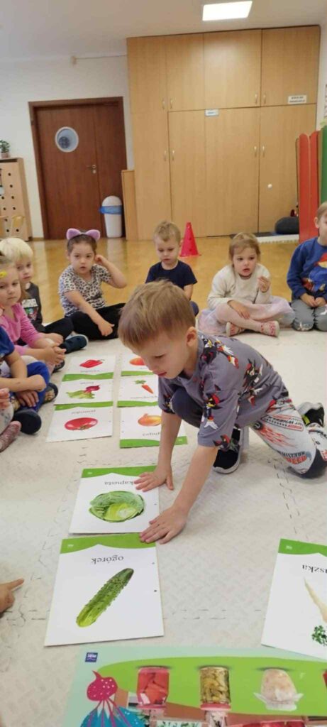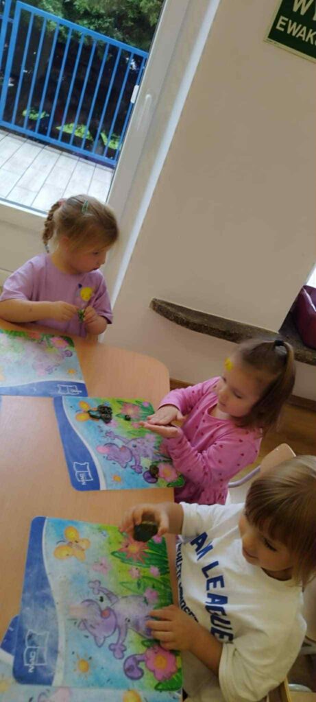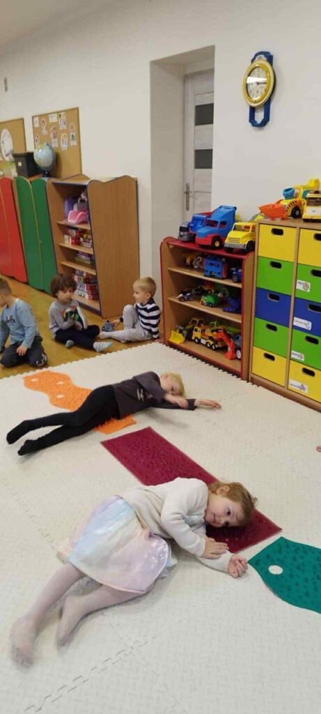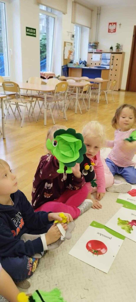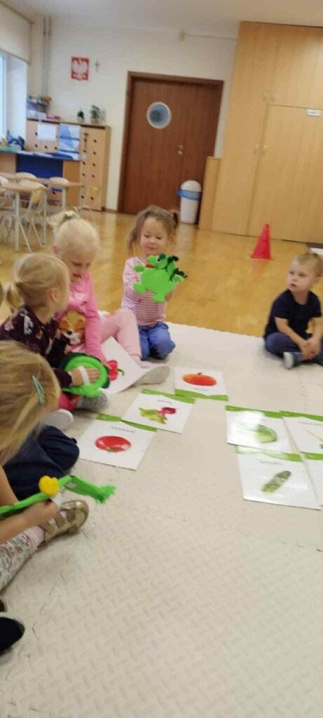 W ,,Rybakach”, przy okazji poznawania warzyw, rozwiązywaliśmy zagadki, dzieliliśmy warzywa według kolorów, następnie spróbowaliśmy zrobić mini przedstawienie inspirowane wierszem Jana Brzechwy ,,Na straganie „. Spróbowaliśmy też swoich sił na ścieżce sensorycznej, co przyniosło nam dużo zabawnych sytuacji, a następnie uczyliśmy się współpracy w parach, przenosząc krążki bez pomocy rąk. Na koniec żeby wyciszyć emocje bawiliśmy się zabawkami sensorycznymi i plasteliną.