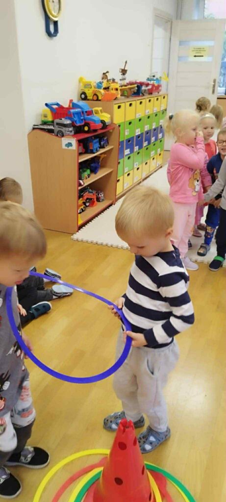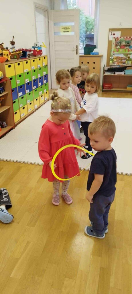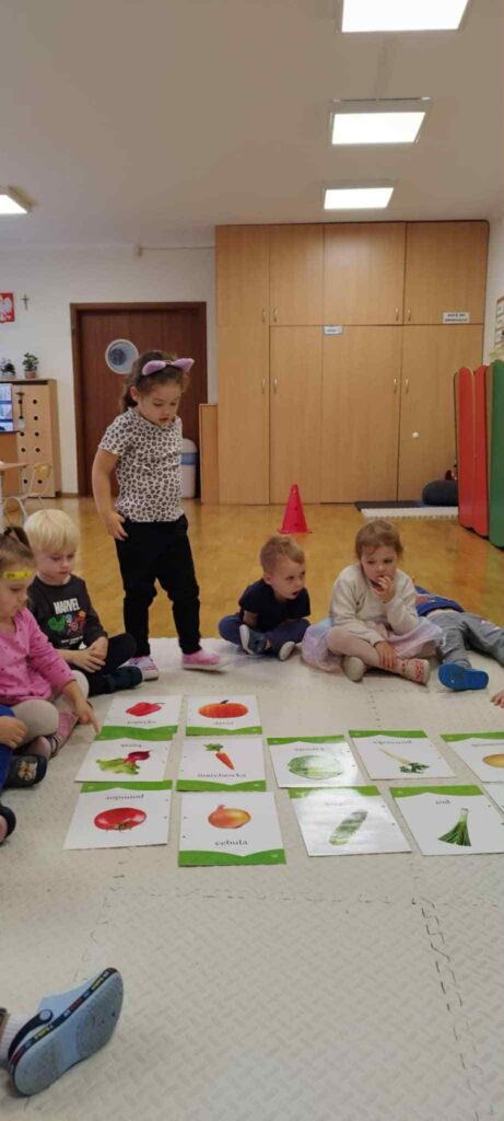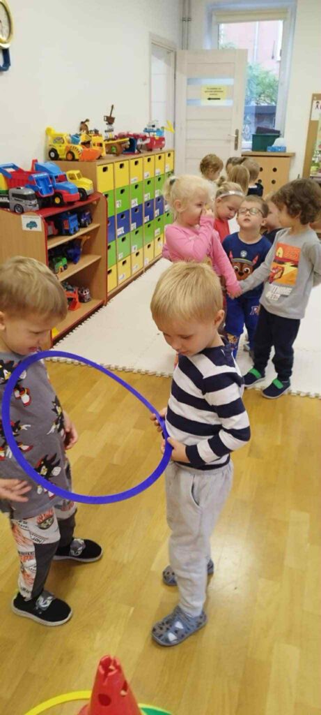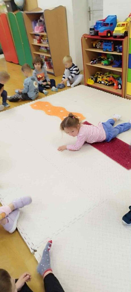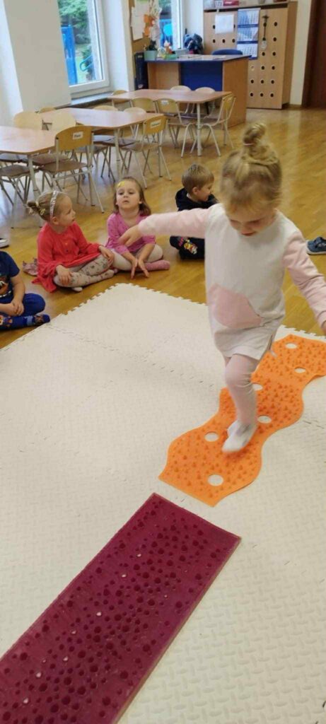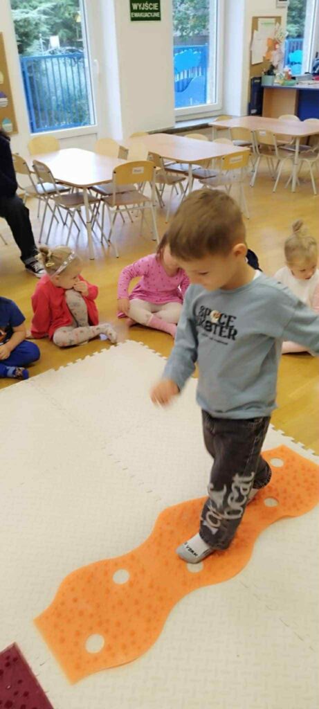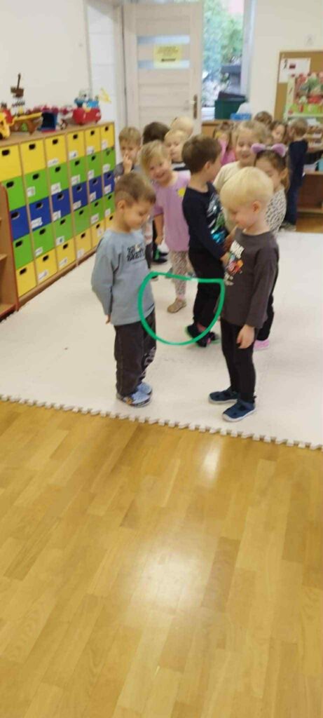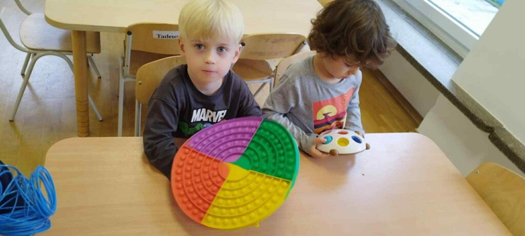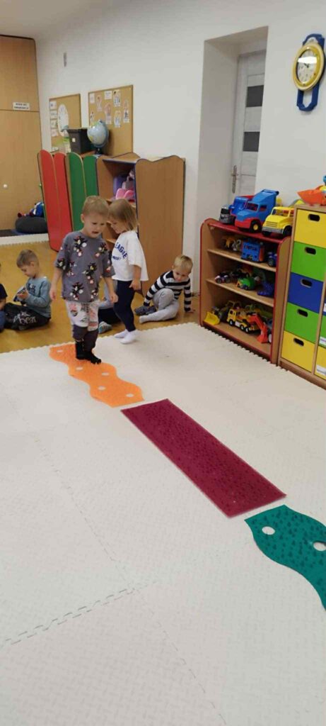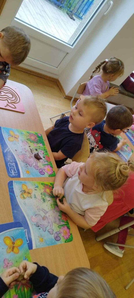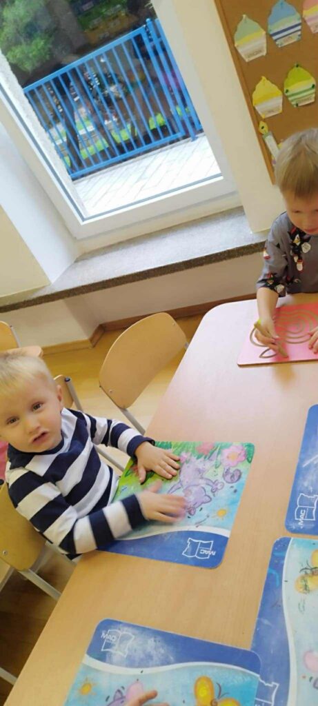 W ,,Rybakach”, przy okazji poznawania warzyw, rozwiązywaliśmy zagadki, dzieliliśmy warzywa według kolorów, następnie spróbowaliśmy zrobić mini przedstawienie inspirowane wierszem Jana Brzechwy ,,Na straganie „. Spróbowaliśmy też swoich sił na ścieżce sensorycznej, co przyniosło nam dużo zabawnych sytuacji, a następnie uczyliśmy się współpracy w parach, przenosząc krążki bez pomocy rąk. Na koniec żeby wyciszyć emocje bawiliśmy się zabawkami sensorycznymi i plasteliną.