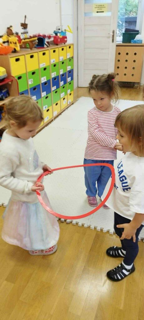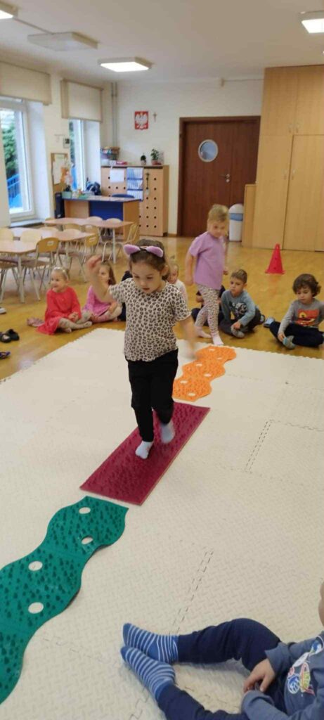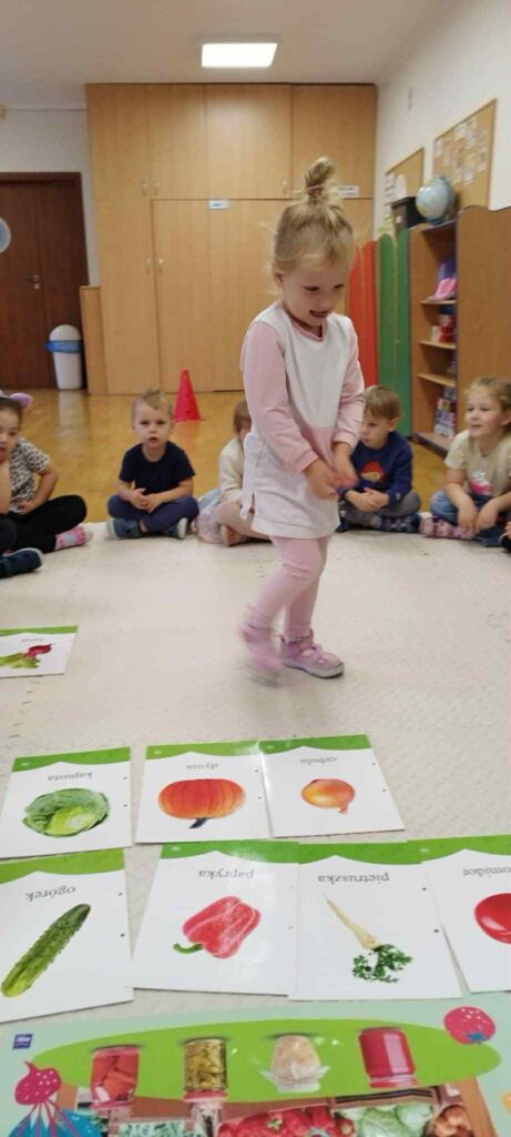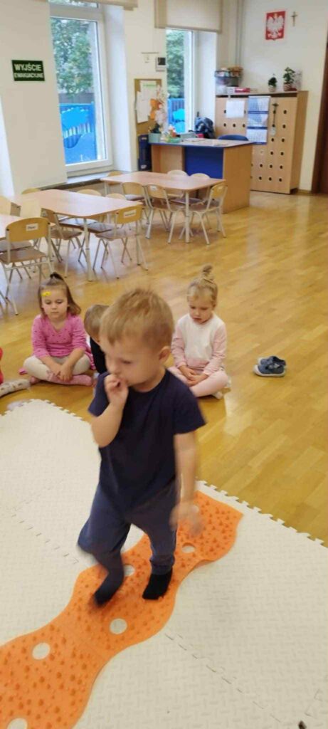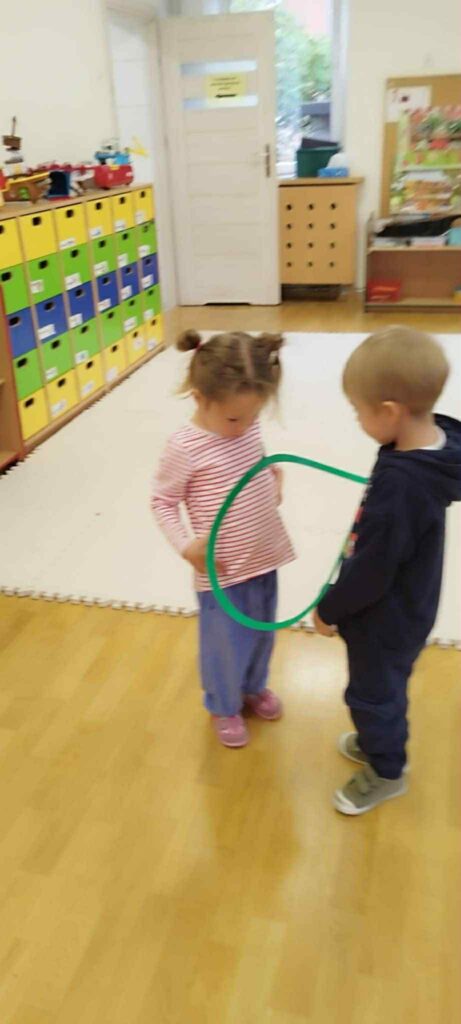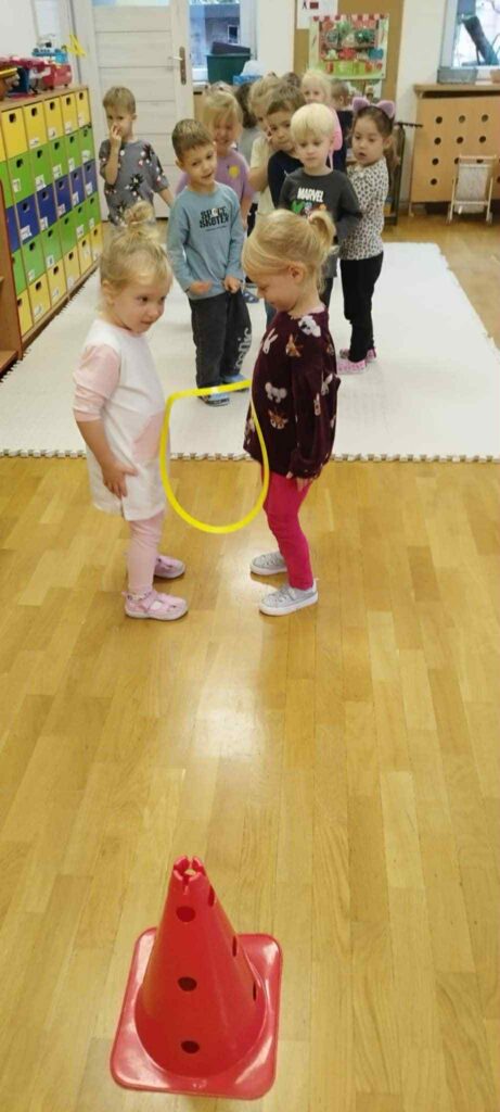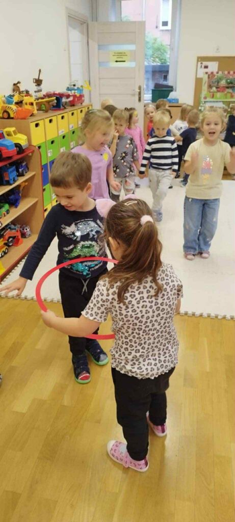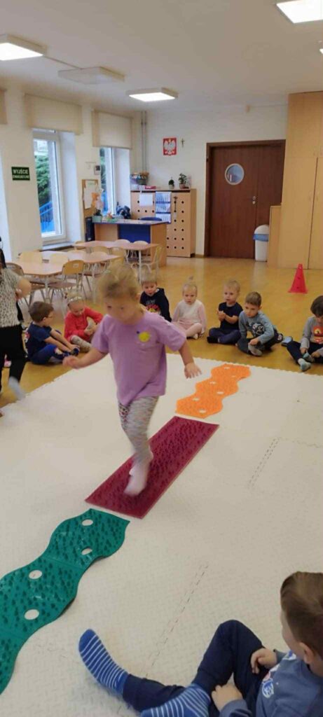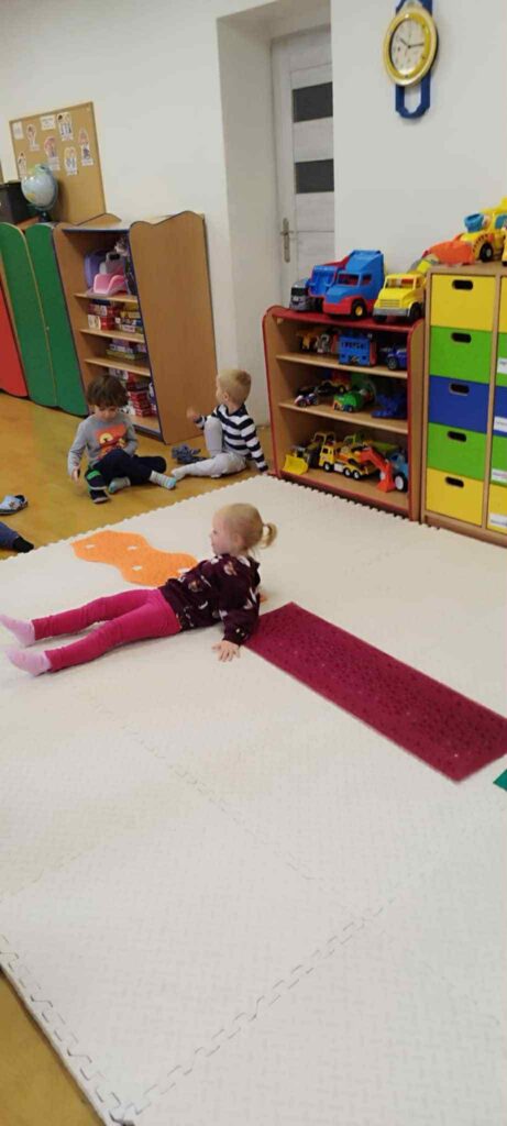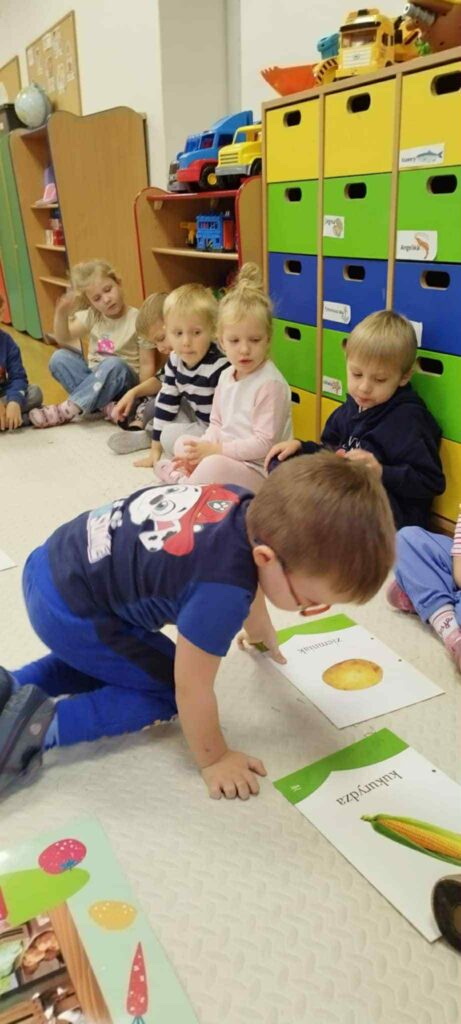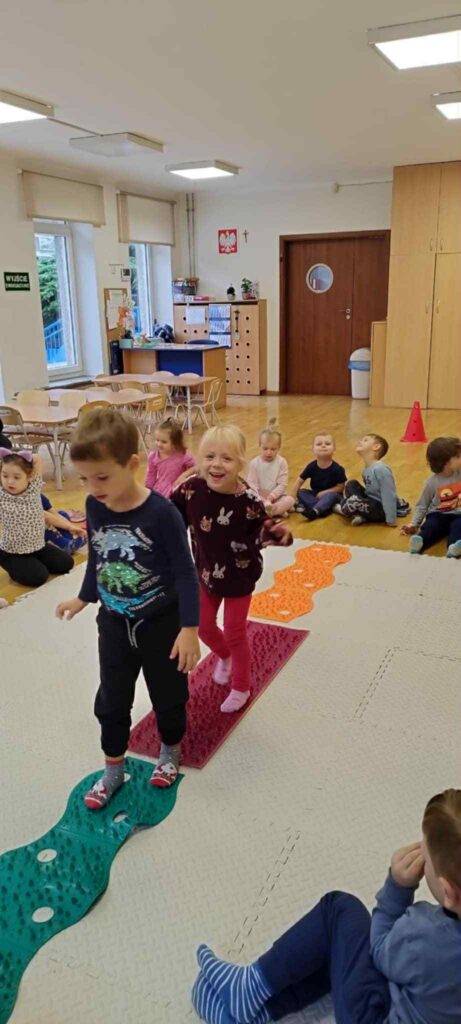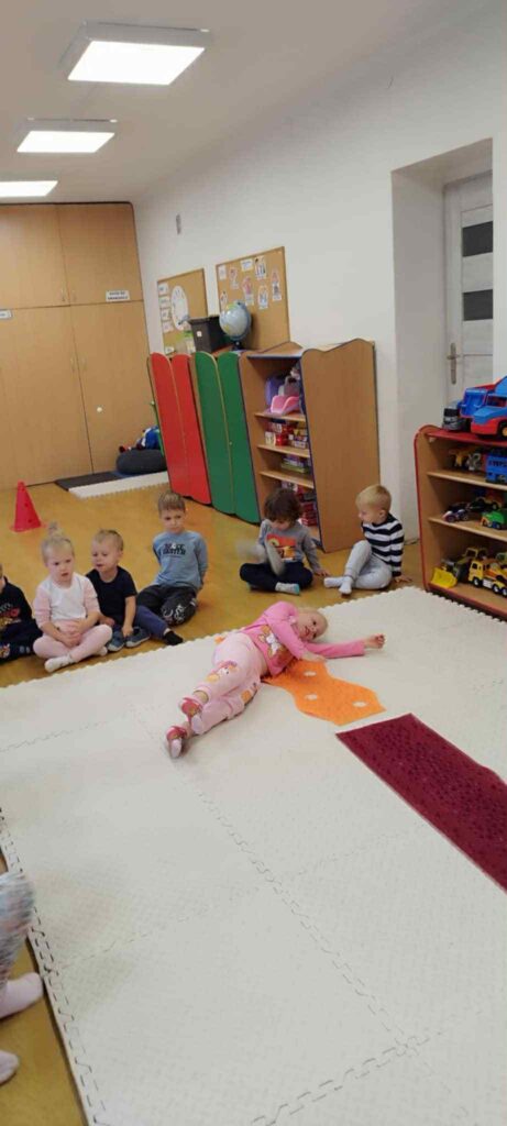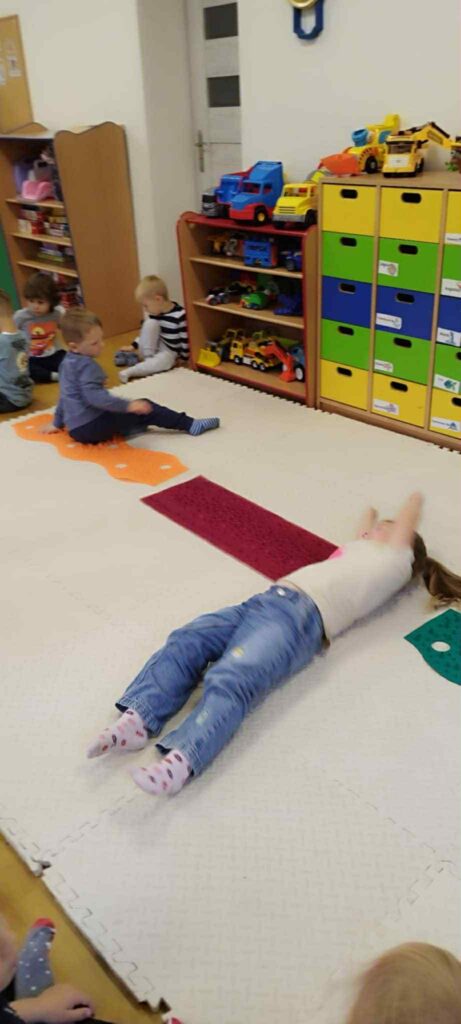 W ,,Rybakach”, przy okazji poznawania warzyw, rozwiązywaliśmy zagadki, dzieliliśmy warzywa według kolorów, następnie spróbowaliśmy zrobić mini przedstawienie inspirowane wierszem Jana Brzechwy ,,Na straganie „. Spróbowaliśmy też swoich sił na ścieżce sensorycznej, co przyniosło nam dużo zabawnych sytuacji, a następnie uczyliśmy się współpracy w parach, przenosząc krążki bez pomocy rąk. Na koniec żeby wyciszyć emocje bawiliśmy się zabawkami sensorycznymi i plasteliną.