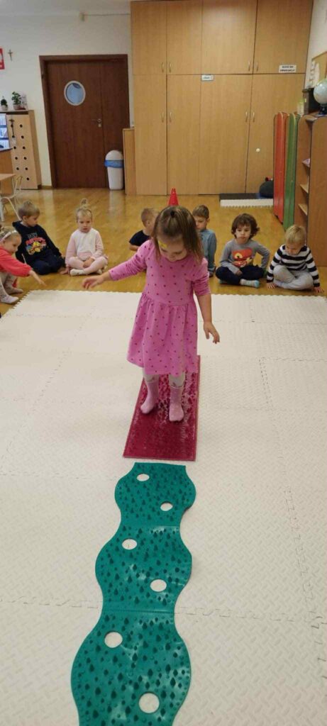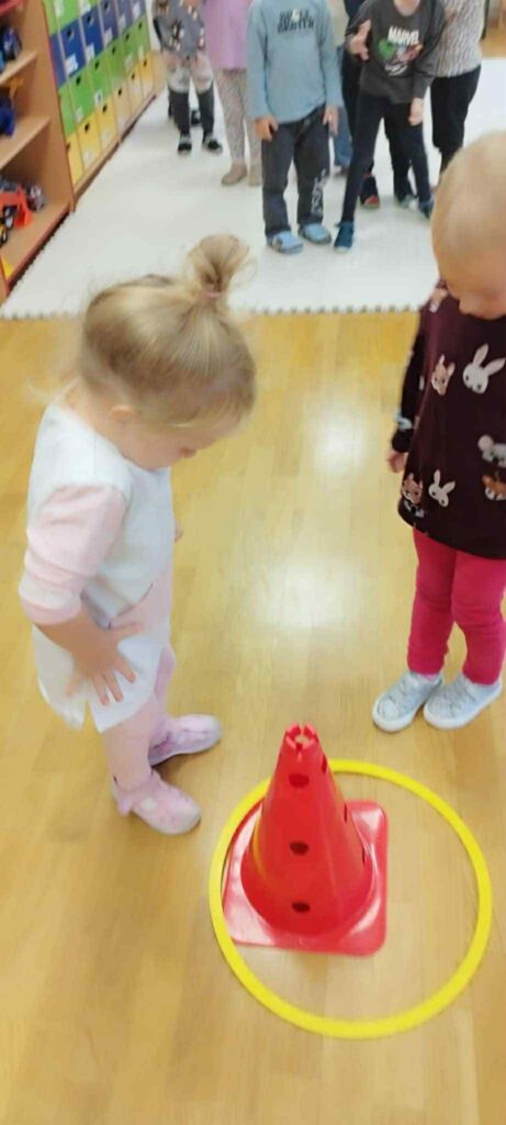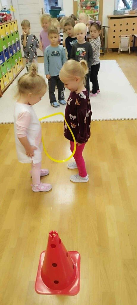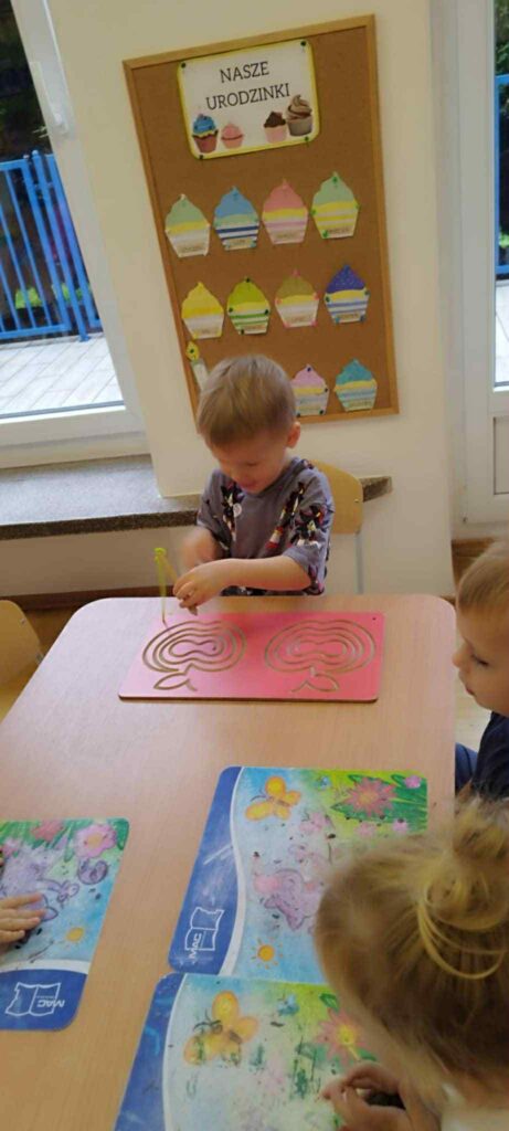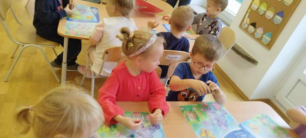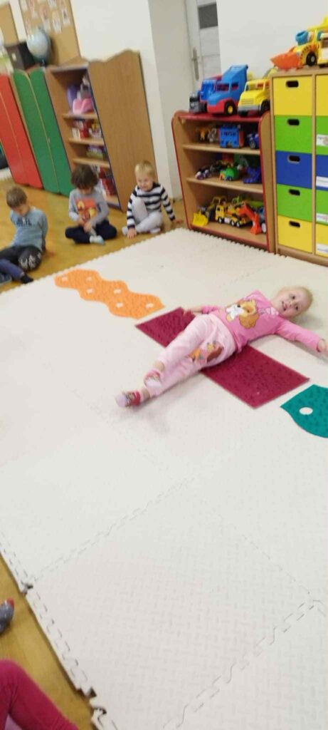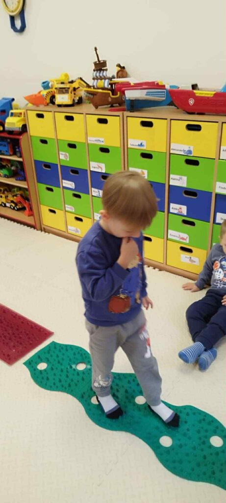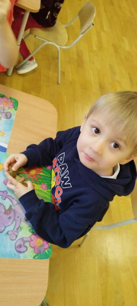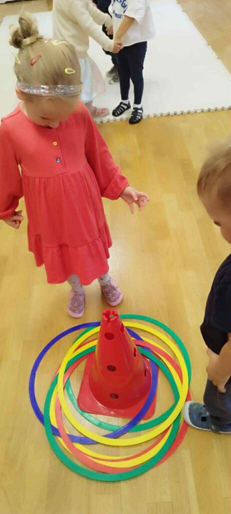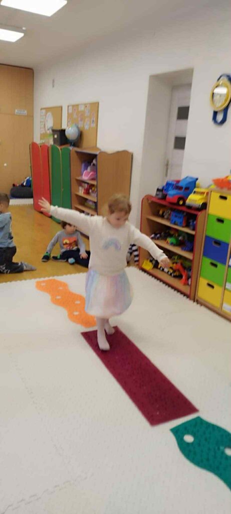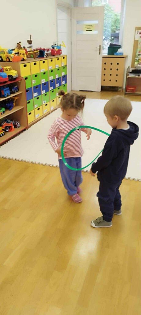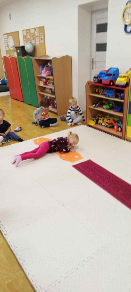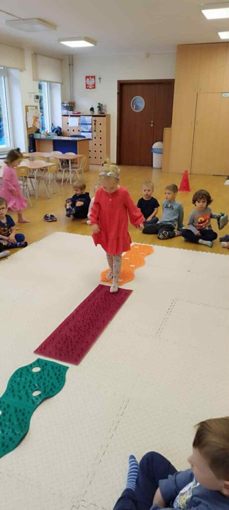 W ,,Rybakach”, przy okazji poznawania warzyw, rozwiązywaliśmy zagadki, dzieliliśmy warzywa według kolorów, następnie spróbowaliśmy zrobić mini przedstawienie inspirowane wierszem Jana Brzechwy ,,Na straganie „. Spróbowaliśmy też swoich sił na ścieżce sensorycznej, co przyniosło nam dużo zabawnych sytuacji, a następnie uczyliśmy się współpracy w parach, przenosząc krążki bez pomocy rąk. Na koniec żeby wyciszyć emocje bawiliśmy się zabawkami sensorycznymi i plasteliną.