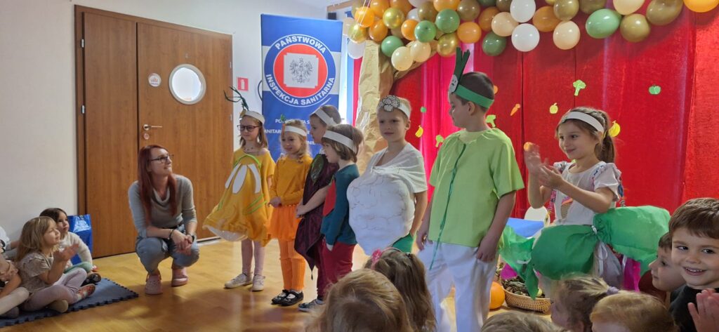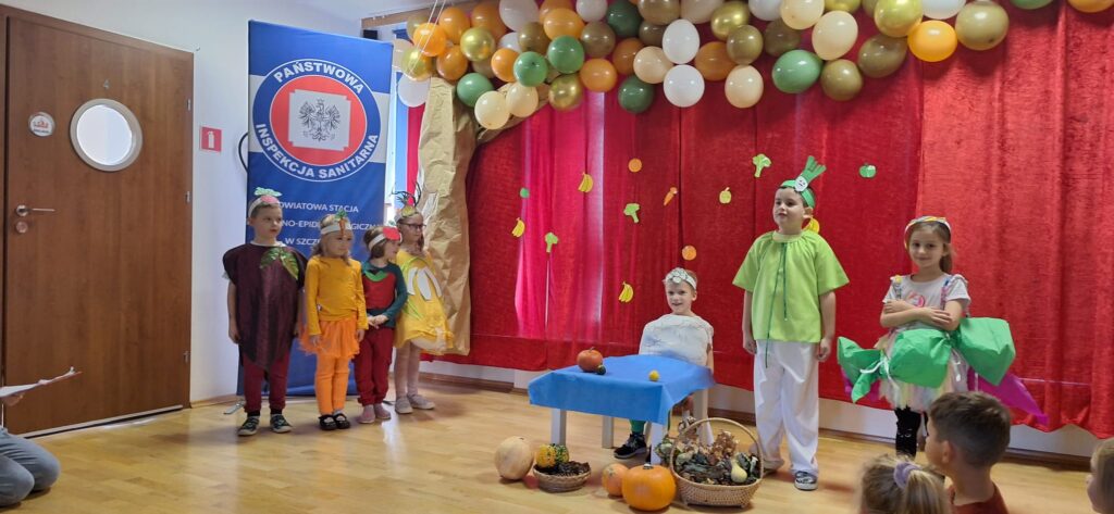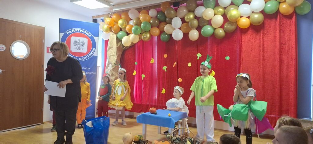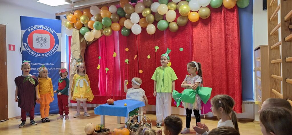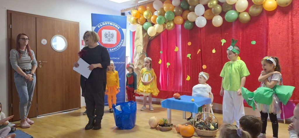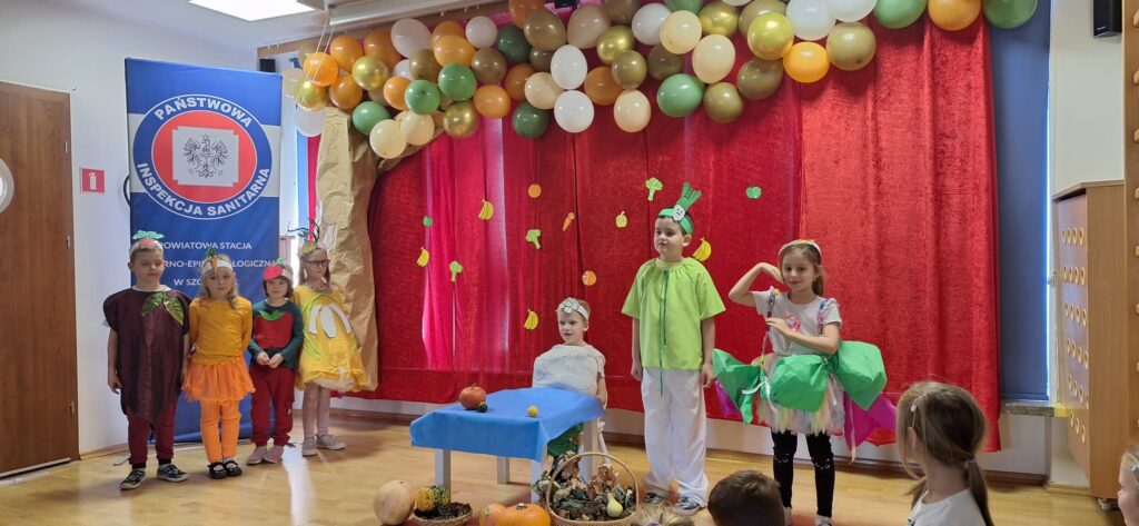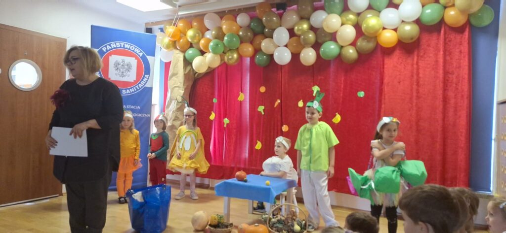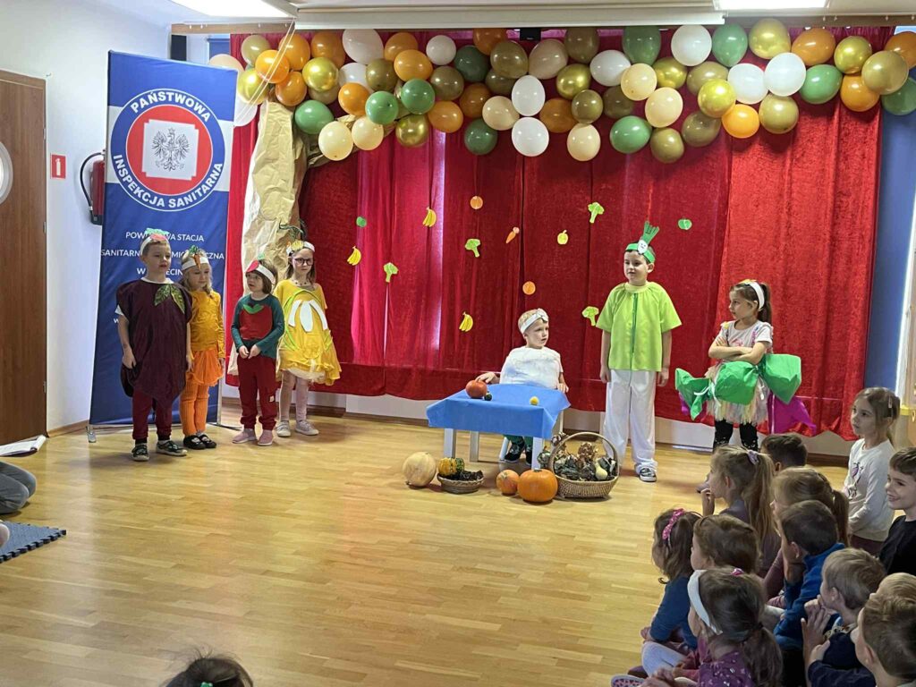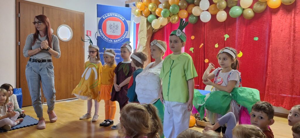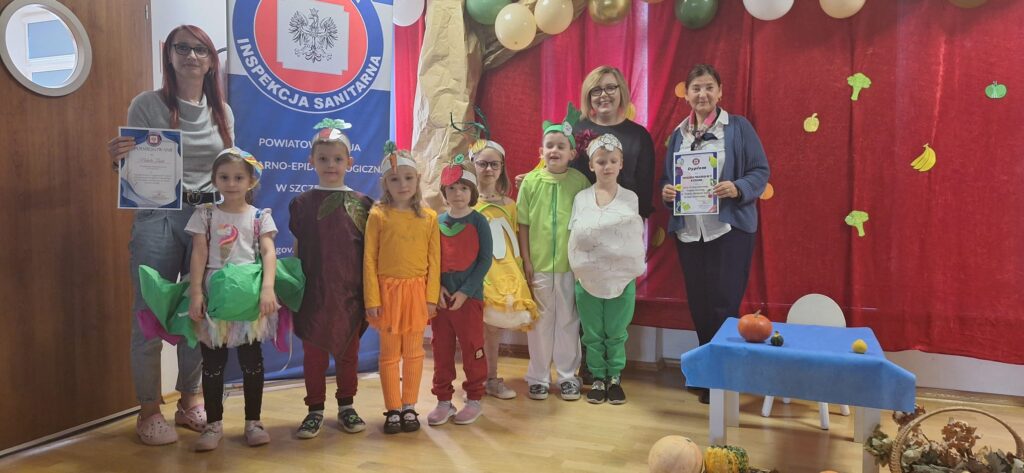 Dzieci z grupy „Piraci” wzięły udział w konkursie organizowanym przez Powiatową Stację Sanitarno – Epidemiologiczną pt. „Eko warzywa kupuję, bo swoje zdrowie buduję.” Zadaniem konkursowym, było przygotowanie krótkiej inscenizacji, której celem jest zwiększenie wiedzy i świadomości przedszkolaków o nawykach higieniczno-zdrowotnych.