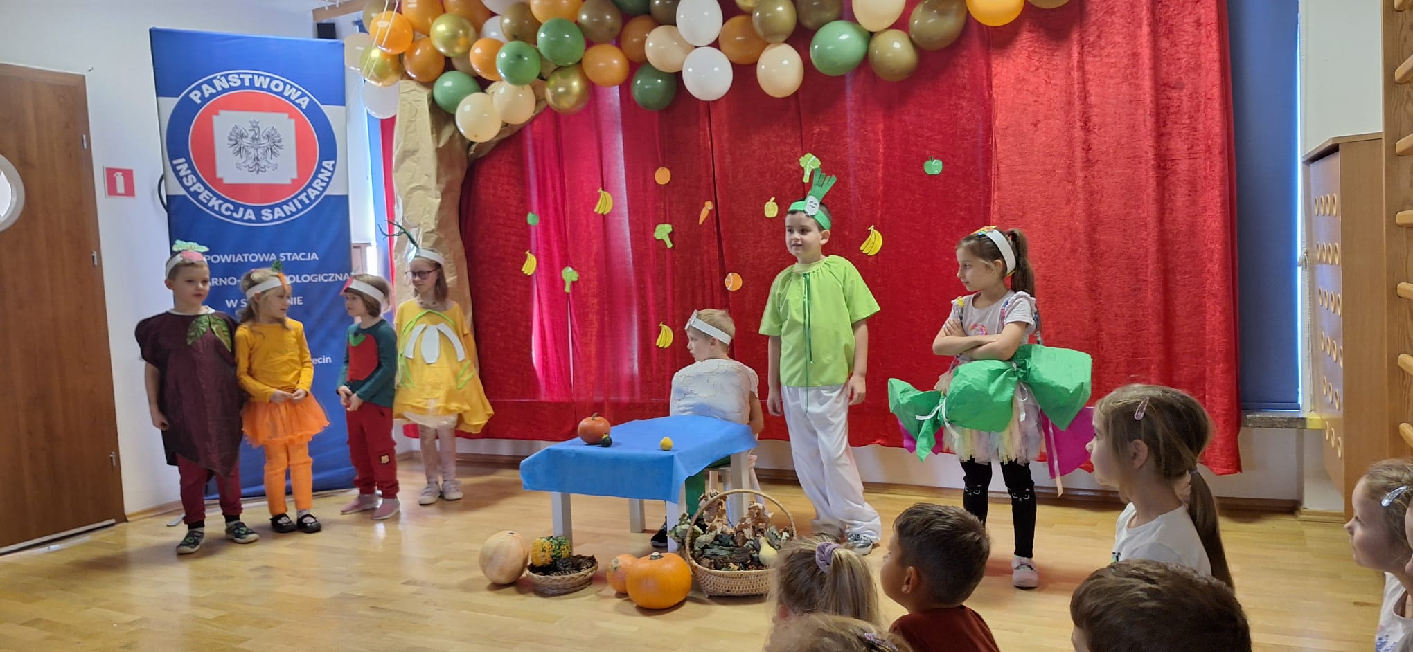 Dzieci z grupy „Piraci” wzięły udział w konkursie organizowanym przez Powiatową Stację Sanitarno – Epidemiologiczną pt. „Eko warzywa kupuję, bo swoje zdrowie buduję.” Zadaniem konkursowym, było przygotowanie krótkiej inscenizacji, której celem jest zwiększenie wiedzy i świadomości przedszkolaków o nawykach higieniczno-zdrowotnych.