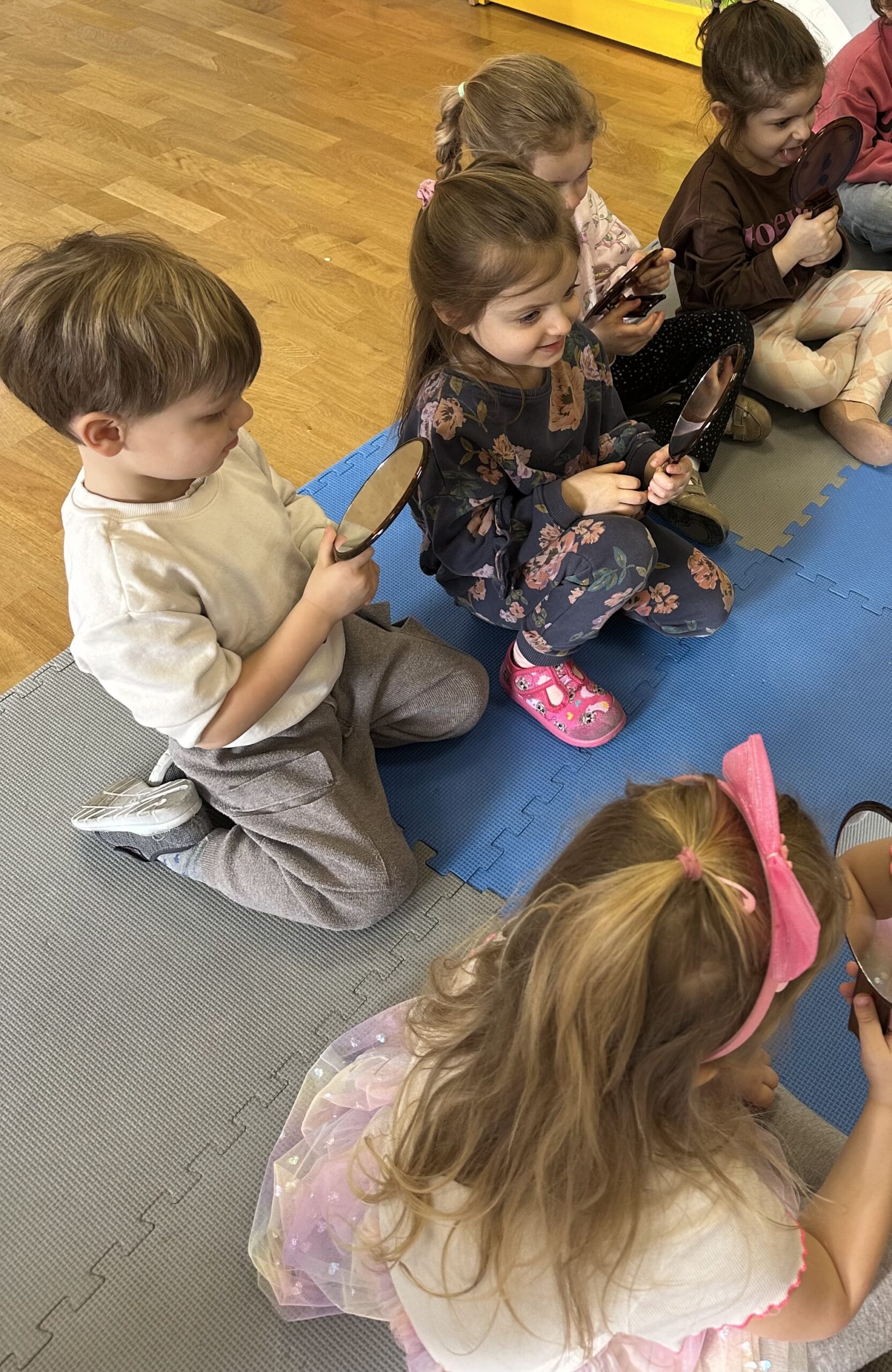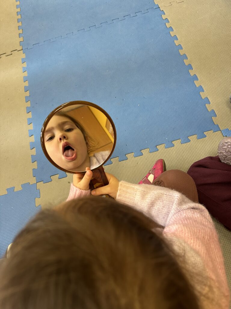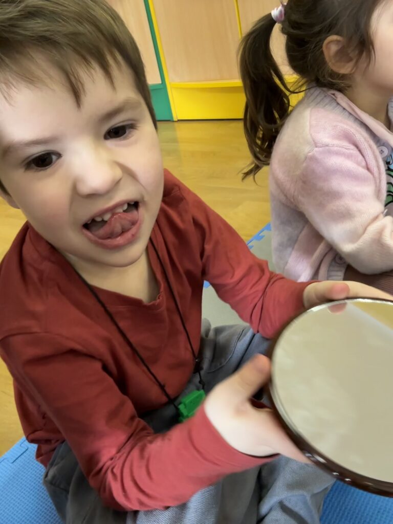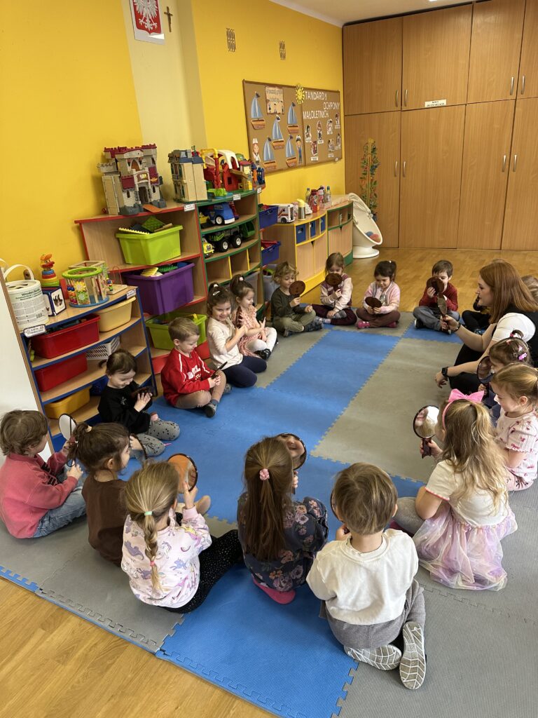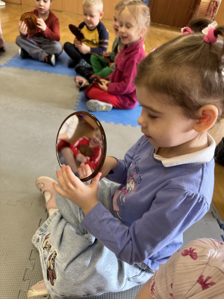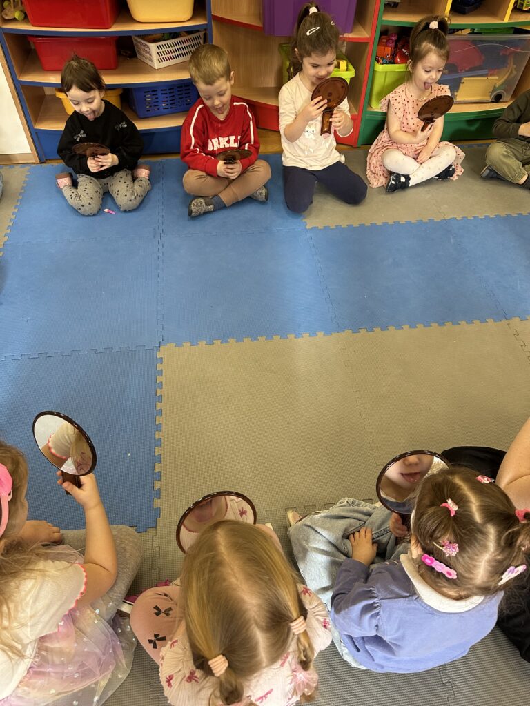 Dzisiaj na naszych zajęciach królowały ciekawe przedmioty – lusterka 🪞 Dzięki nim mogliśmy obserwować, czy poprawnie wykonujemy ćwiczenia, mające na celu usprawnienie naszego aparatu artykulacyjnego. Dzisiejsza gimnastyka buzi i języka była oparta na interesującej bajce o „Kubusiu Puchatku”. Była świetna zabawa!