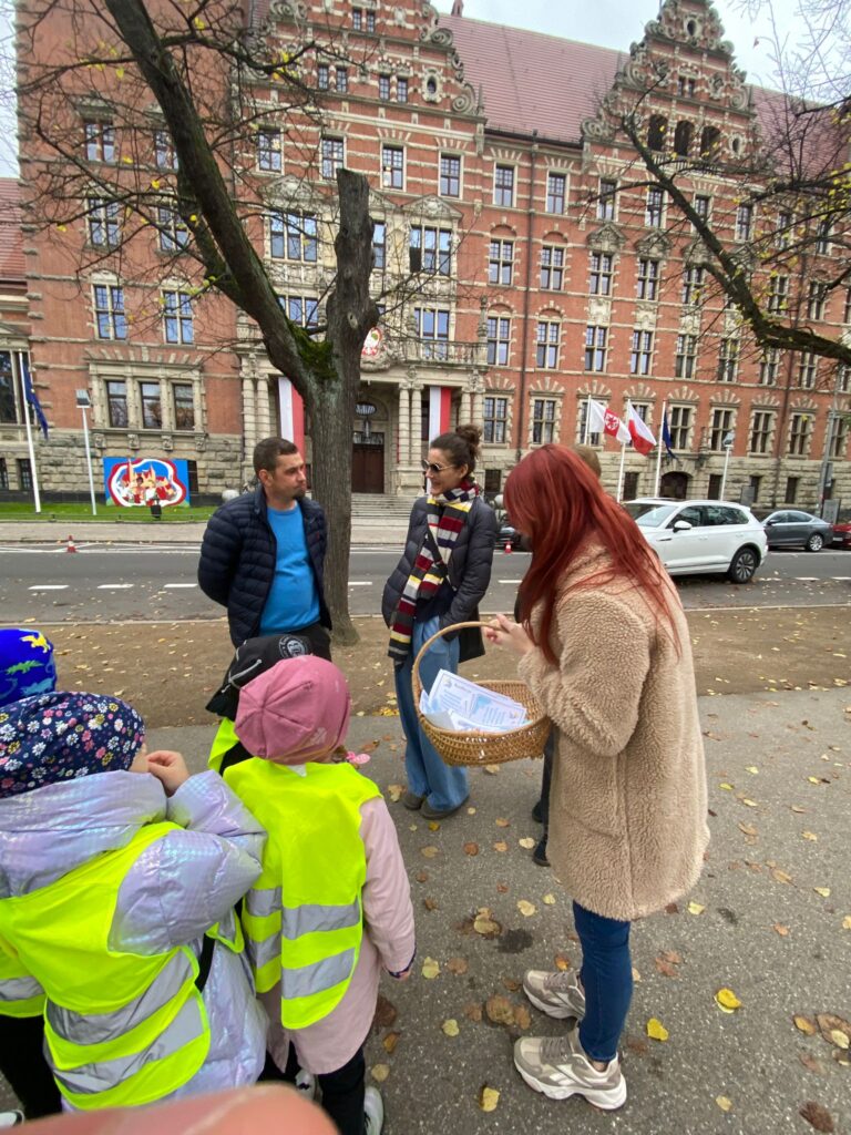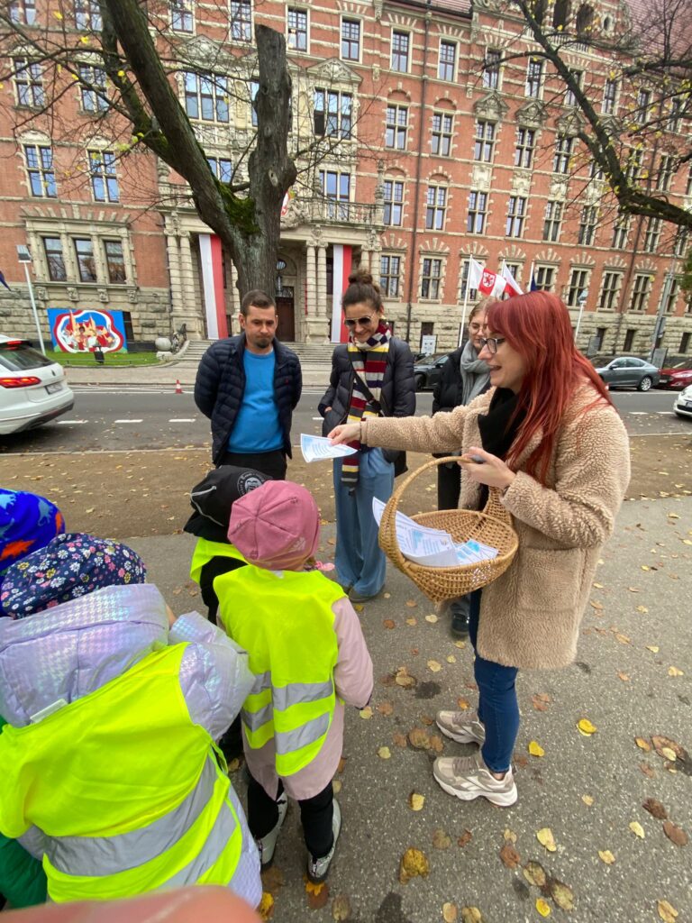 Zachęcaliśmy wszystkich przechodniów, by na chwilę zatrzymali się w codziennym pośpiechu i zabrali ze sobą odrobinę dobra. Rozdawaliśmy specjalne karteczki z krótkimi życzeniami – pełnymi ciepła, humoru i pozytywnej energii, oraz życzyliśmy miłego dnia.