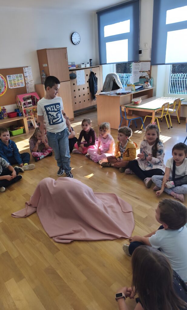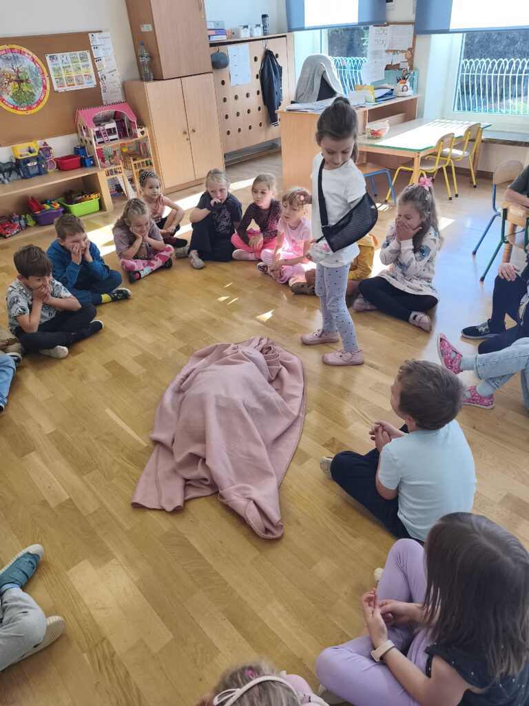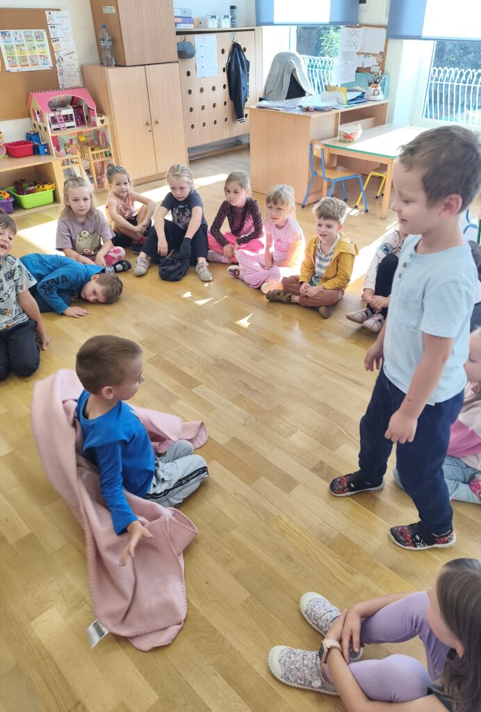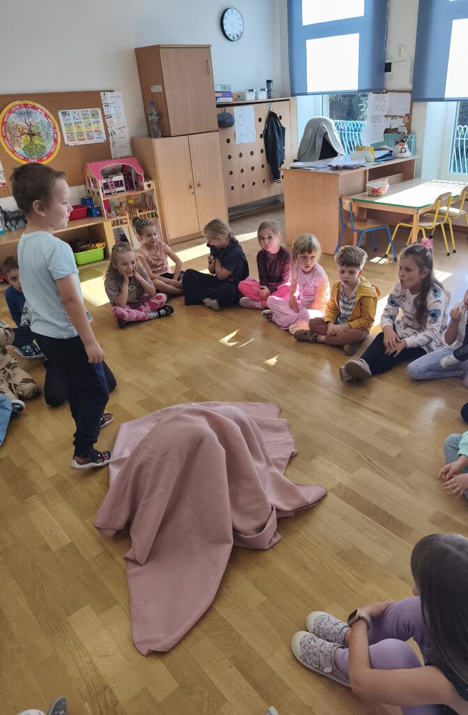 Do kolejnej zabawy wykorzystaliśmy koc, który był naszym spadającym jesiennym listkiem, okrywał jedną osobę. Ćwiczyliśmy w ten sposób naszą pamięć, okazało się, że wcale nie tak łatwo było wskazać kogo nakrył liść 🍂