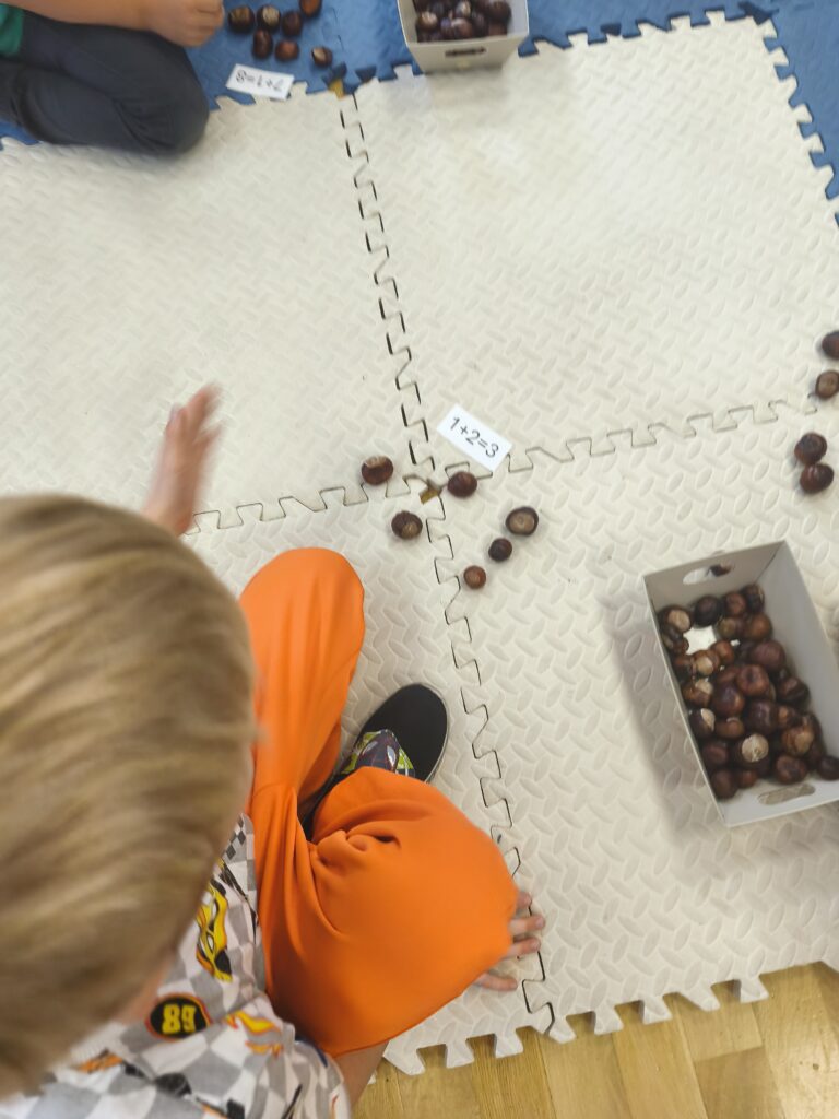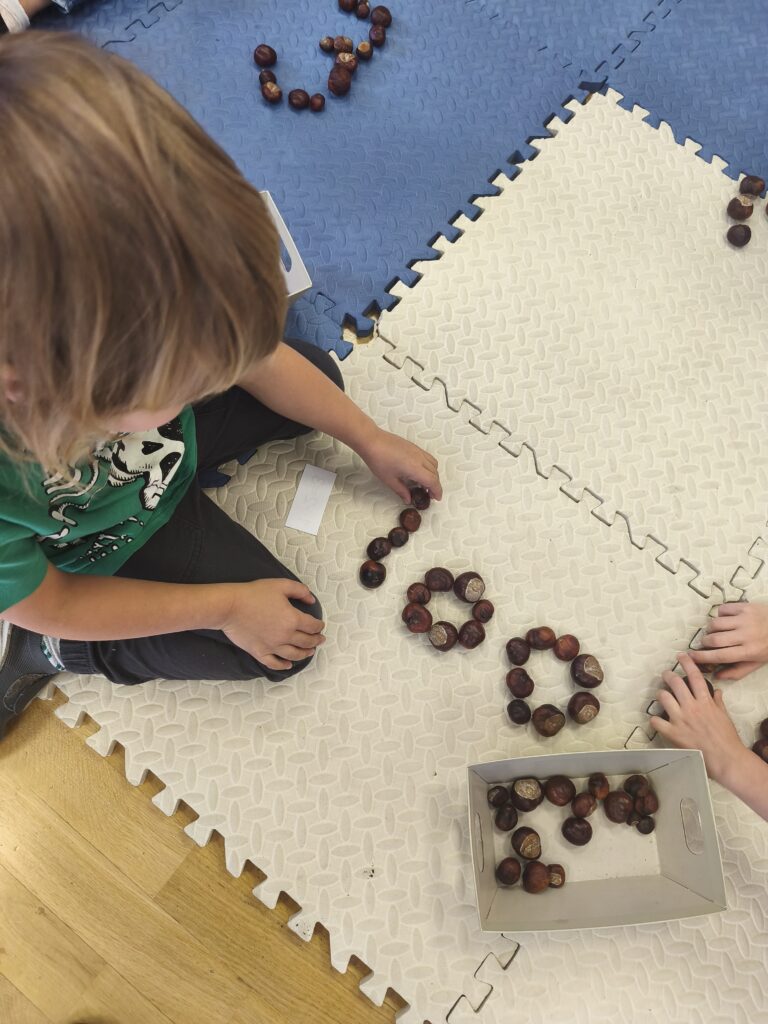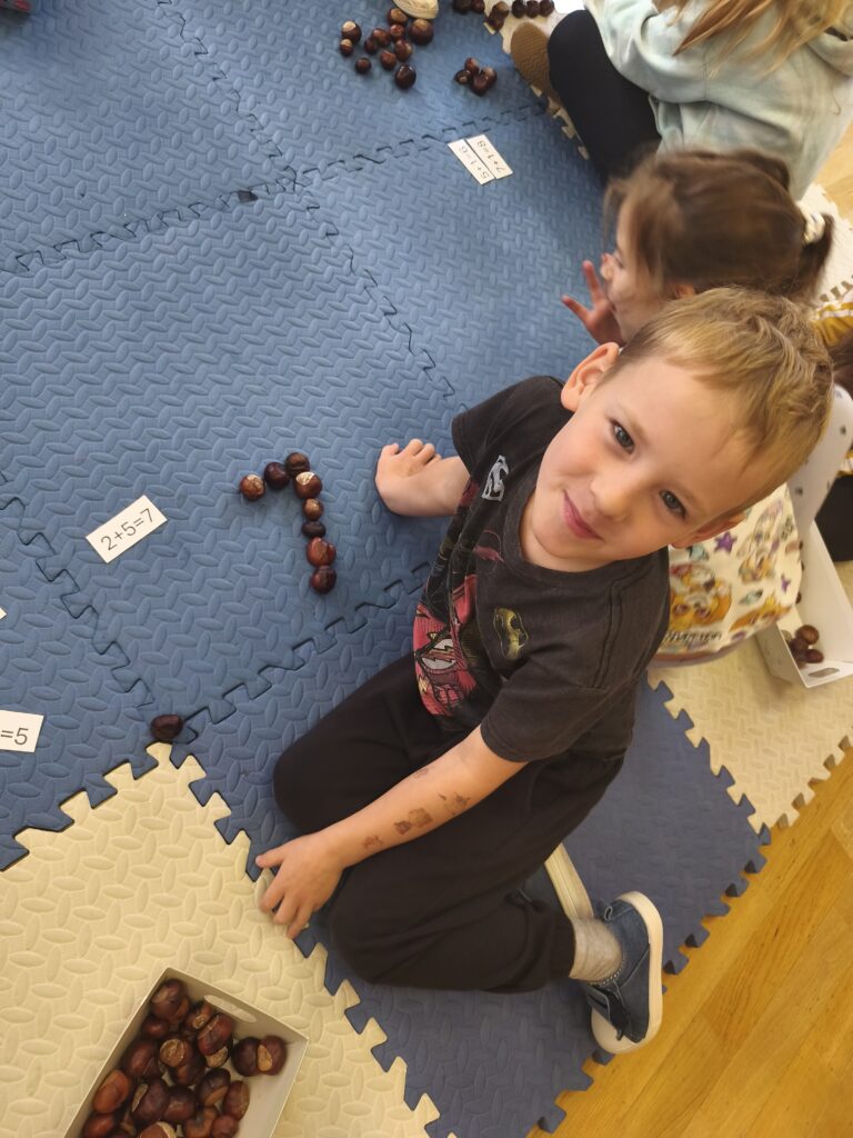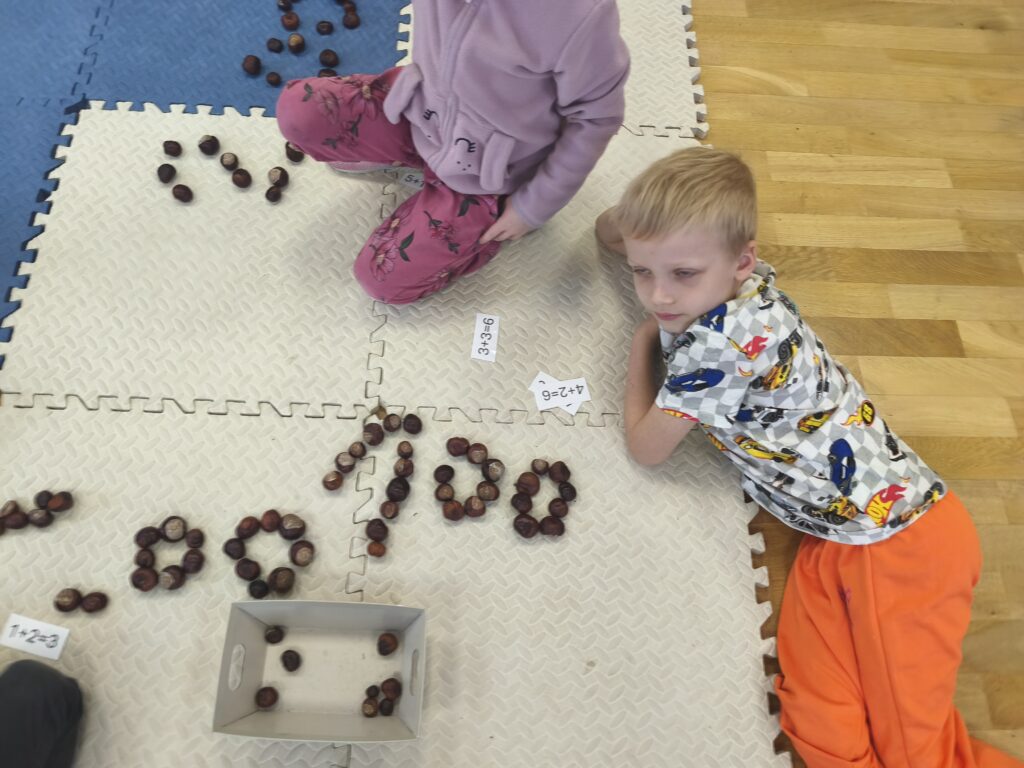 Tematem przewodnim były kasztany, które służyły nam jako fantastyczne pomoce dydaktyczne do przeliczania, segregowania i porównywania zbiorów. Z ogromnym zaangażowaniem układaliśmy kasztanowe cyfry, liczby, znaki. Była to świetna okazja, by w praktyczny i namacalny sposób ćwiczyć wstępne umiejętności matematyczne.