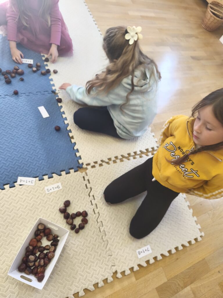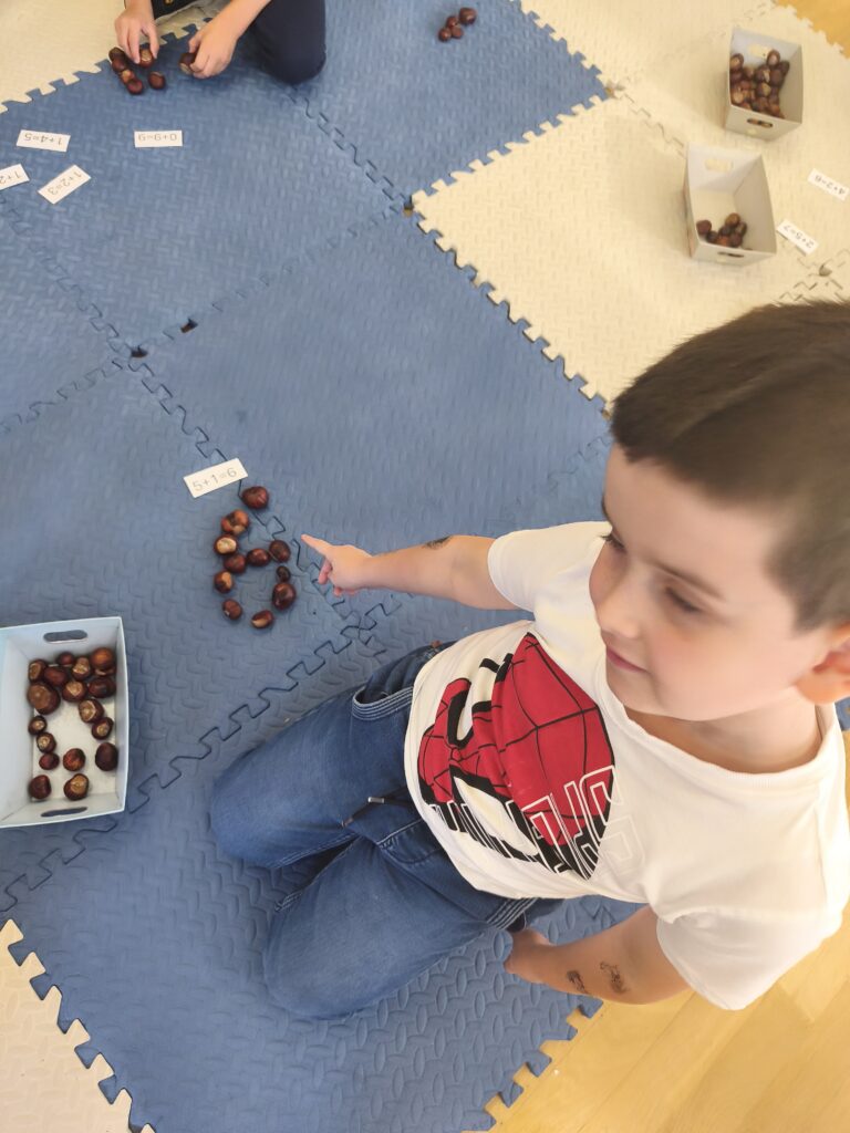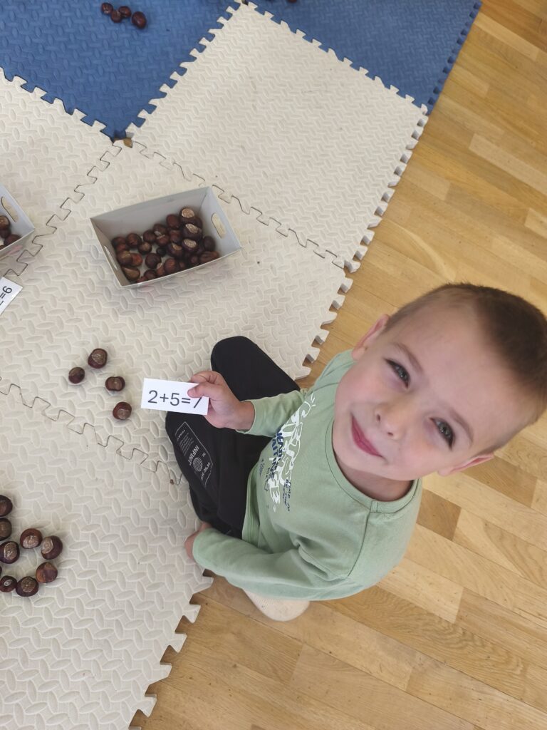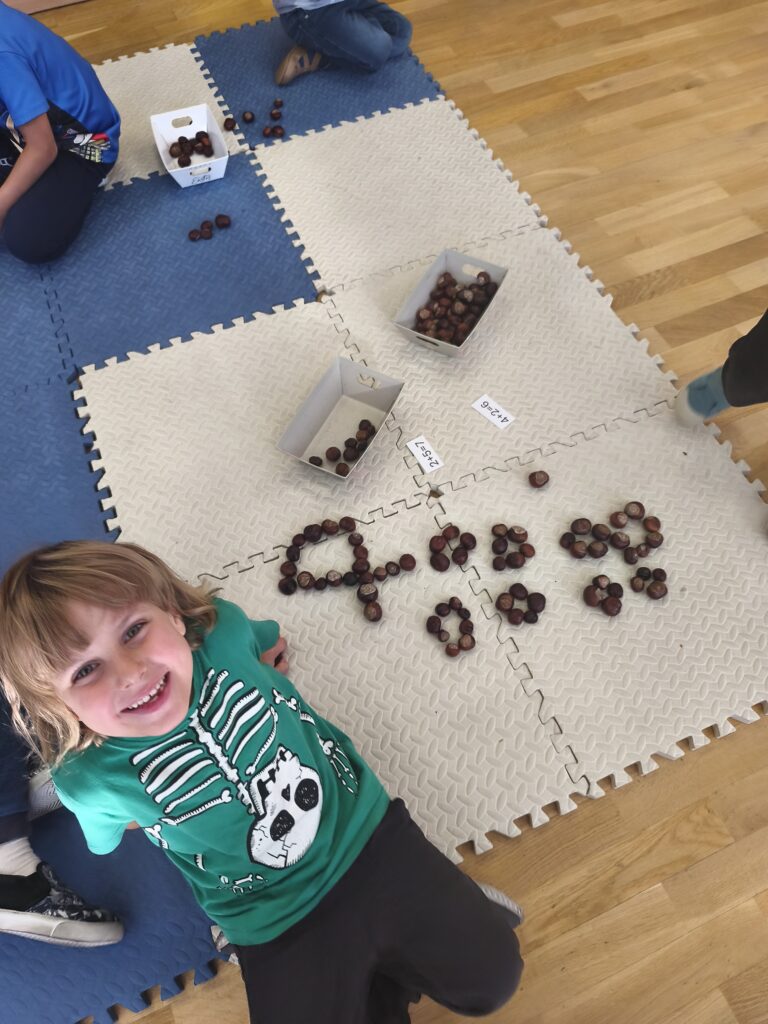 Tematem przewodnim były kasztany, które służyły nam jako fantastyczne pomoce dydaktyczne do przeliczania, segregowania i porównywania zbiorów. Z ogromnym zaangażowaniem układaliśmy kasztanowe cyfry, liczby, znaki. Była to świetna okazja, by w praktyczny i namacalny sposób ćwiczyć wstępne umiejętności matematyczne.