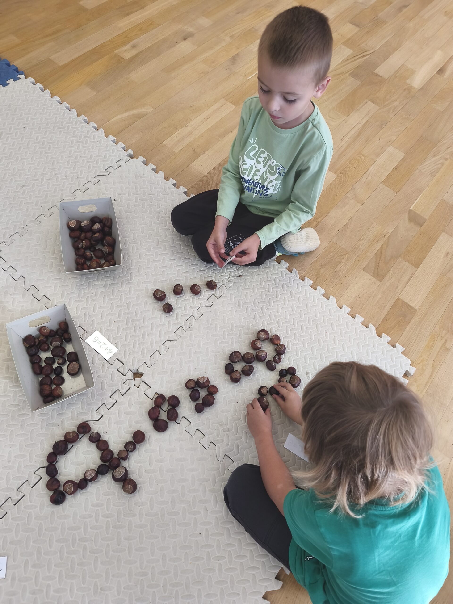 Tematem przewodnim były kasztany, które służyły nam jako fantastyczne pomoce dydaktyczne do przeliczania, segregowania i porównywania zbiorów. Z ogromnym zaangażowaniem układaliśmy kasztanowe cyfry, liczby, znaki. Była to świetna okazja, by w praktyczny i namacalny sposób ćwiczyć wstępne umiejętności matematyczne.
