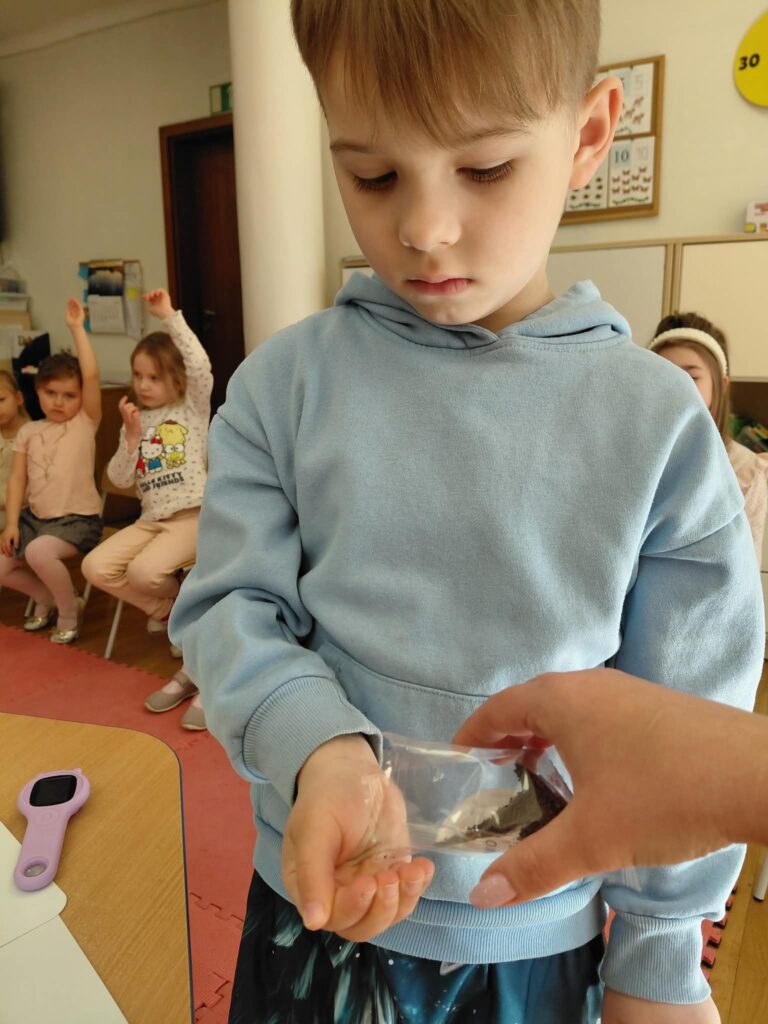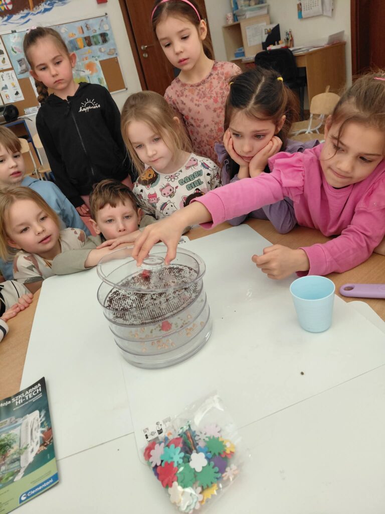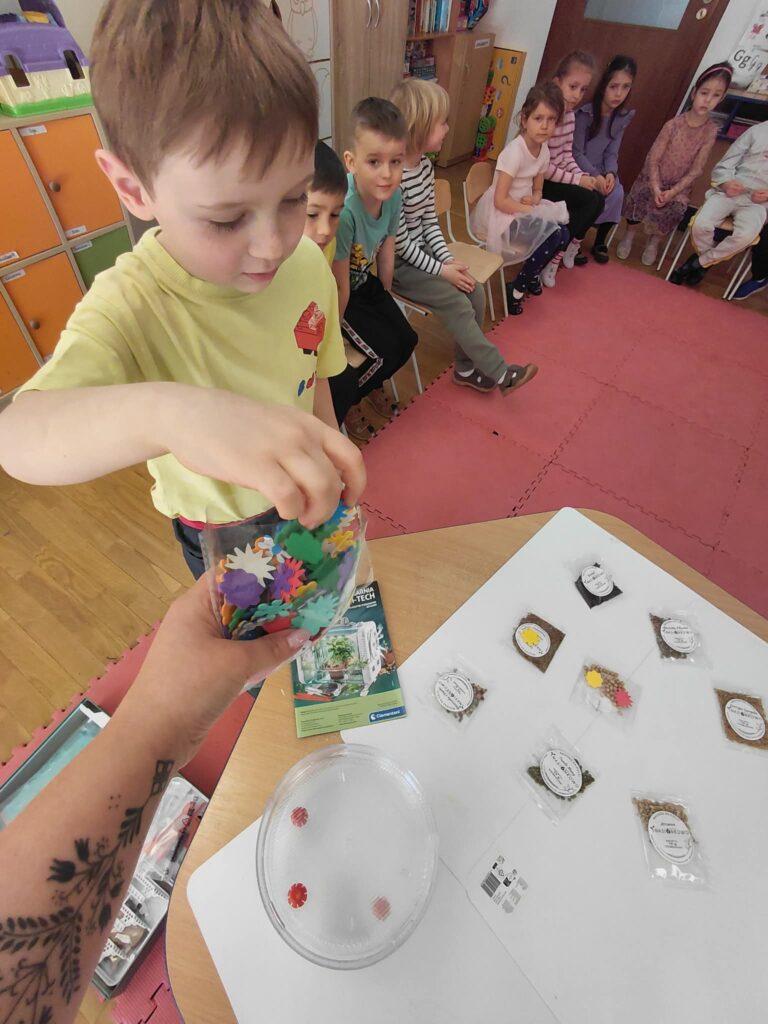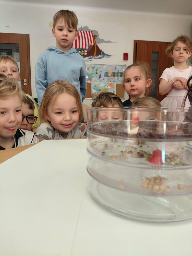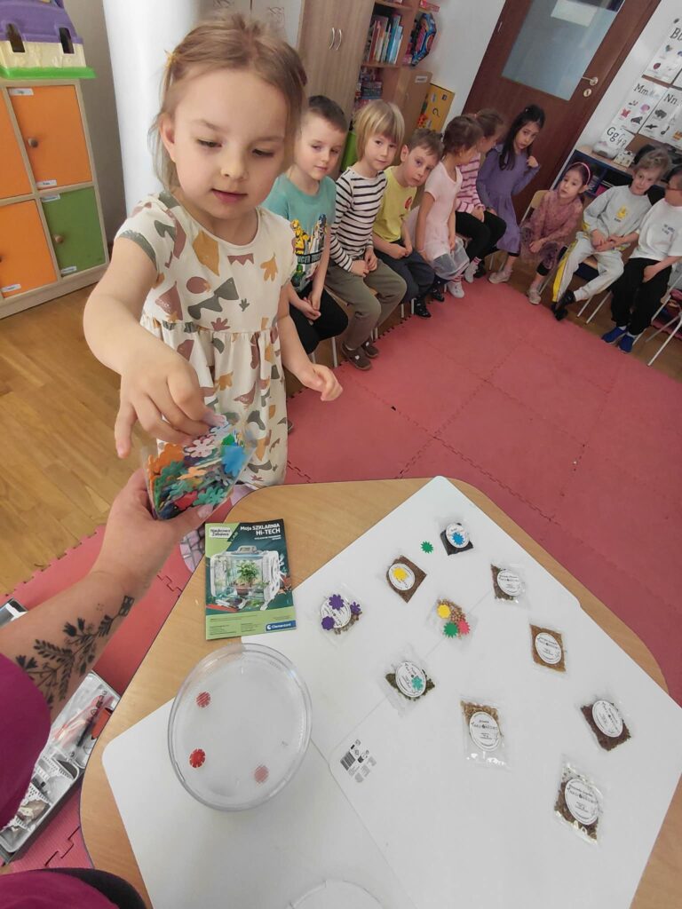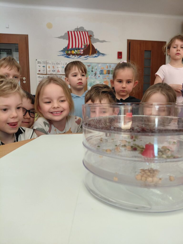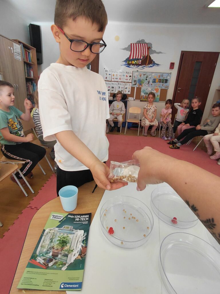 Dzisiaj założyliśmy nasz grupowy kiełkownik z różnych nasion, które wybraliśmy poprzez głosowanie. Każdy z nas miał możliwość wyboru na które nasionka chce zagłosować przyklejając kwiatek. Na koniec głosowania przeliczyliśmy które nasiona uzyskały najwięcej głosów i to właśnie je posialiśmy. Mieliśmy również możliwość obserwacji nasion pod mikroskopem. Teraz pozostało nam tylko cierpliwie czekać, pielęgnować i obserwować zmiany zachodzące w kiełkownicy.