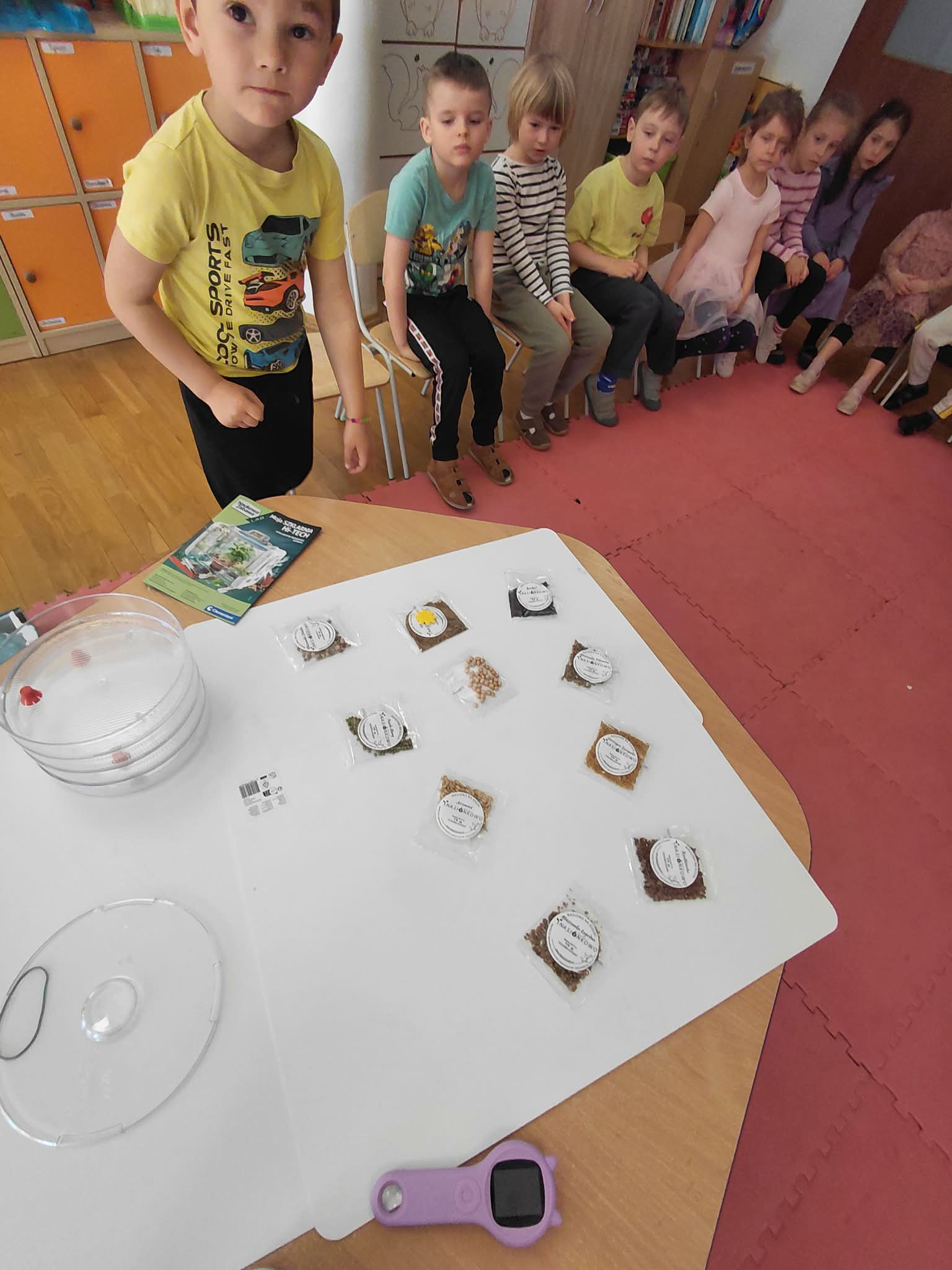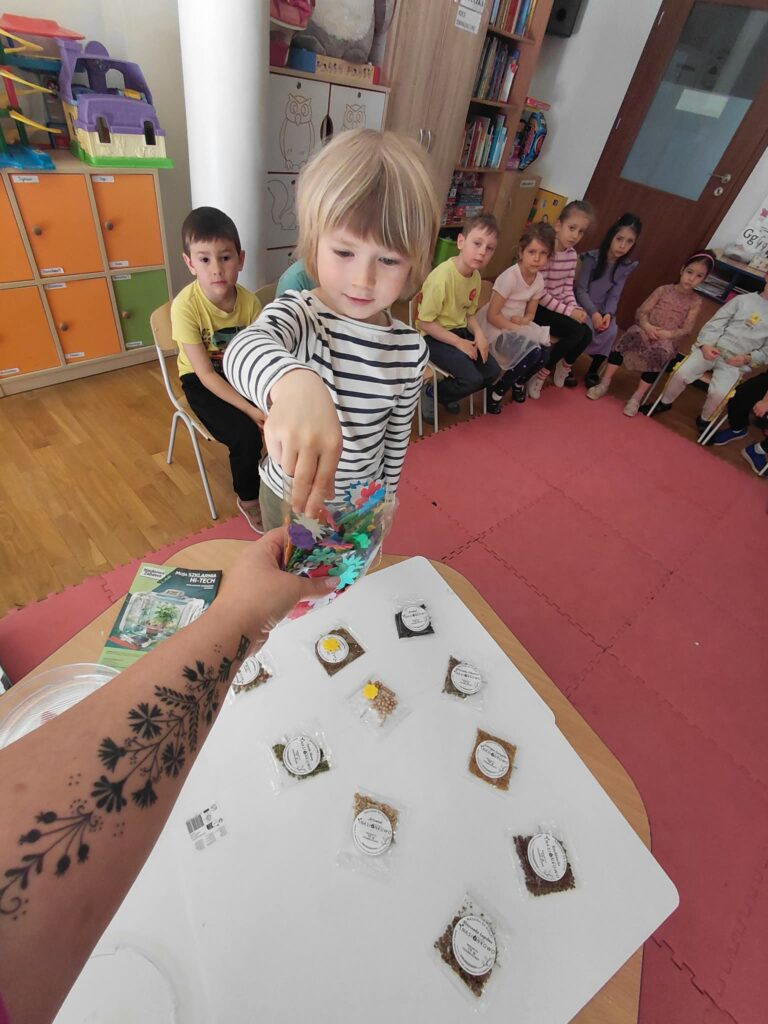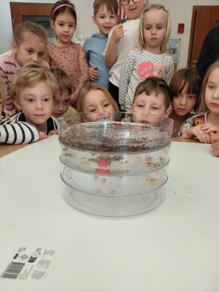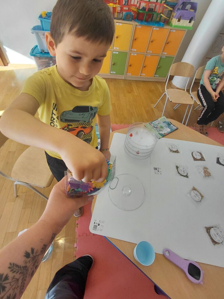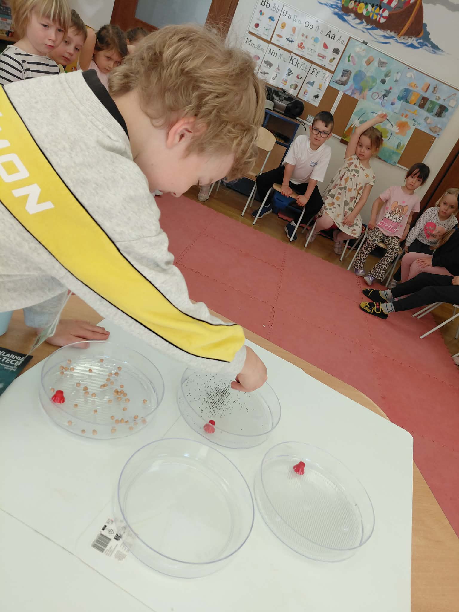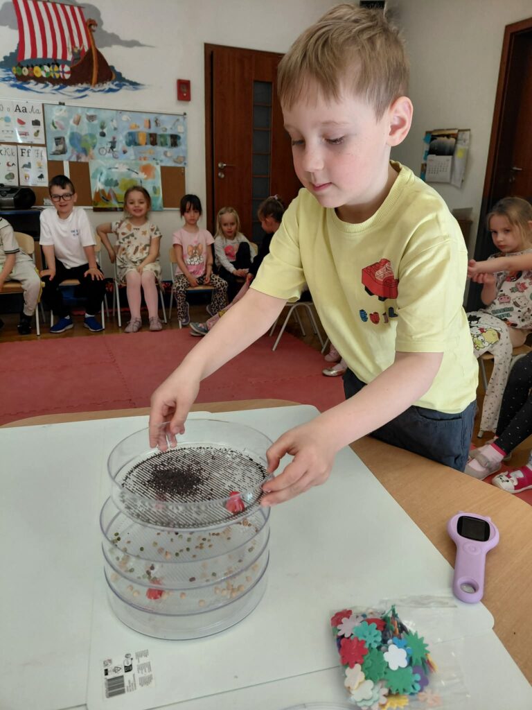 Dzisiaj założyliśmy nasz grupowy kiełkownik z różnych nasion, które wybraliśmy poprzez głosowanie. Każdy z nas miał możliwość wyboru na które nasionka chce zagłosować przyklejając kwiatek. Na koniec głosowania przeliczyliśmy które nasiona uzyskały najwięcej głosów i to właśnie je posialiśmy. Mieliśmy również możliwość obserwacji nasion pod mikroskopem. Teraz pozostało nam tylko cierpliwie czekać, pielęgnować i obserwować zmiany zachodzące w kiełkownicy.