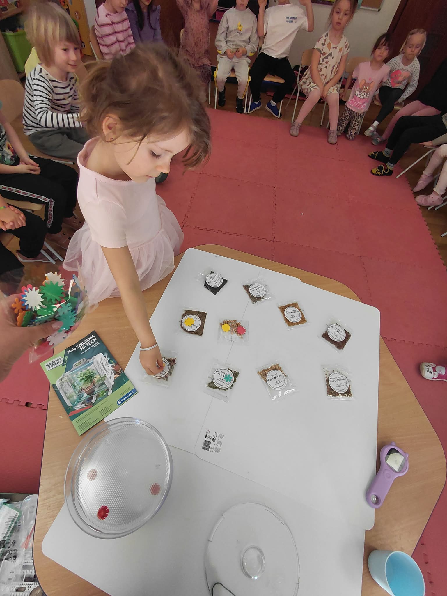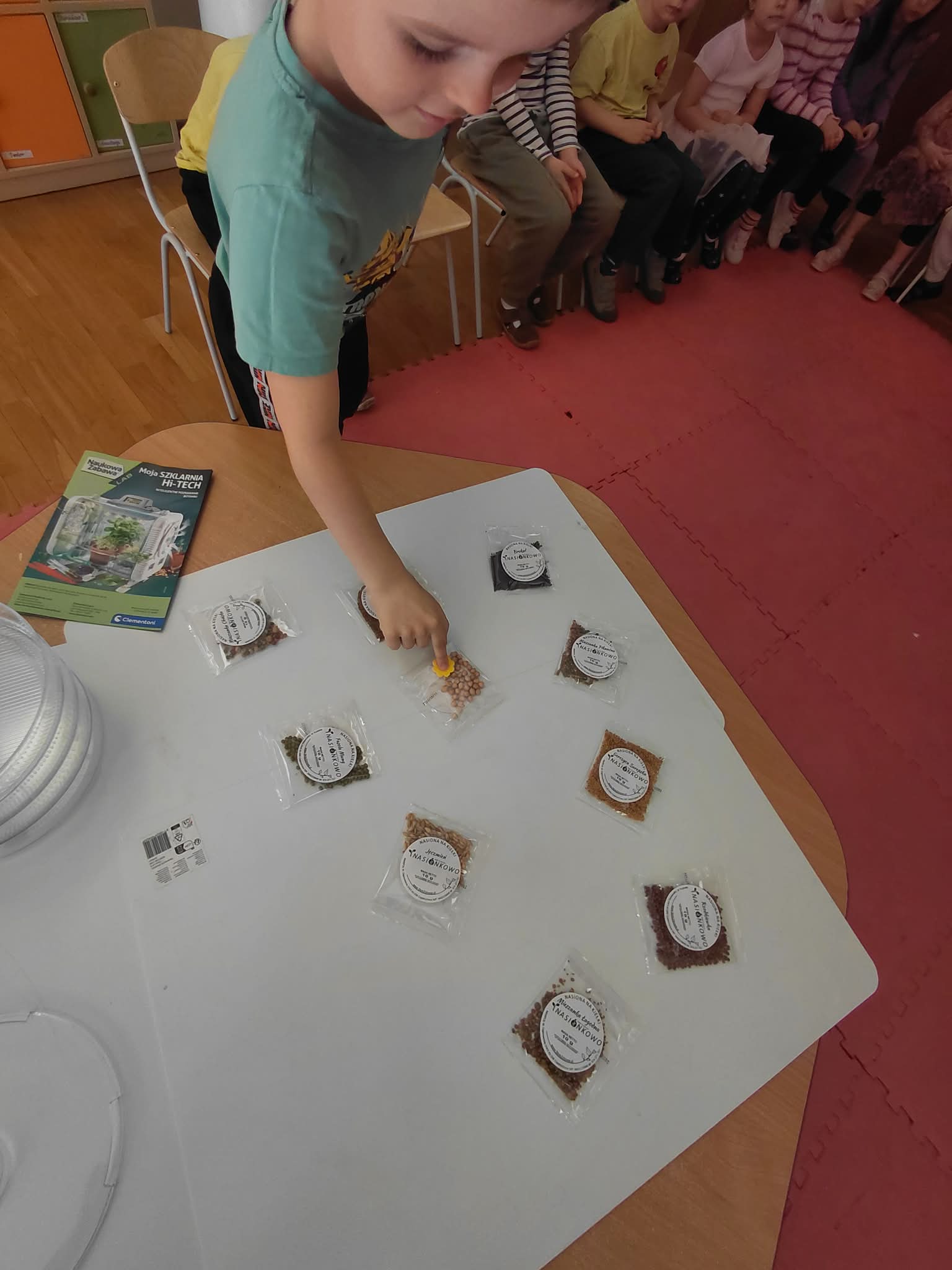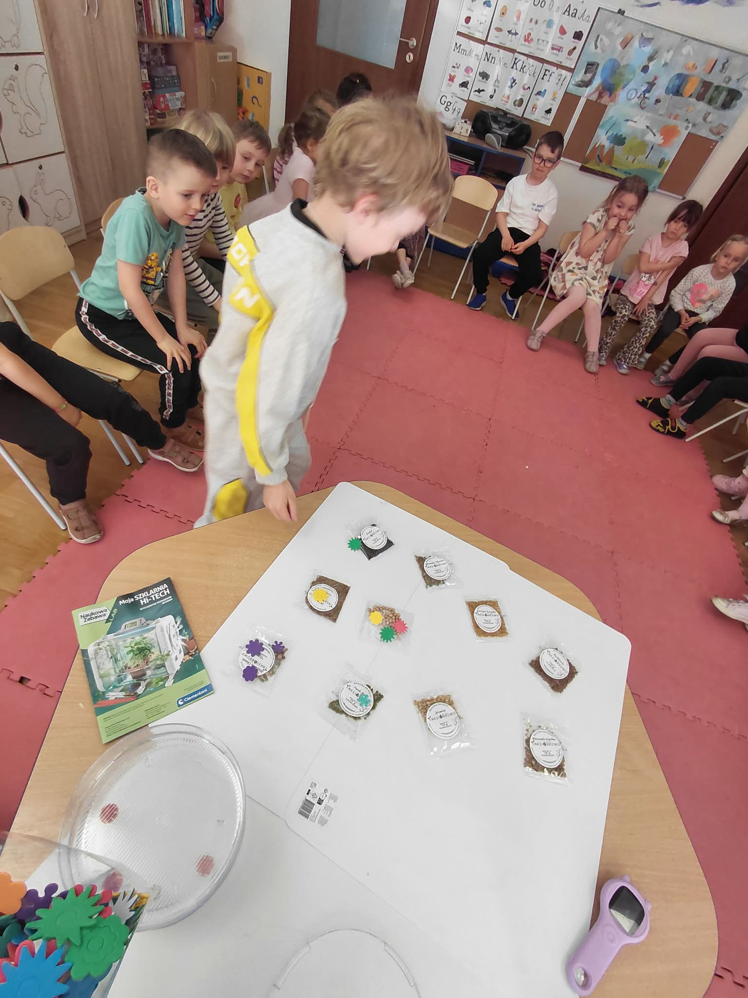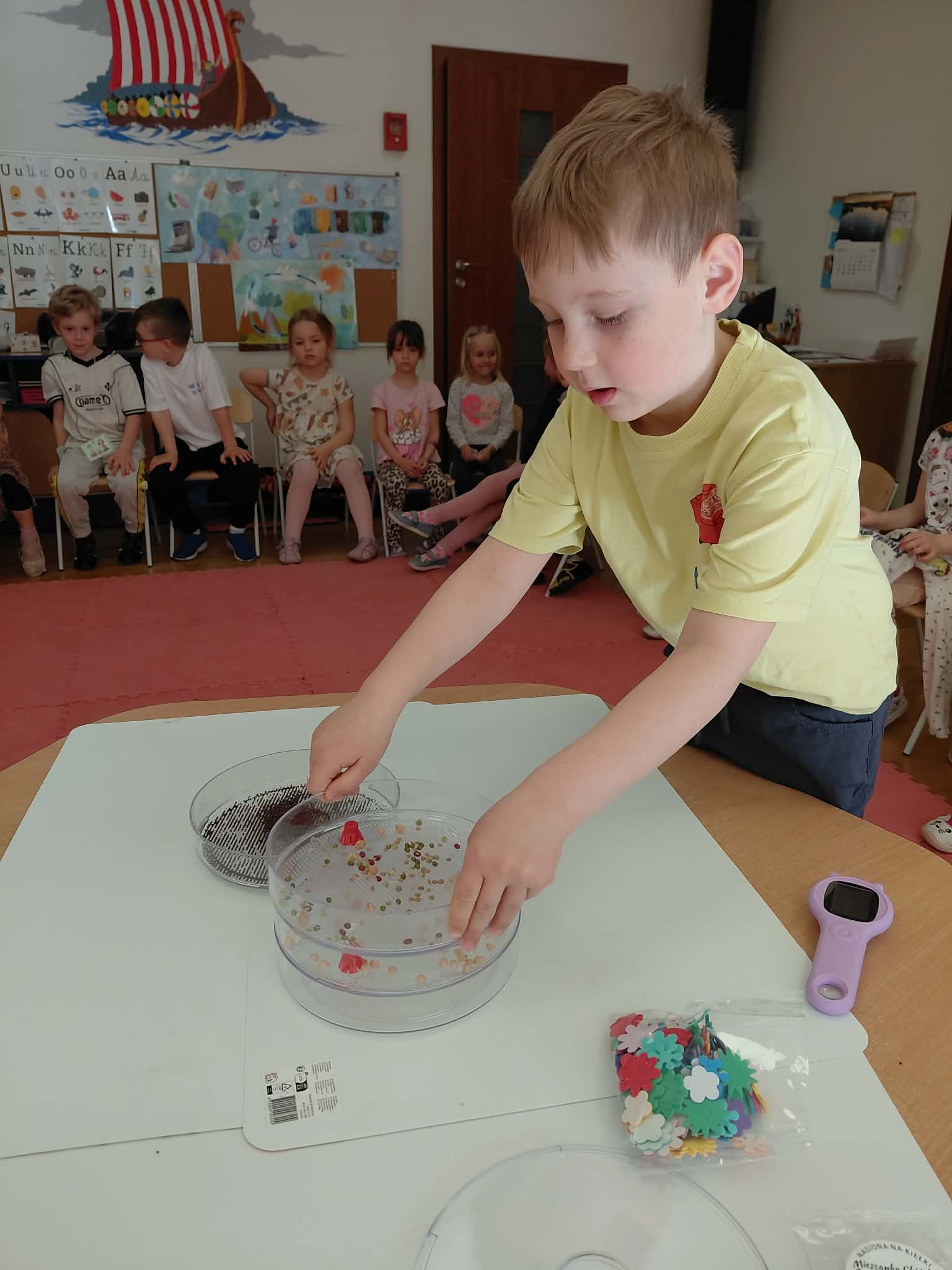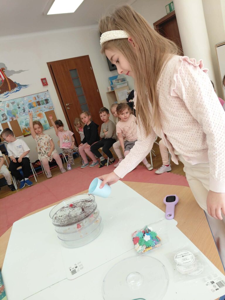 Dzisiaj założyliśmy nasz grupowy kiełkownik z różnych nasion, które wybraliśmy poprzez głosowanie. Każdy z nas miał możliwość wyboru na które nasionka chce zagłosować przyklejając kwiatek. Na koniec głosowania przeliczyliśmy które nasiona uzyskały najwięcej głosów i to właśnie je posialiśmy. Mieliśmy również możliwość obserwacji nasion pod mikroskopem. Teraz pozostało nam tylko cierpliwie czekać, pielęgnować i obserwować zmiany zachodzące w kiełkownicy.