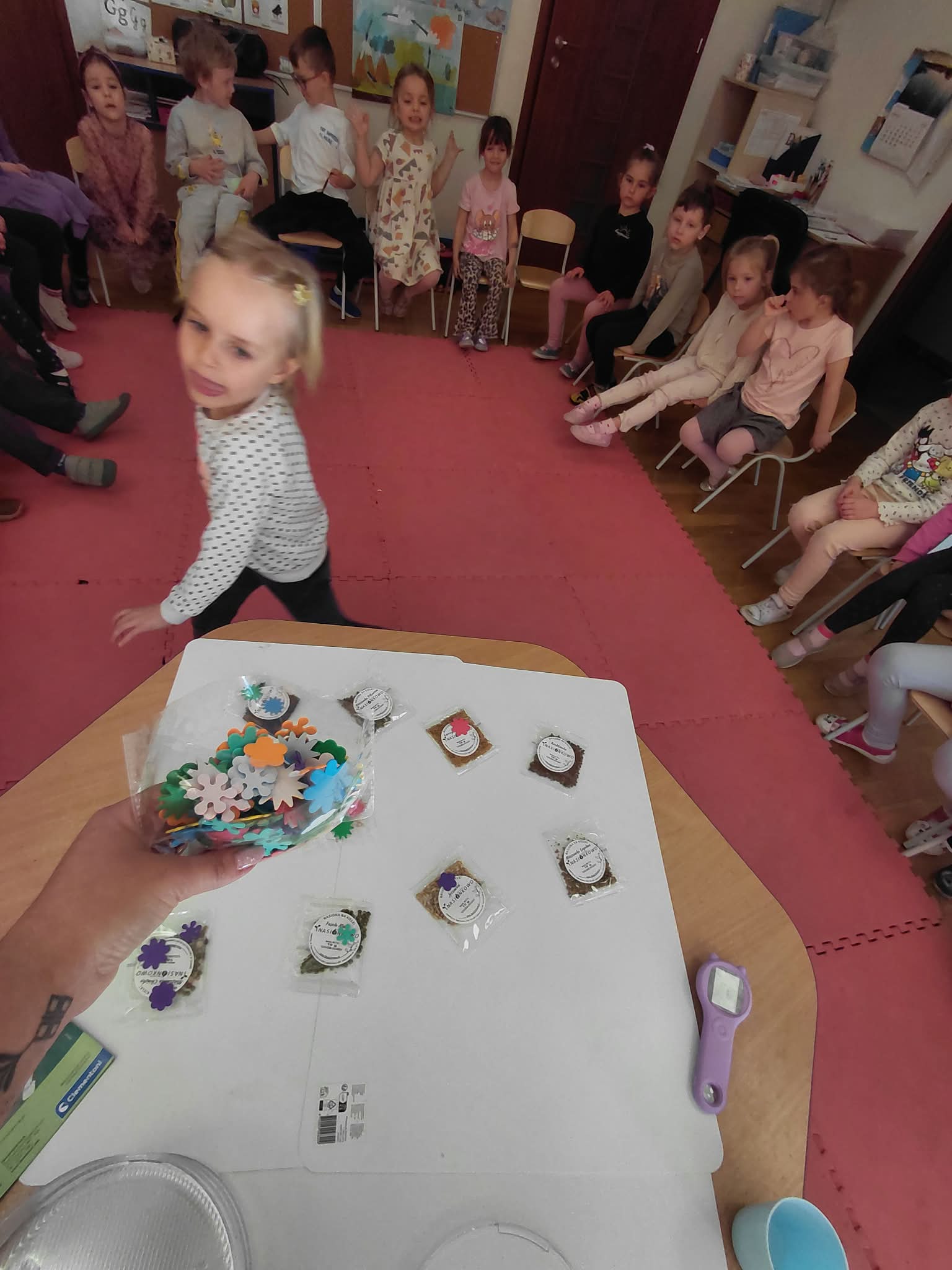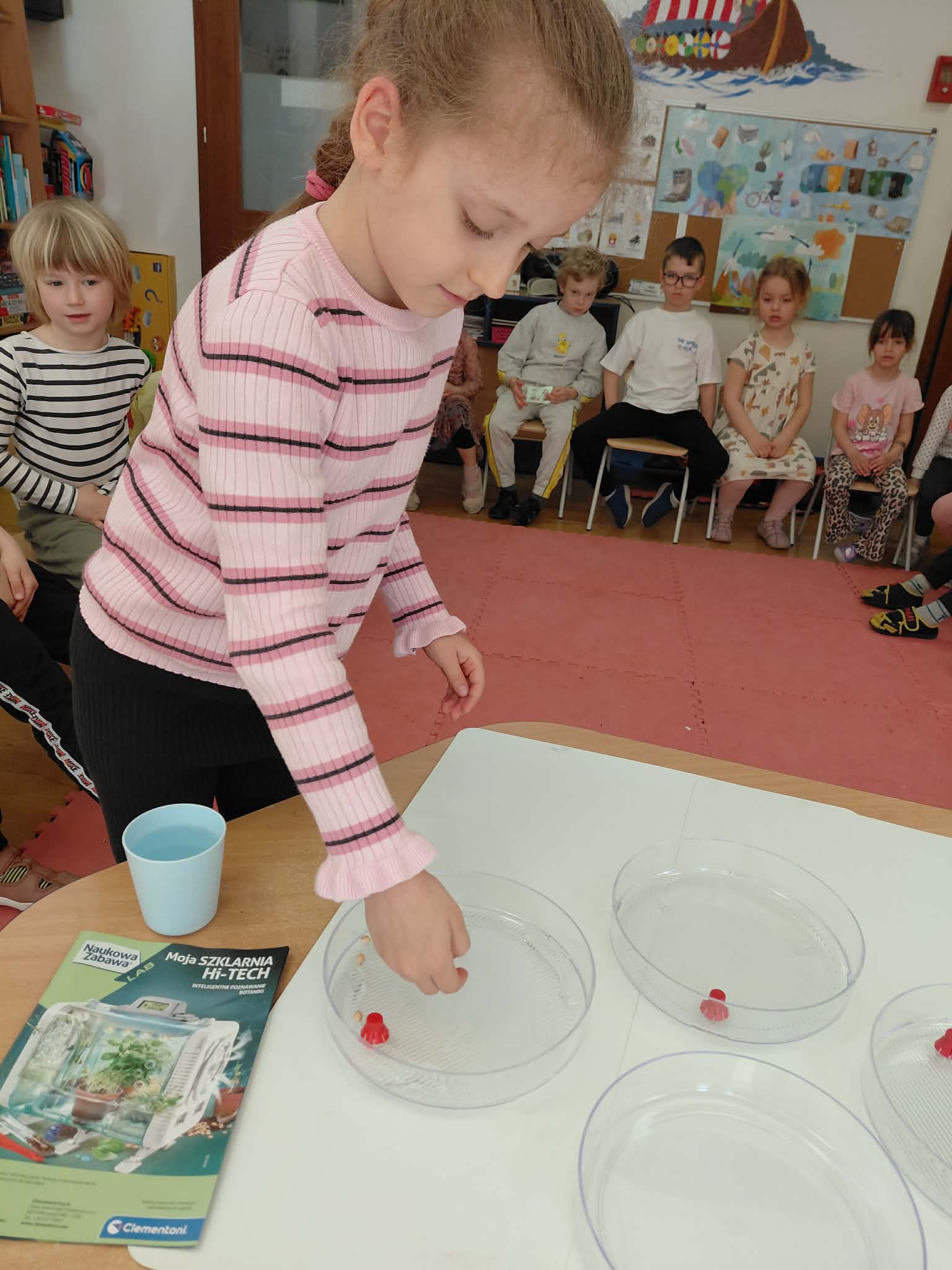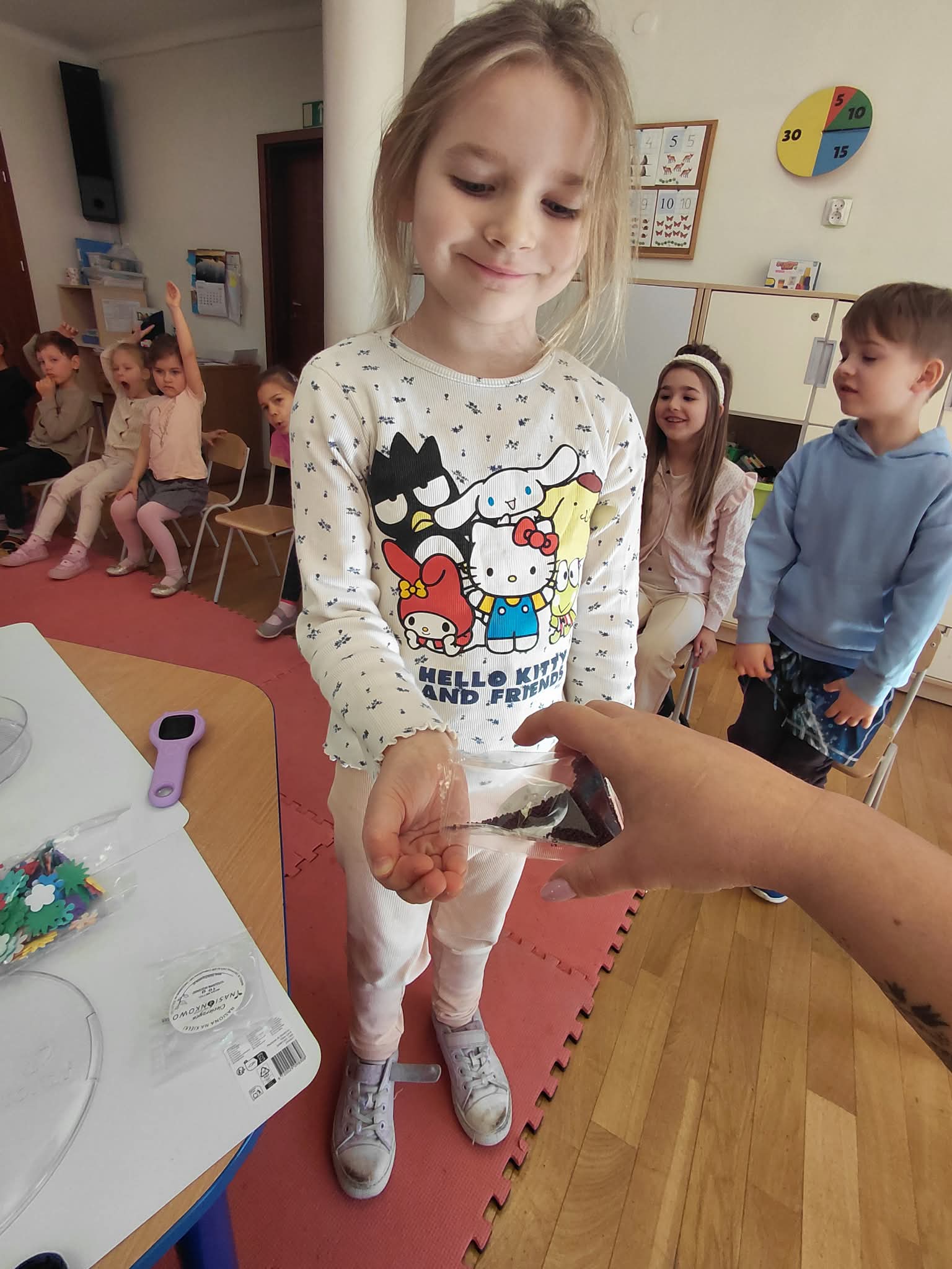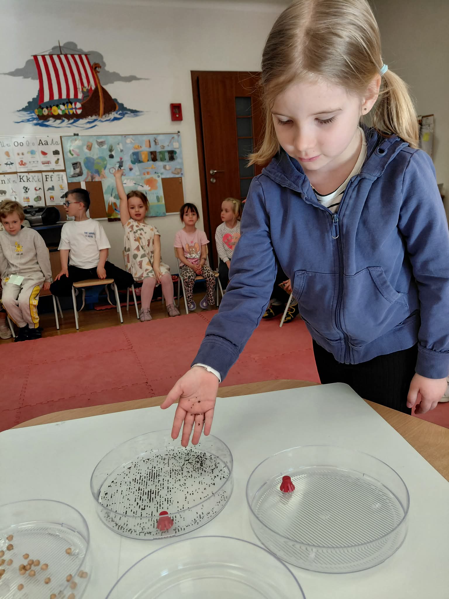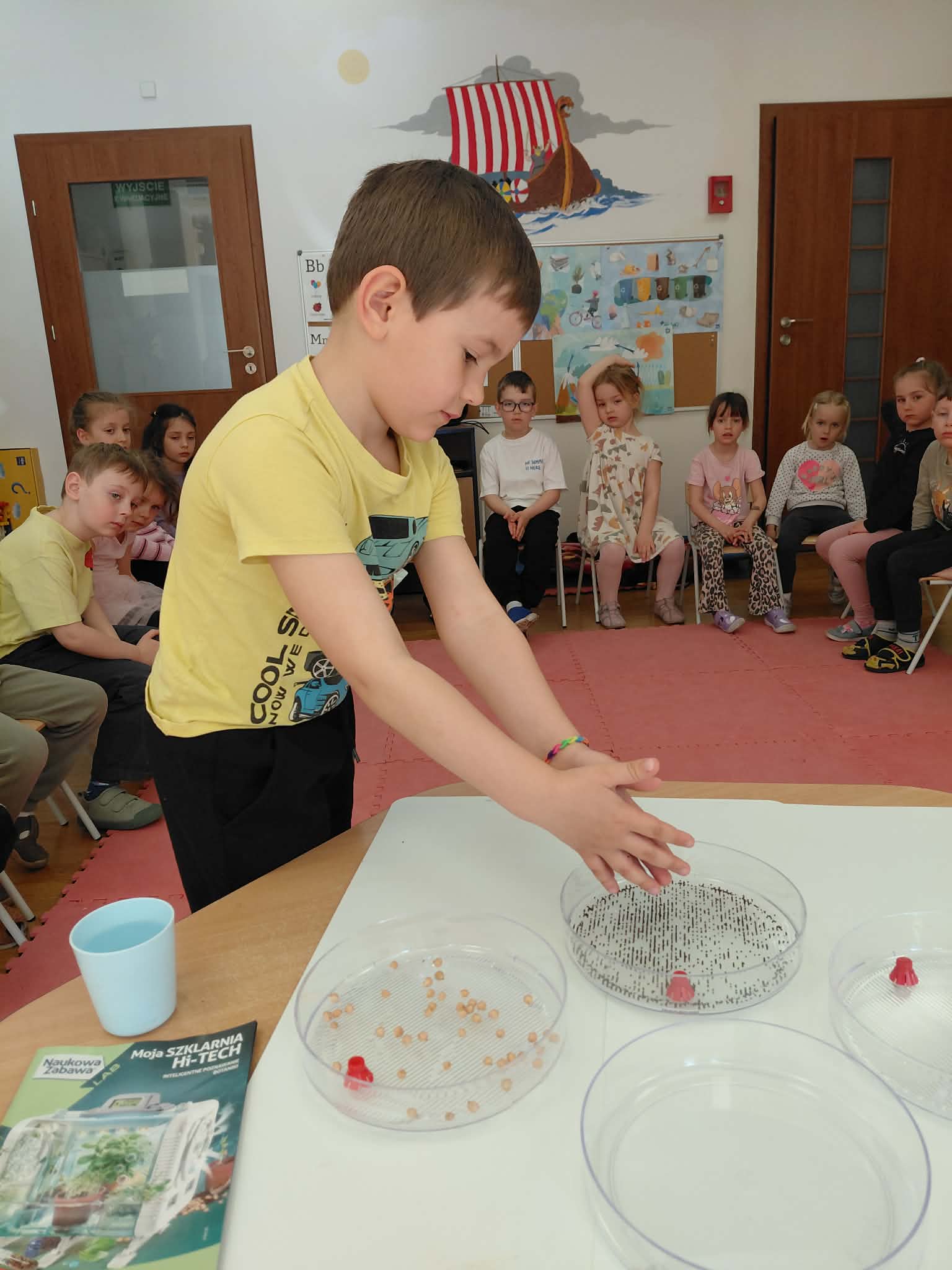 Dzisiaj założyliśmy nasz grupowy kiełkownik z różnych nasion, które wybraliśmy poprzez głosowanie. Każdy z nas miał możliwość wyboru na które nasionka chce zagłosować przyklejając kwiatek. Na koniec głosowania przeliczyliśmy które nasiona uzyskały najwięcej głosów i to właśnie je posialiśmy. Mieliśmy również możliwość obserwacji nasion pod mikroskopem. Teraz pozostało nam tylko cierpliwie czekać, pielęgnować i obserwować zmiany zachodzące w kiełkownicy.