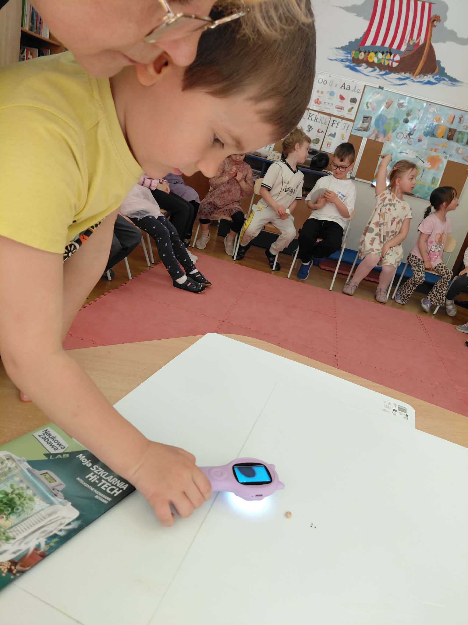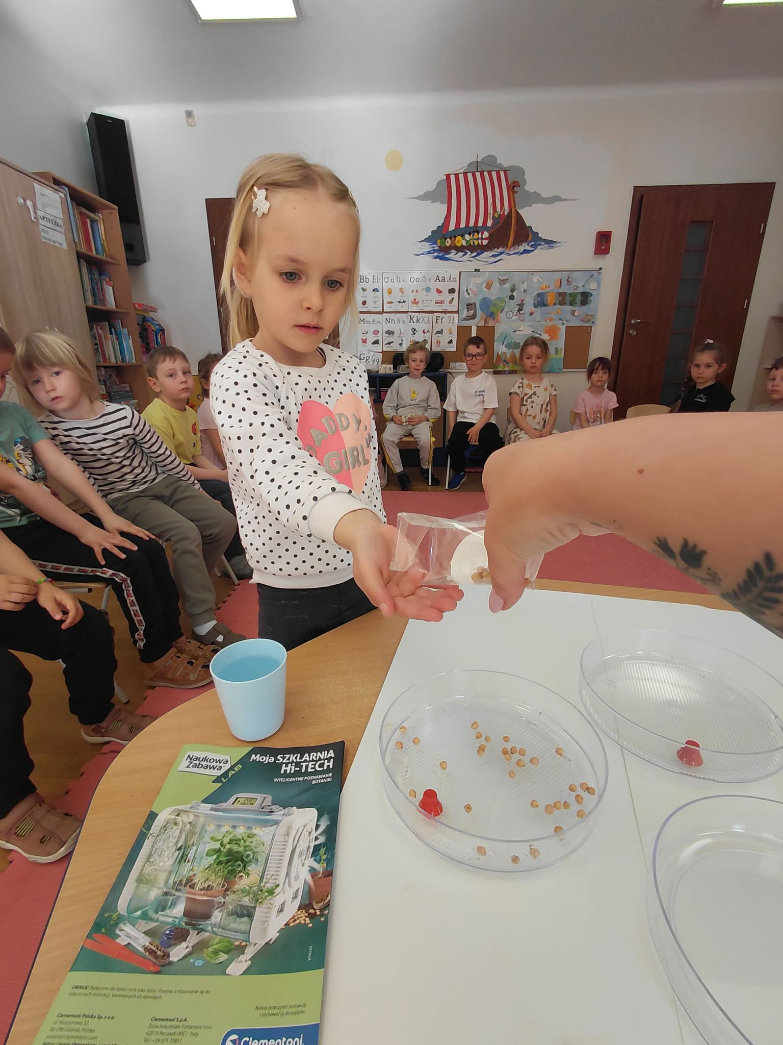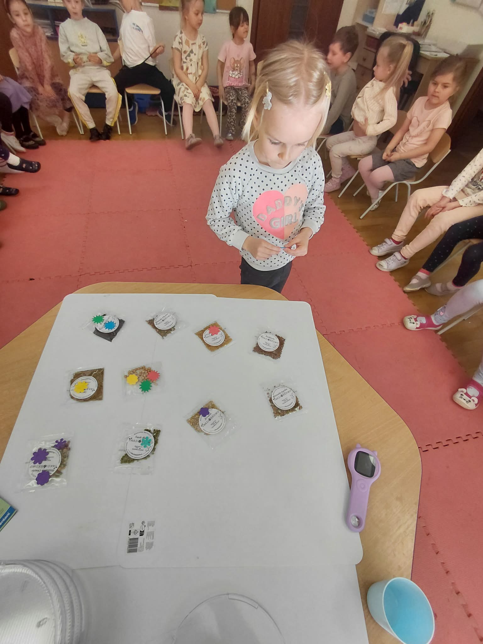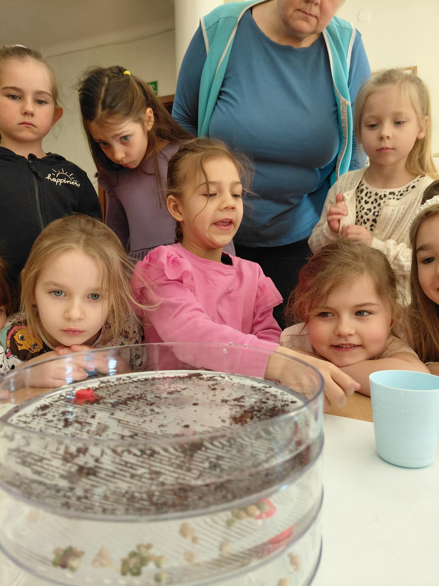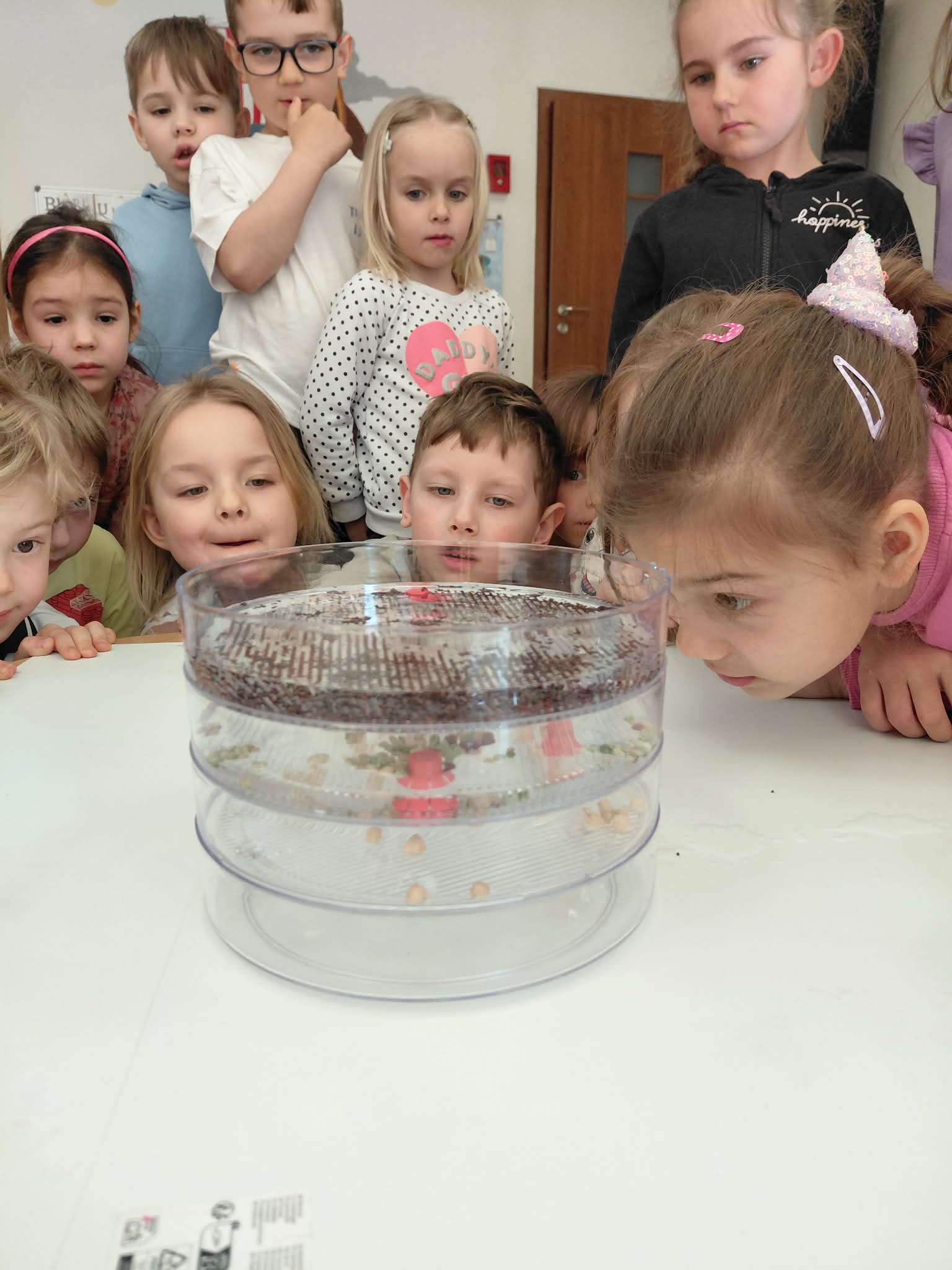 Dzisiaj założyliśmy nasz grupowy kiełkownik z różnych nasion, które wybraliśmy poprzez głosowanie. Każdy z nas miał możliwość wyboru na które nasionka chce zagłosować przyklejając kwiatek. Na koniec głosowania przeliczyliśmy które nasiona uzyskały najwięcej głosów i to właśnie je posialiśmy. Mieliśmy również możliwość obserwacji nasion pod mikroskopem. Teraz pozostało nam tylko cierpliwie czekać, pielęgnować i obserwować zmiany zachodzące w kiełkownicy.