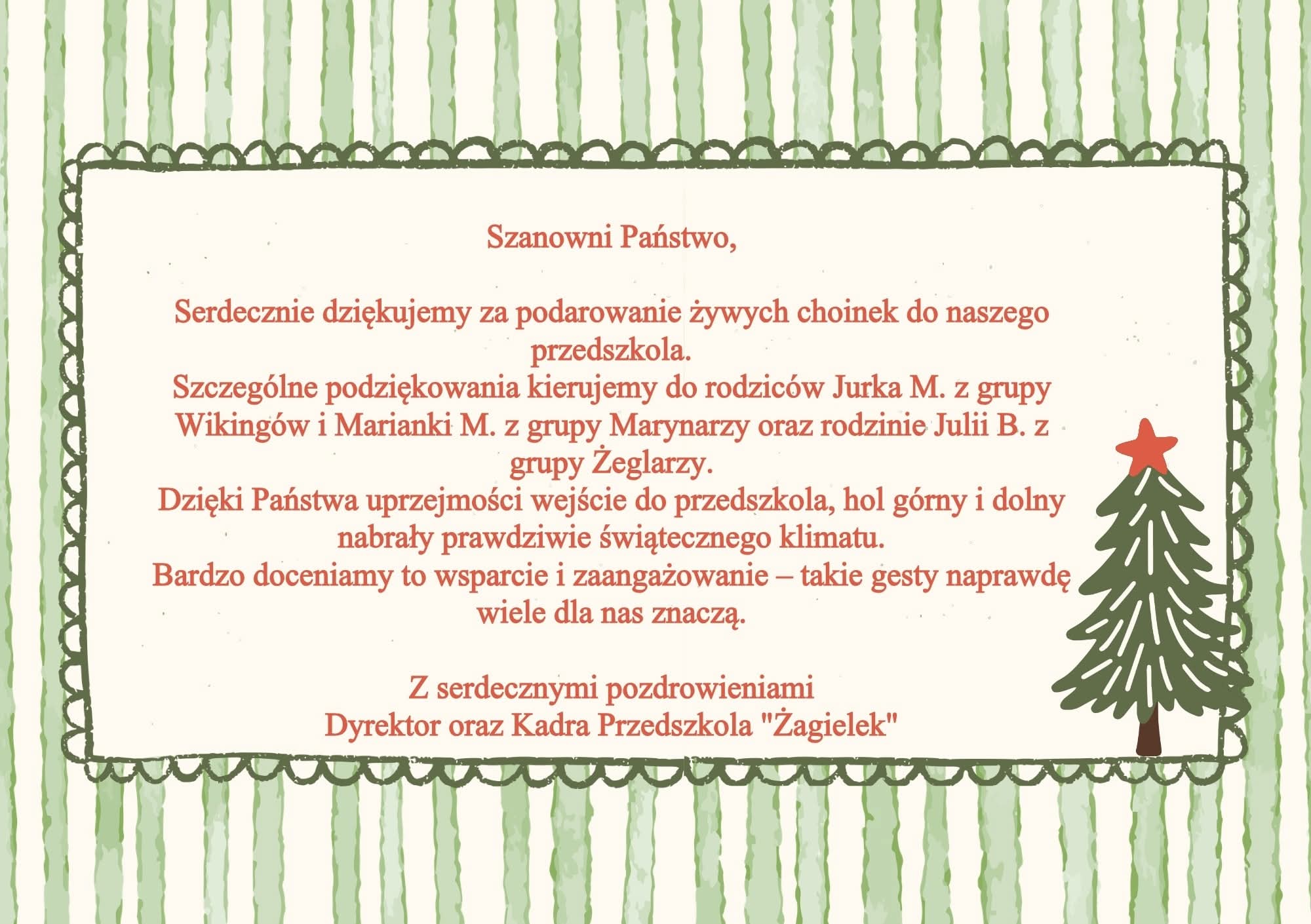 Rodzicom Mateuszka K. z grupy „Wikingów” bardzo dziękujemy za cudne, prawdziwe choinki dla naszego „Żagielka”! Pachną prawdziwym lasem i wiatrem,…
