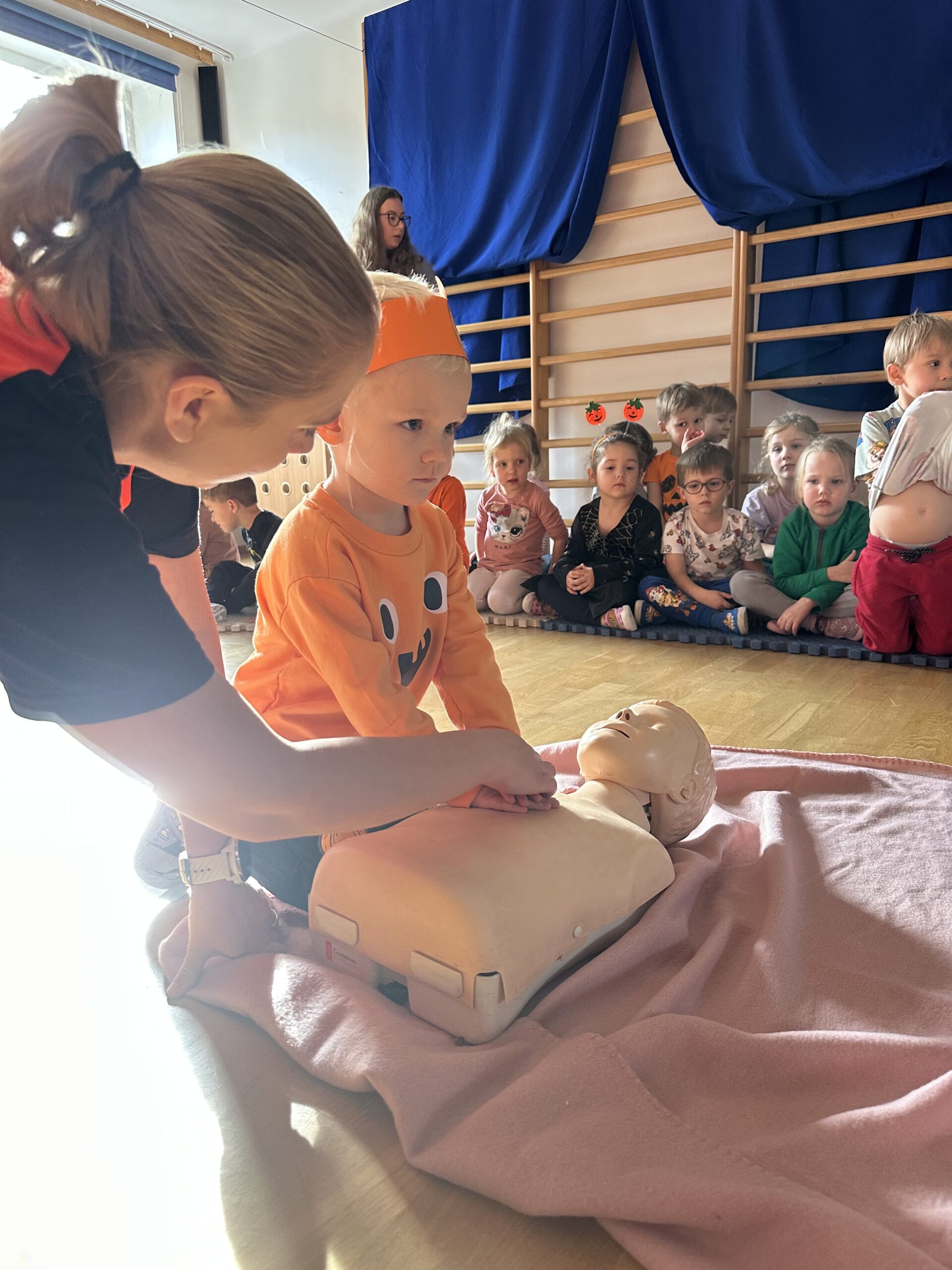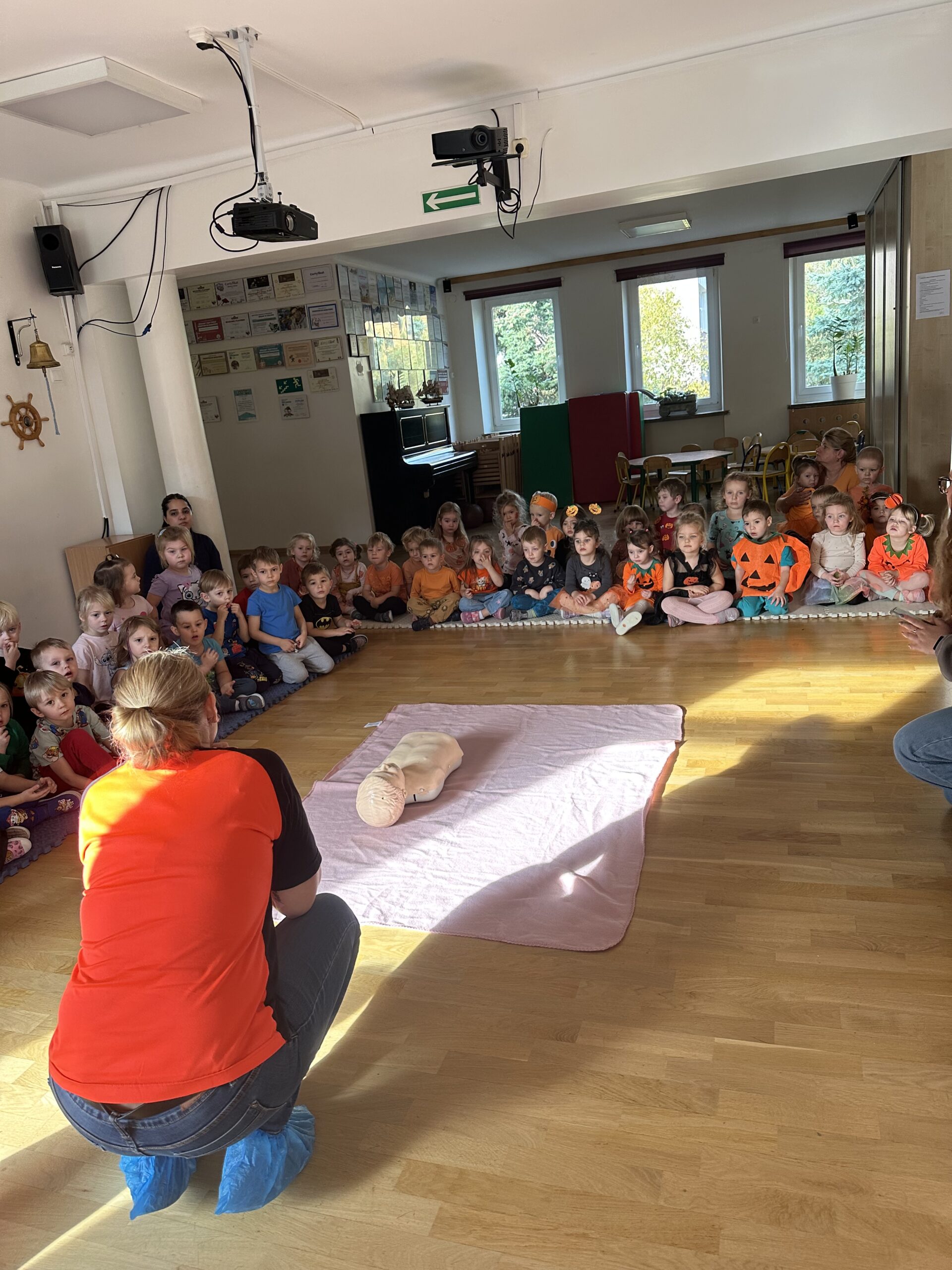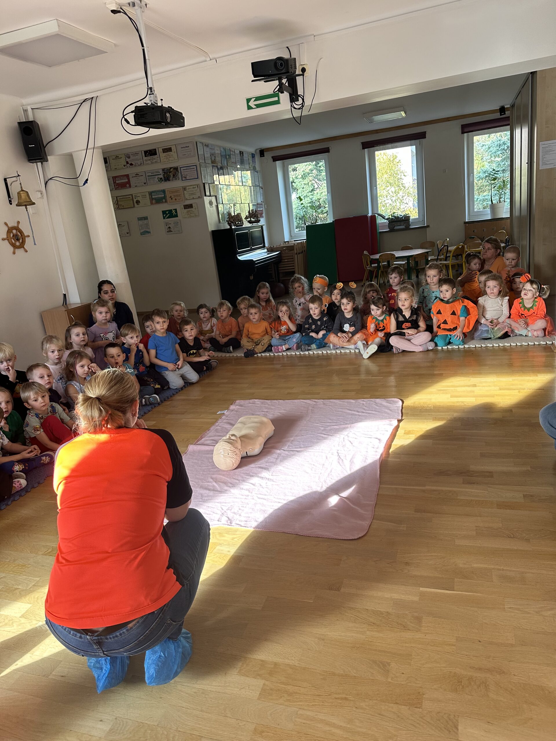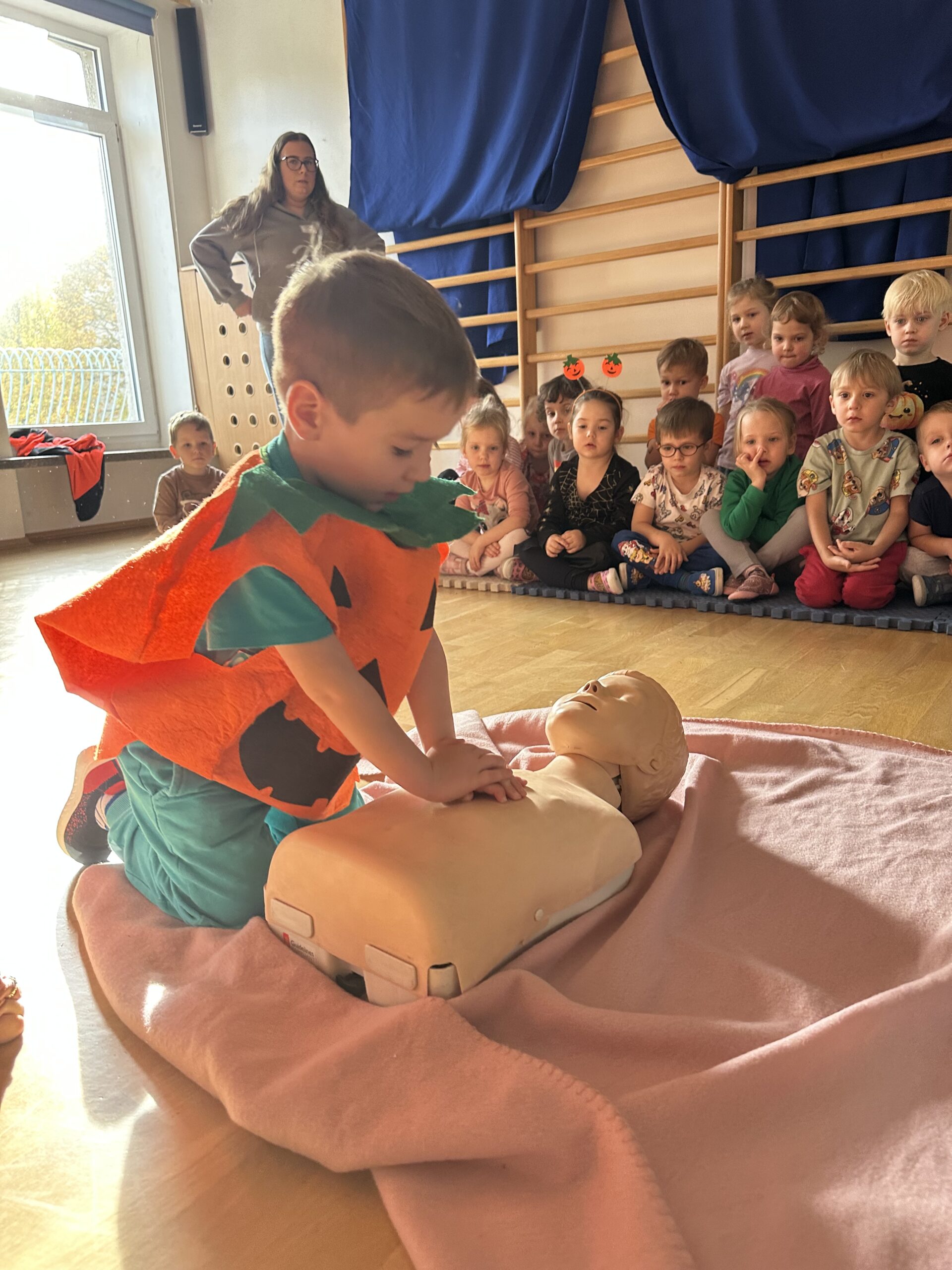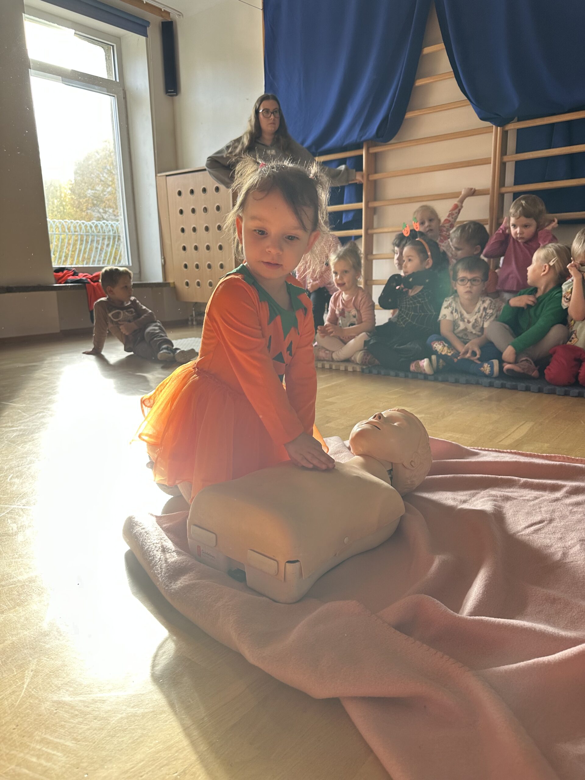 W piątek 31 października oprócz Dnia Dyni, mieliśmy także okazję wziąć udział w spotkaniu z Panią Ratownik 🚑 Dowiedzieliśmy się jak zadzwonić po pomoc oraz co jest najważniejsze podczas jej wzywania. Każdy z nas miał także możliwość spróbowania resuscytacji na specjalnym fantomie. Wcale nie było to takie łatwe! To była niezwykle ciekawa i pouczająca lekcja bezpieczeństwa! 🚑