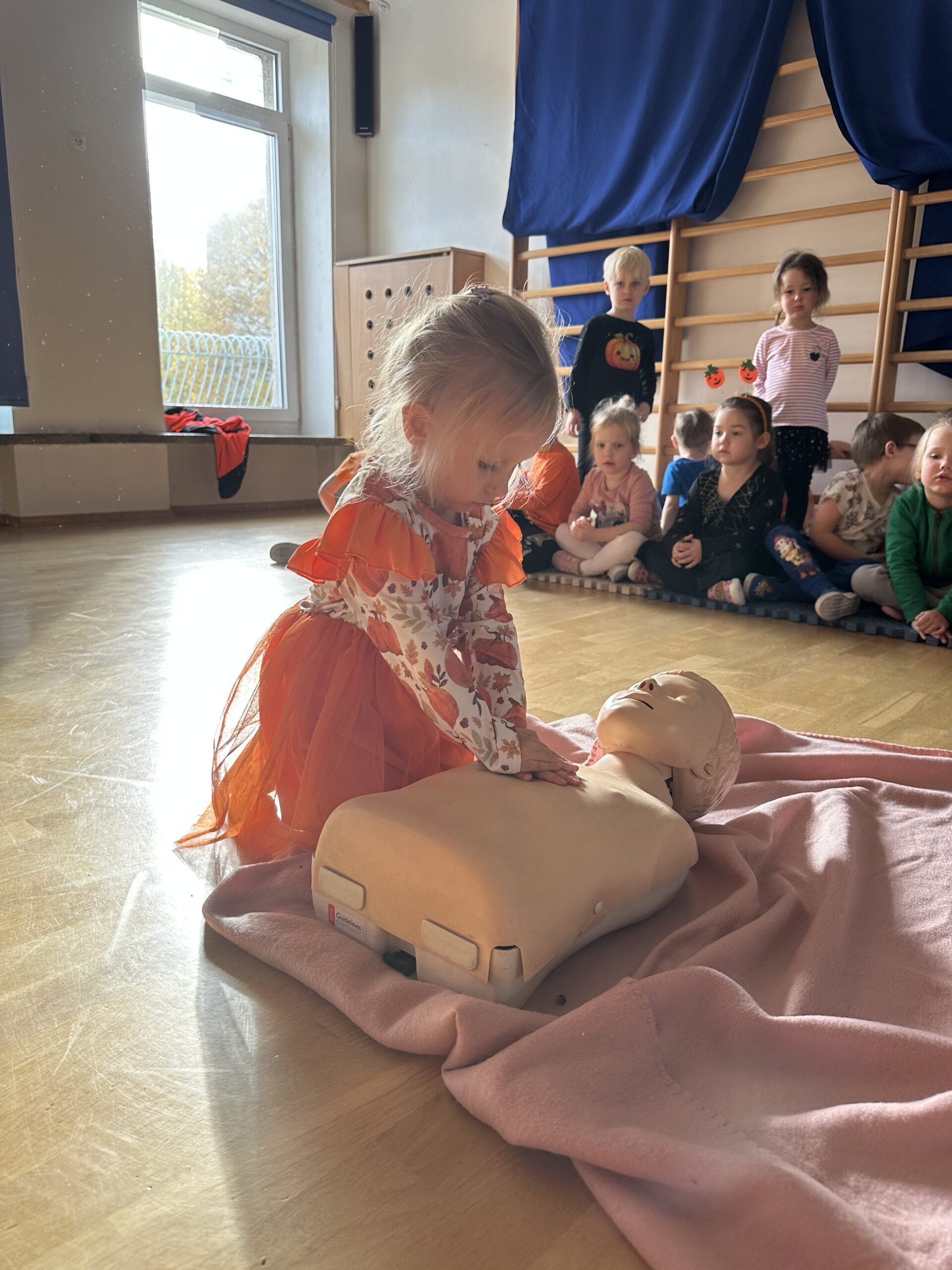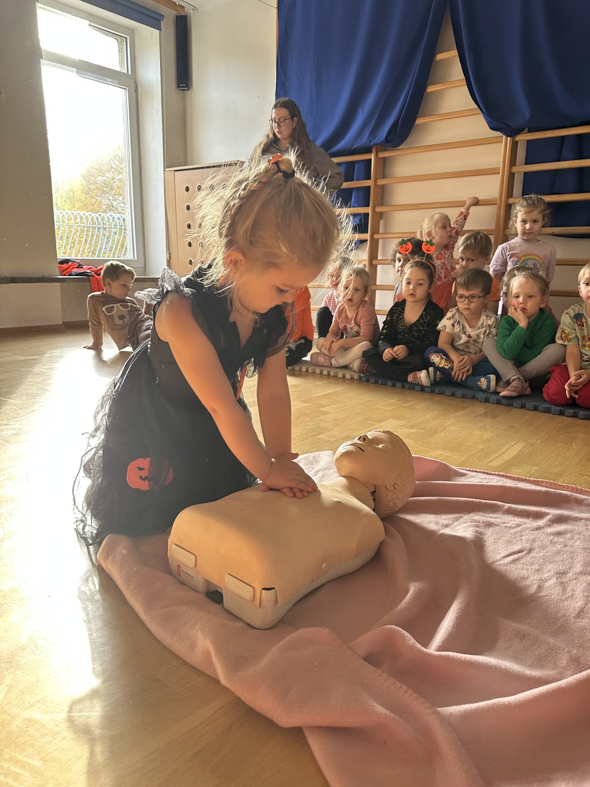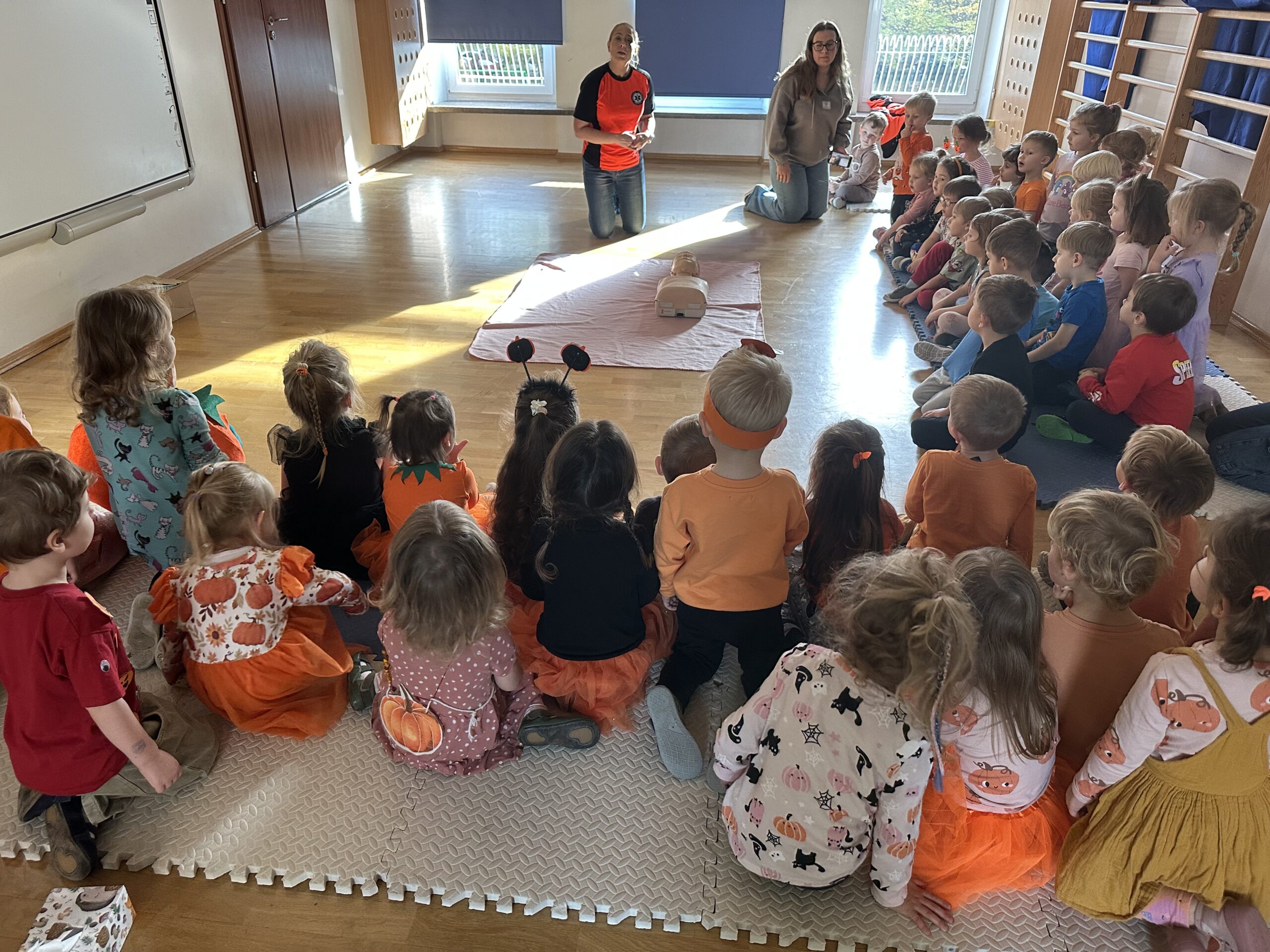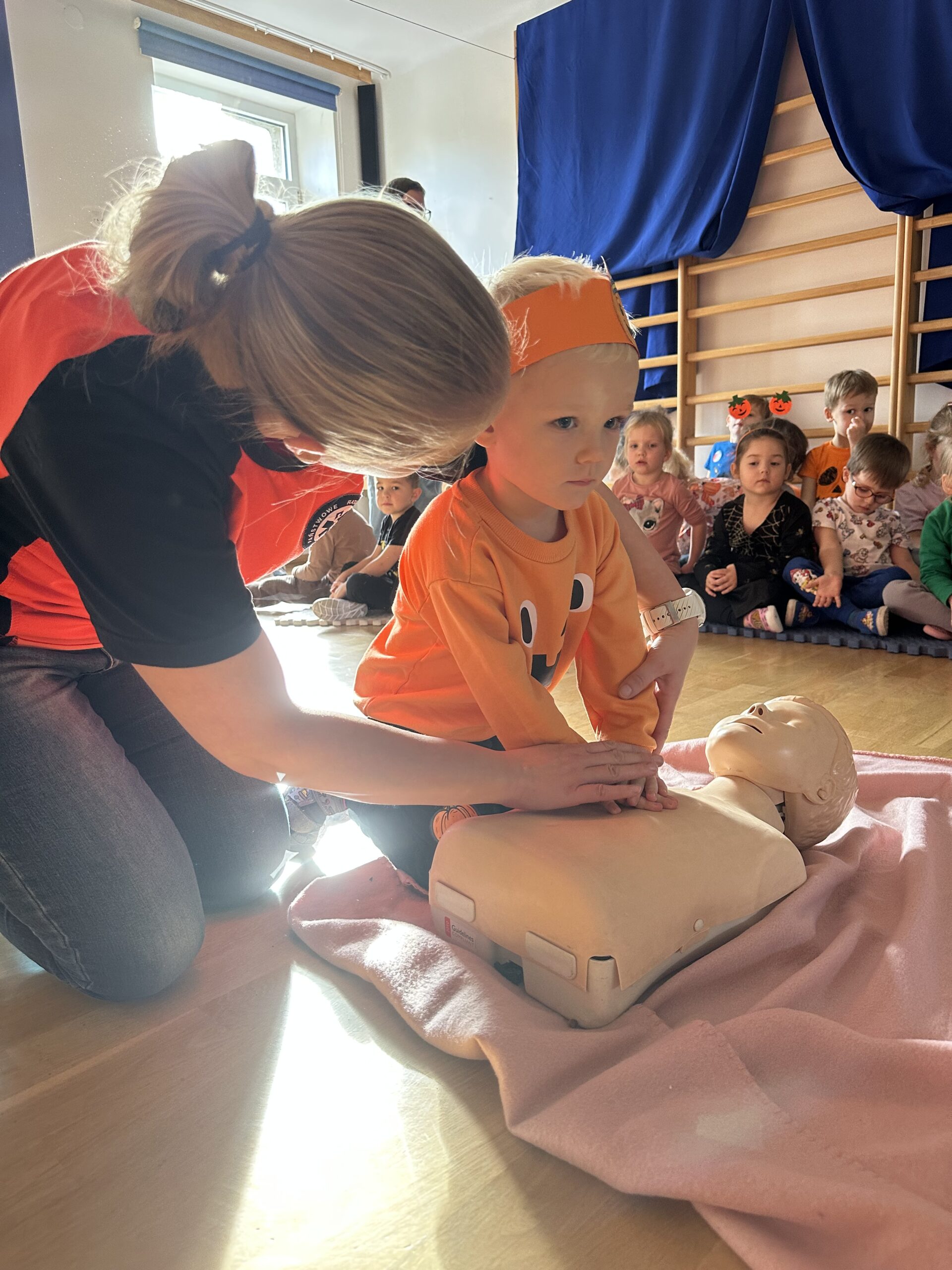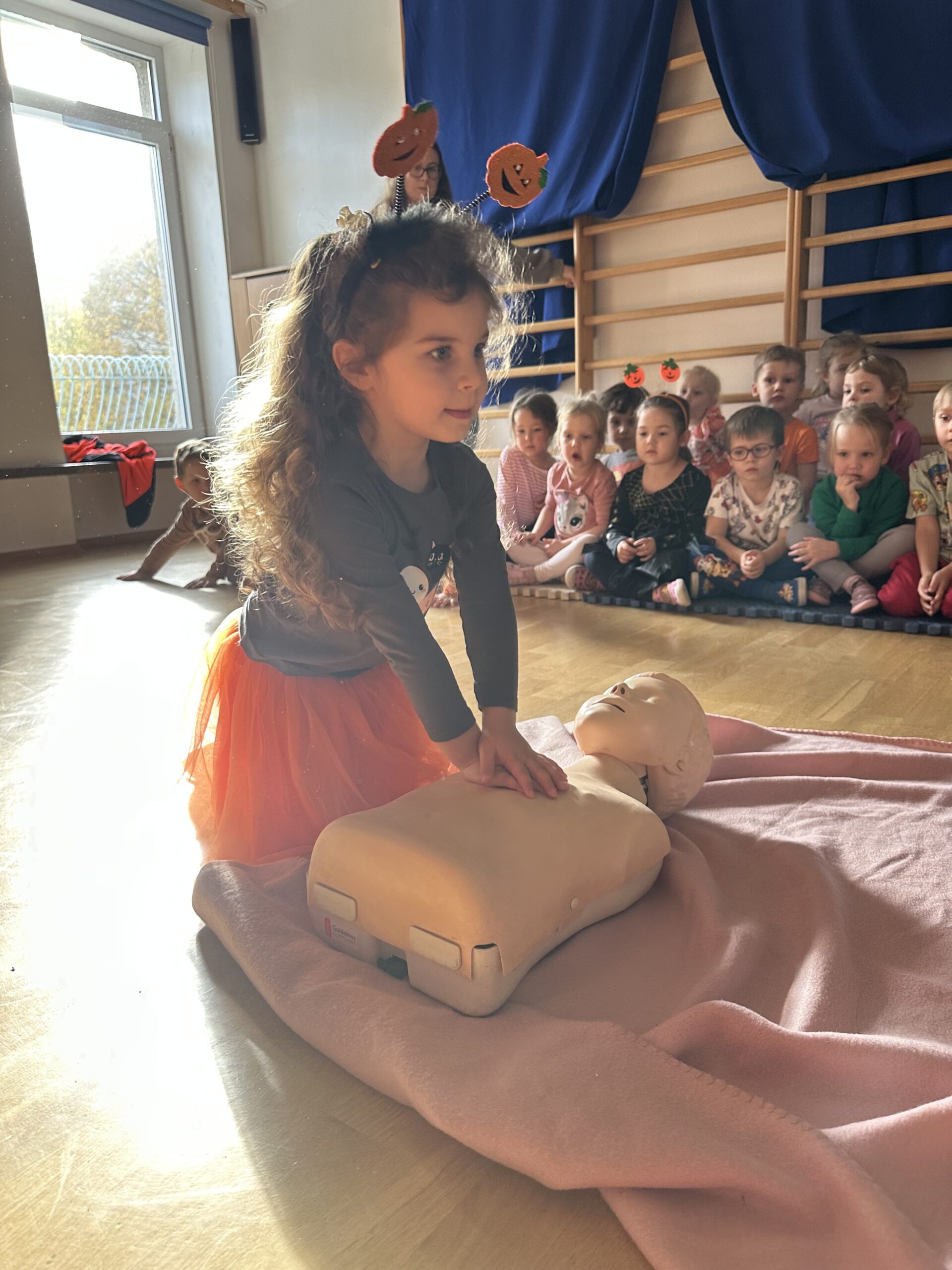 W piątek 31 października oprócz Dnia Dyni, mieliśmy także okazję wziąć udział w spotkaniu z Panią Ratownik 🚑 Dowiedzieliśmy się jak zadzwonić po pomoc oraz co jest najważniejsze podczas jej wzywania. Każdy z nas miał także możliwość spróbowania resuscytacji na specjalnym fantomie. Wcale nie było to takie łatwe! To była niezwykle ciekawa i pouczająca lekcja bezpieczeństwa! 🚑