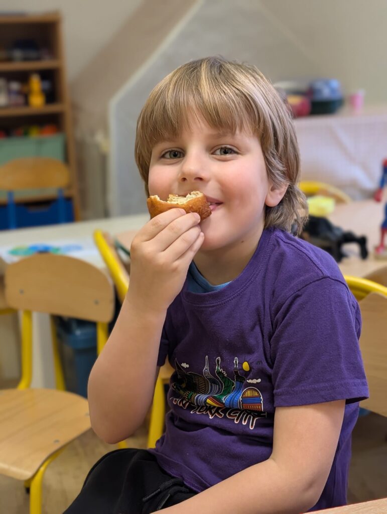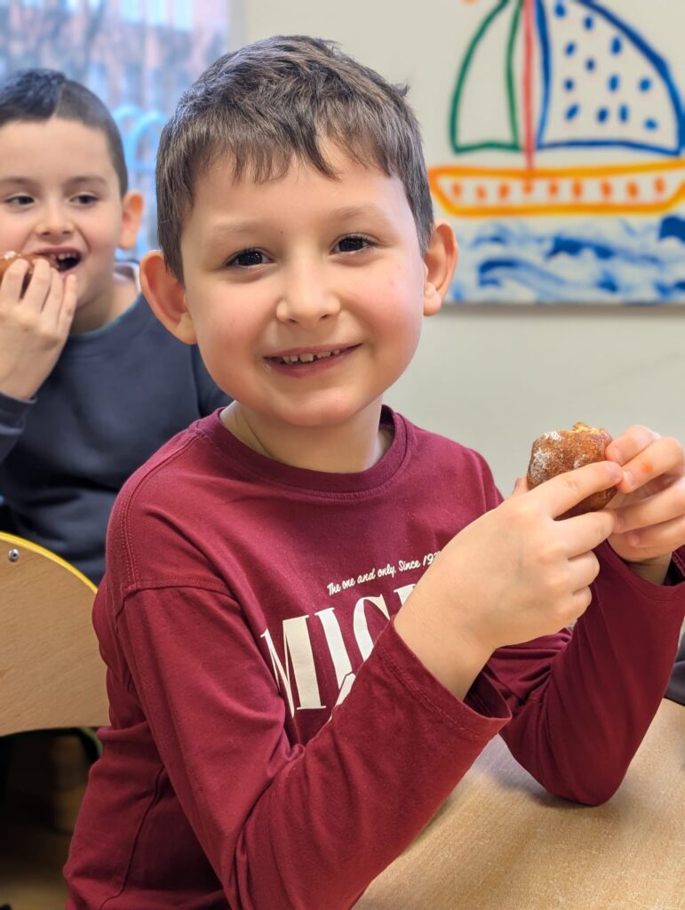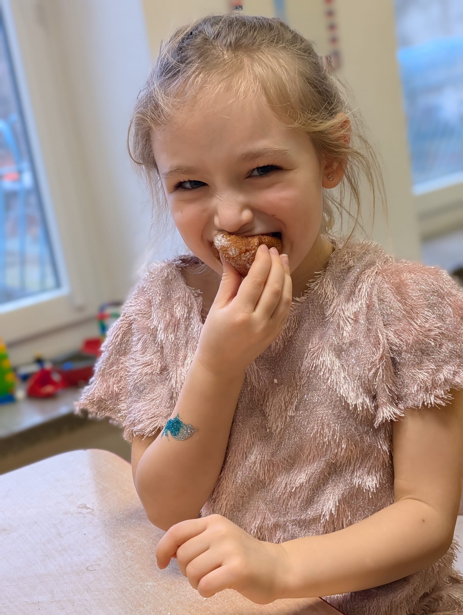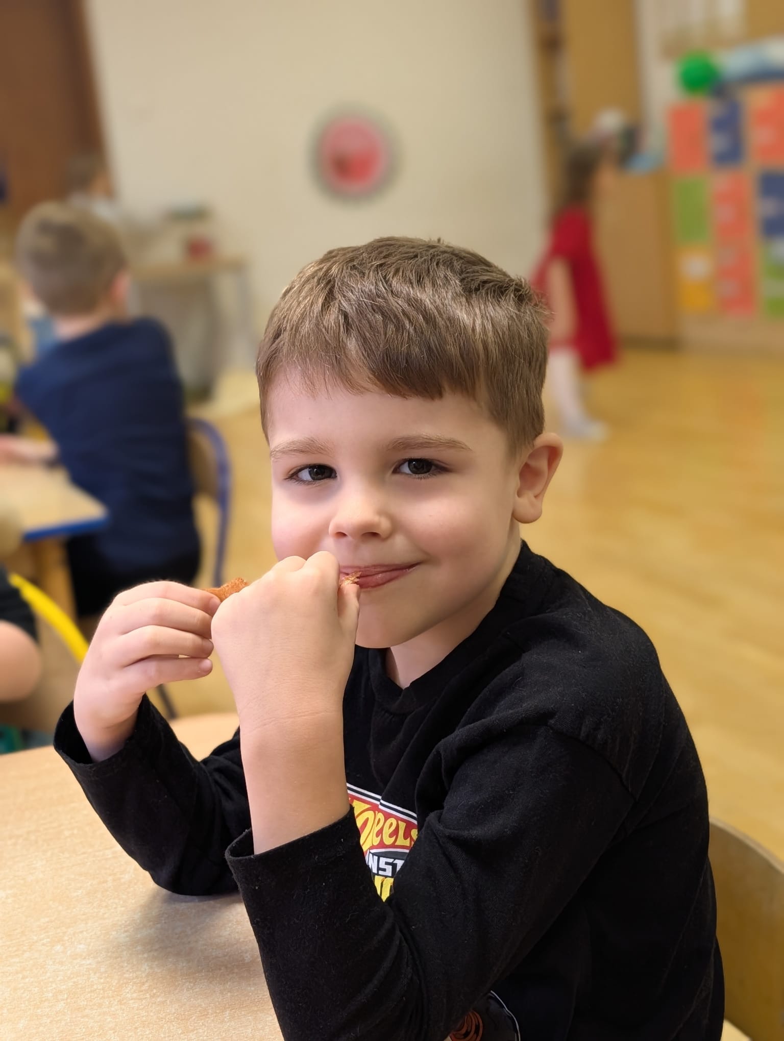 🍩 Tłusty Czwartek: Słodka Tradycja. Zgodnie ze staropolskim zwyczajem, w czwartek w całym przedszkolu unosił się zapach cukru pudru i konfitury. To był dzień, w którym liczył się przede wszystkim dobry humor (i apetyt!).Degustacja pączków: Dzieci z wielkim zapałem (i często z lukrem na nosach) zajadały się tradycyjnymi pączkami oraz chrupiącymi faworkami. Przedszkolaki dowiedziały się, dlaczego jemy pączki i skąd wzięła się tradycja „tłustego” świętowania przed nadchodzącym postem.