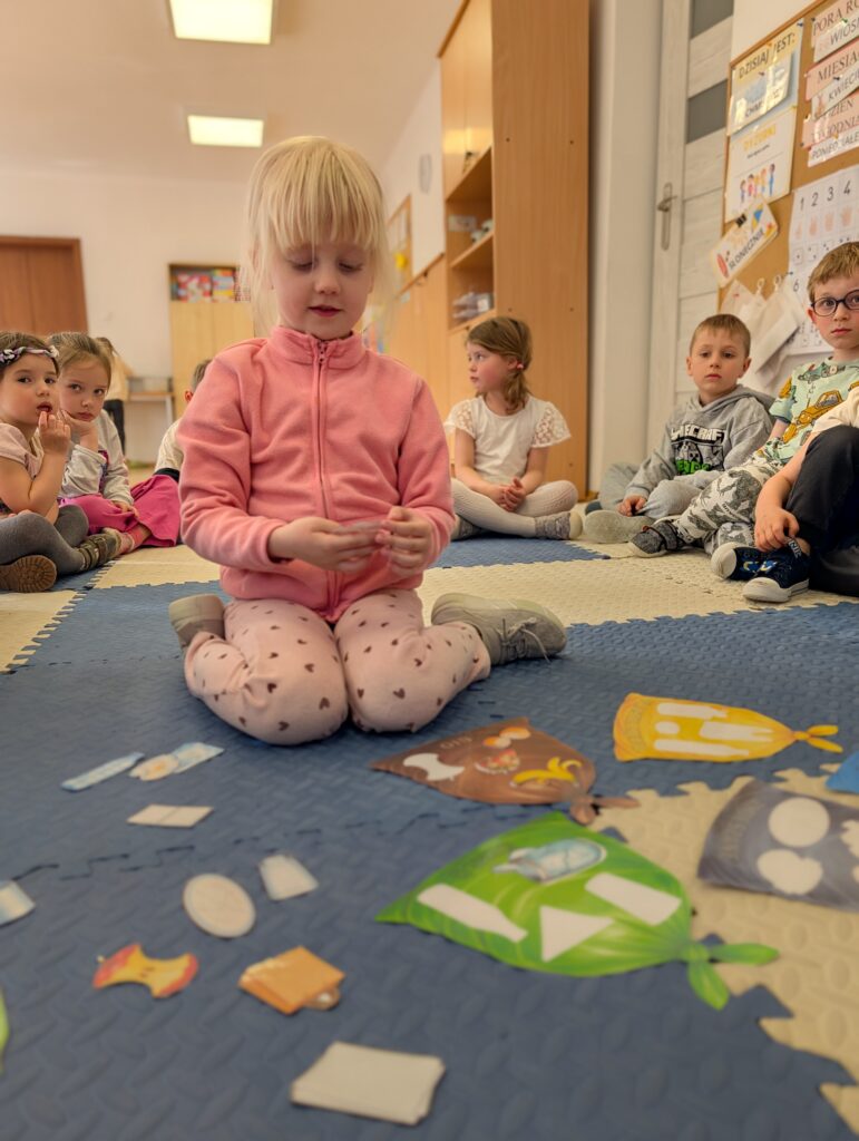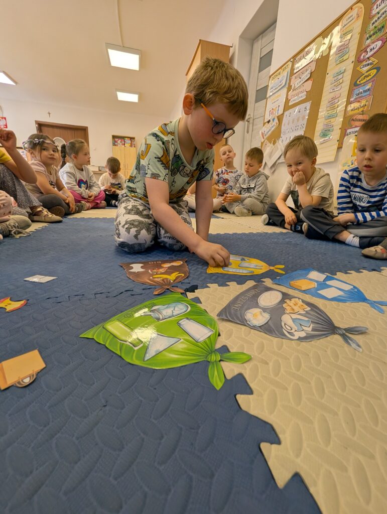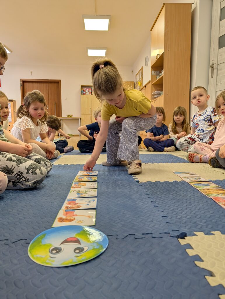 Jednym z zadań było dopasowywanie ilustracji przedstawiających dobre i złe zachowania wobec Ziemi. Przedszkolaki bez trudu wskazywały właściwe postawy – wiedzą już, jak ważne jest segregowanie odpadów, oszczędzanie wody oraz troska o przyrodę.
