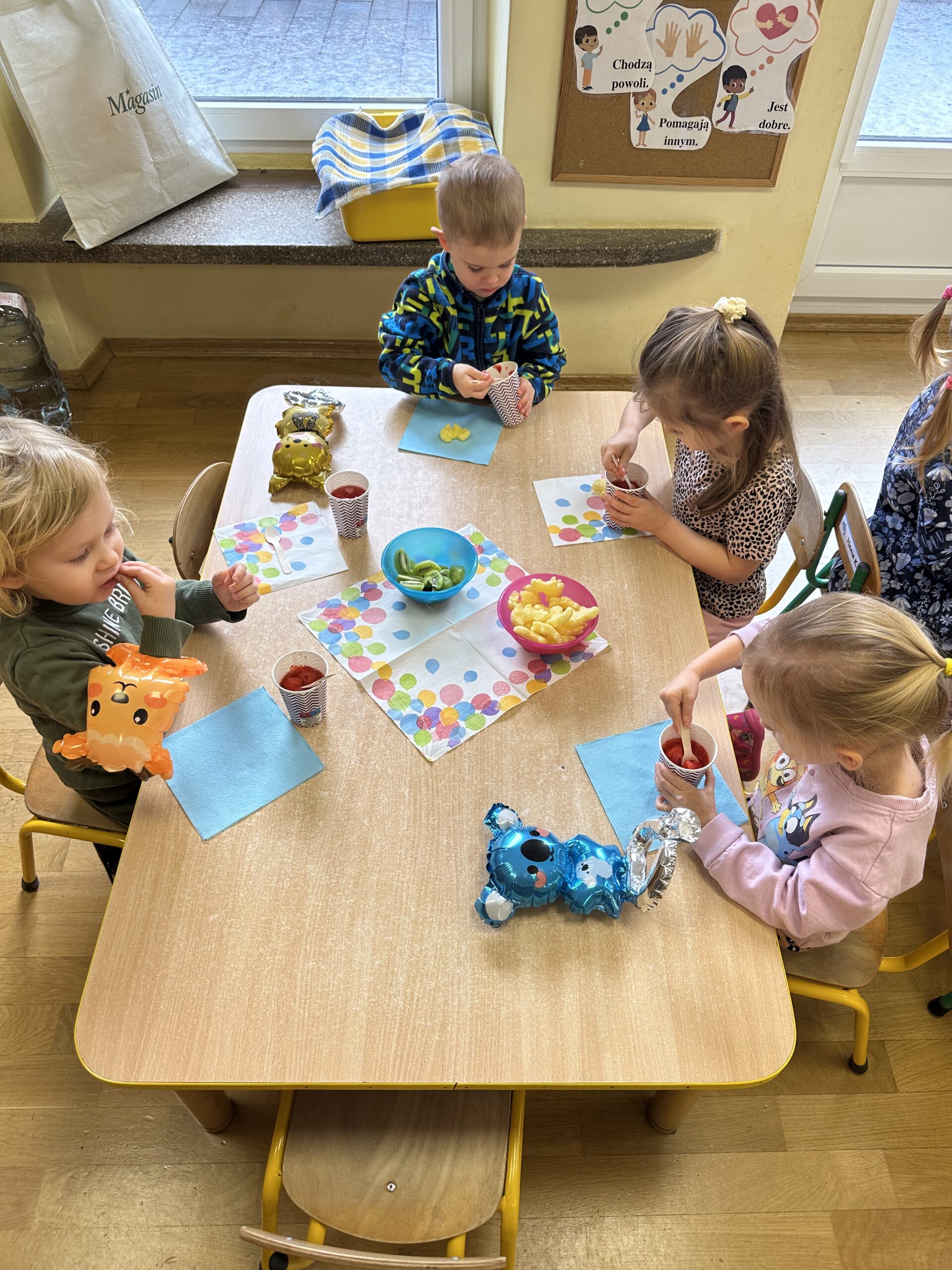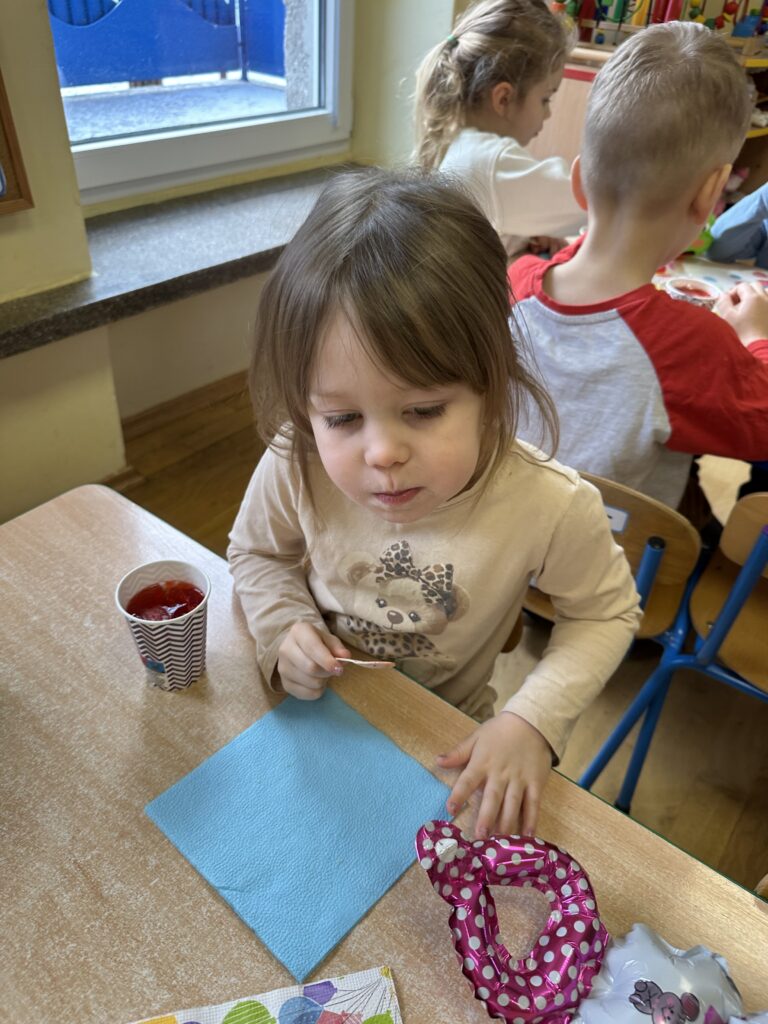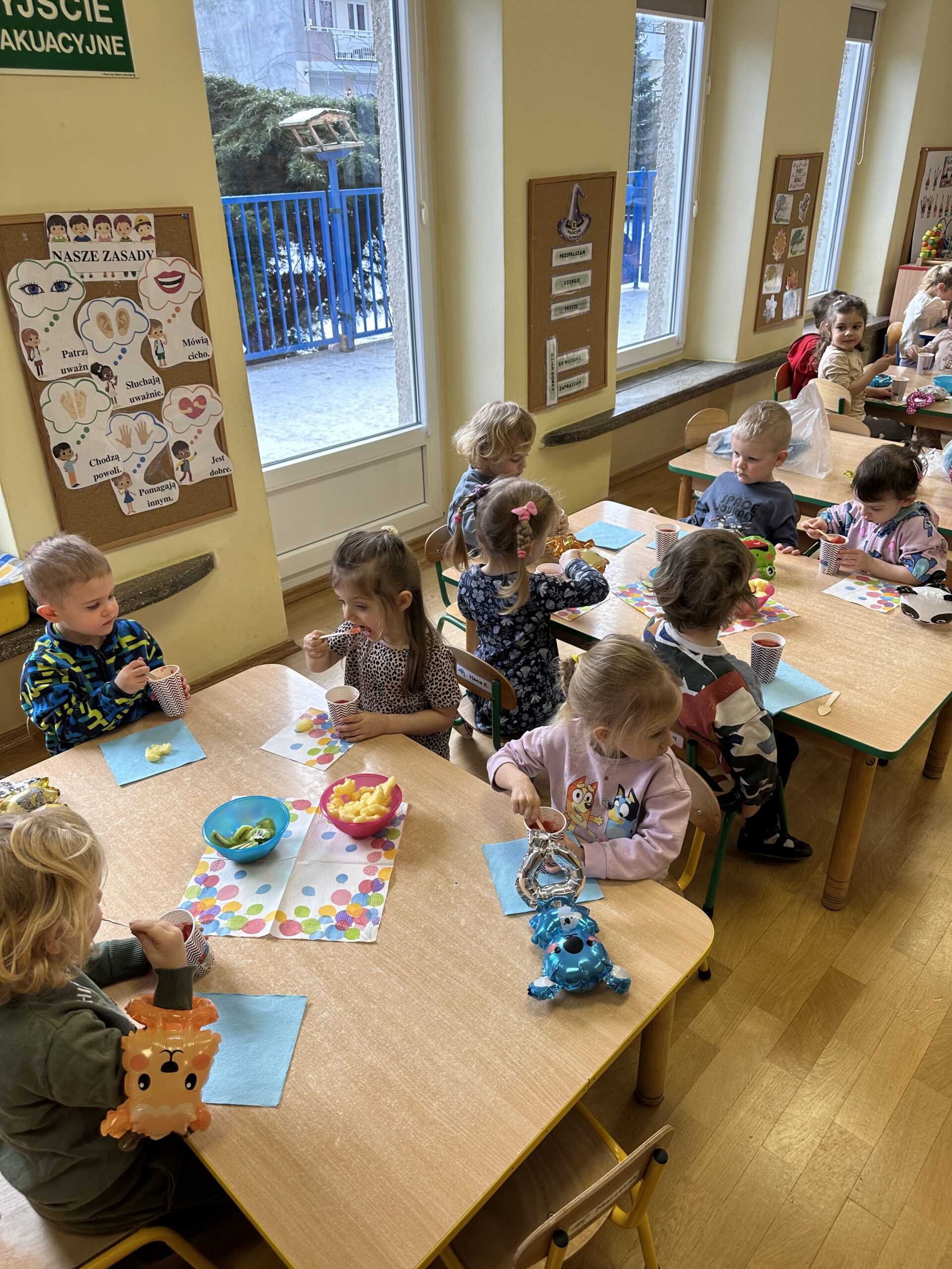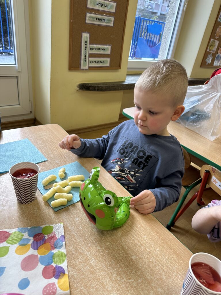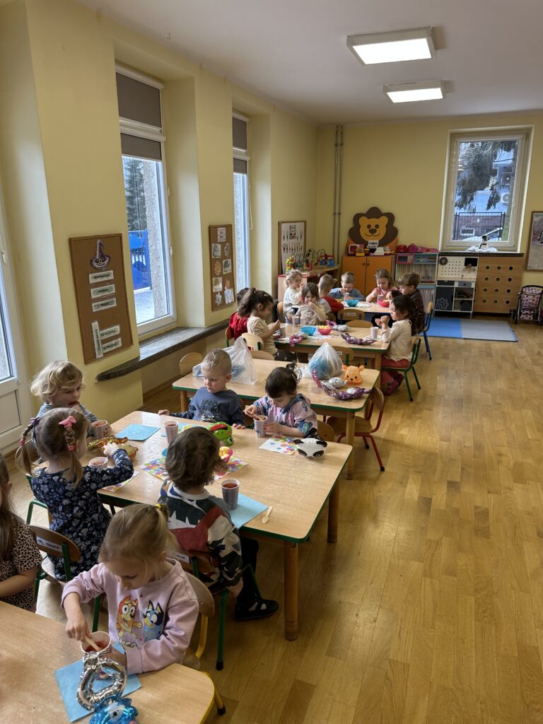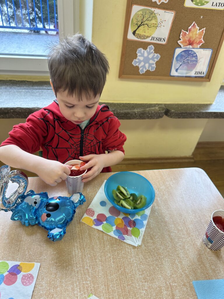 Ostatnio w naszej grupie obchodziliśmy 4. urodziny Kacpra. Świętowanie rozpoczęliśmy od złożenia życzeń. Kacper dla każdego z nas przygotował małą niespodziankę w postaci baloników. Sprawiły nam one wiele radości. Była super zabawa. Nie obyło się oczywiście bez zaśpiewania tradycyjnego „Sto lat”. Na koniec wspólnie spędziliśmy czas przy poczęstunku.