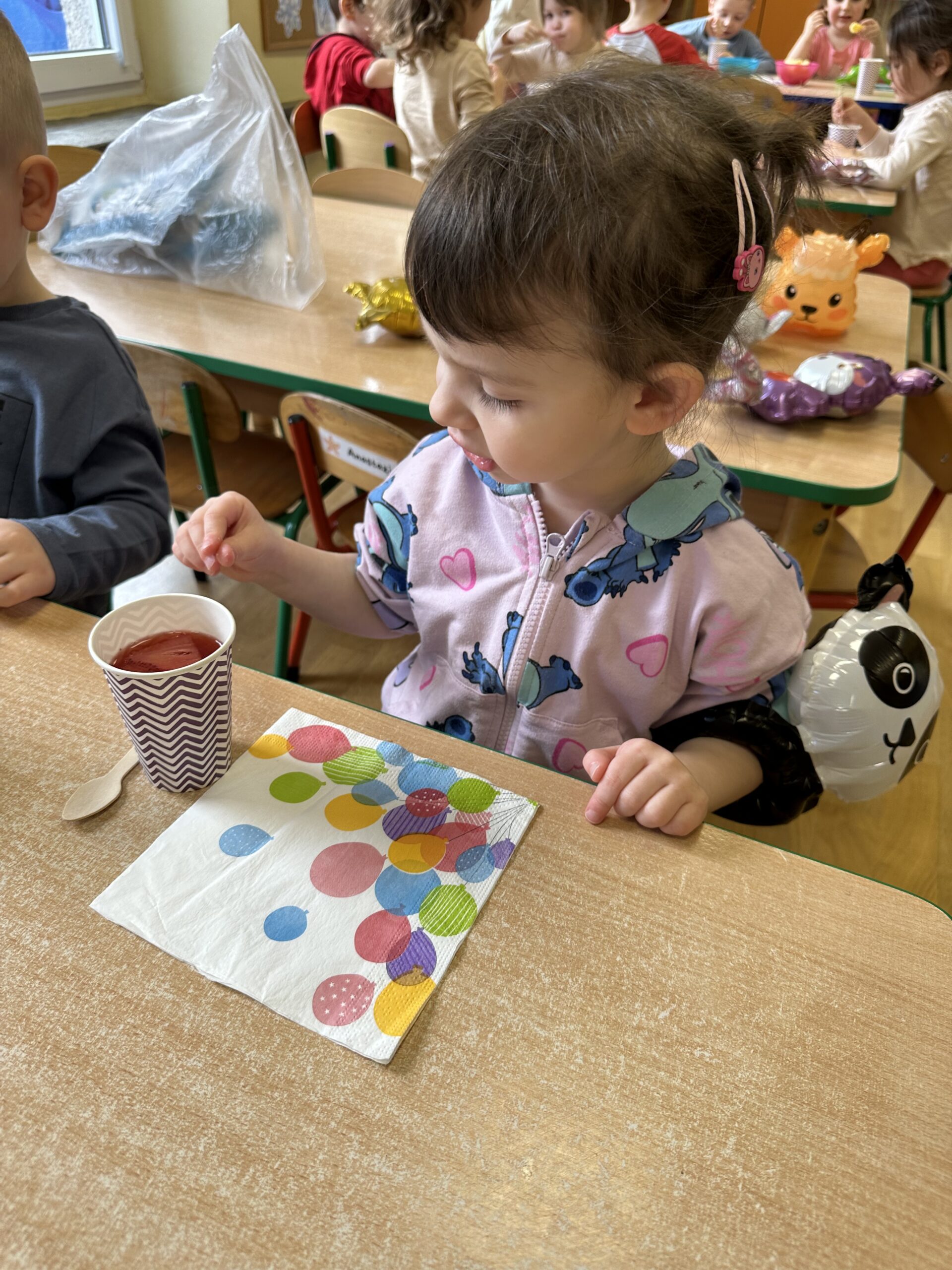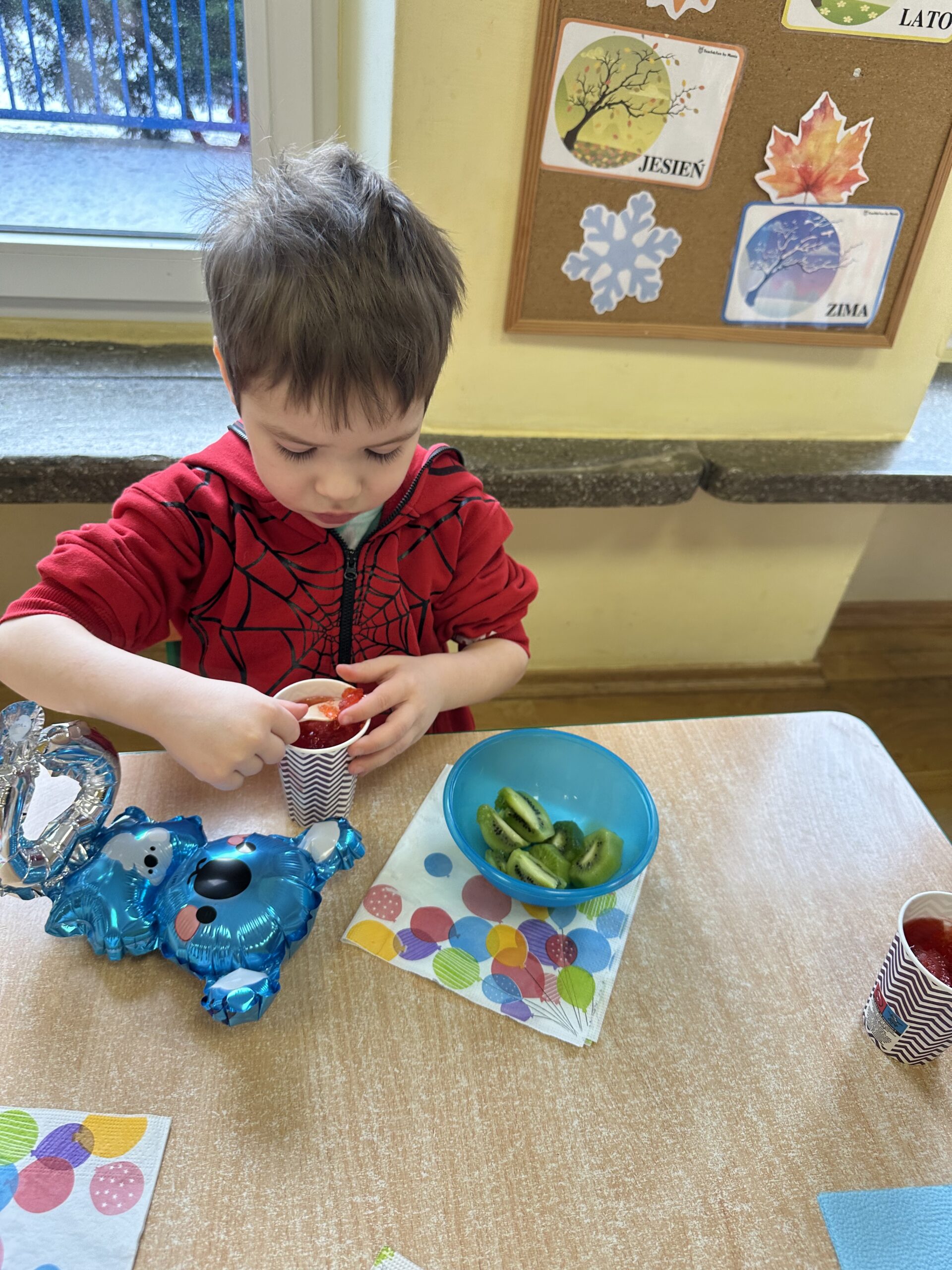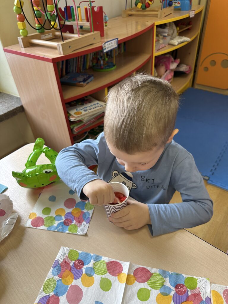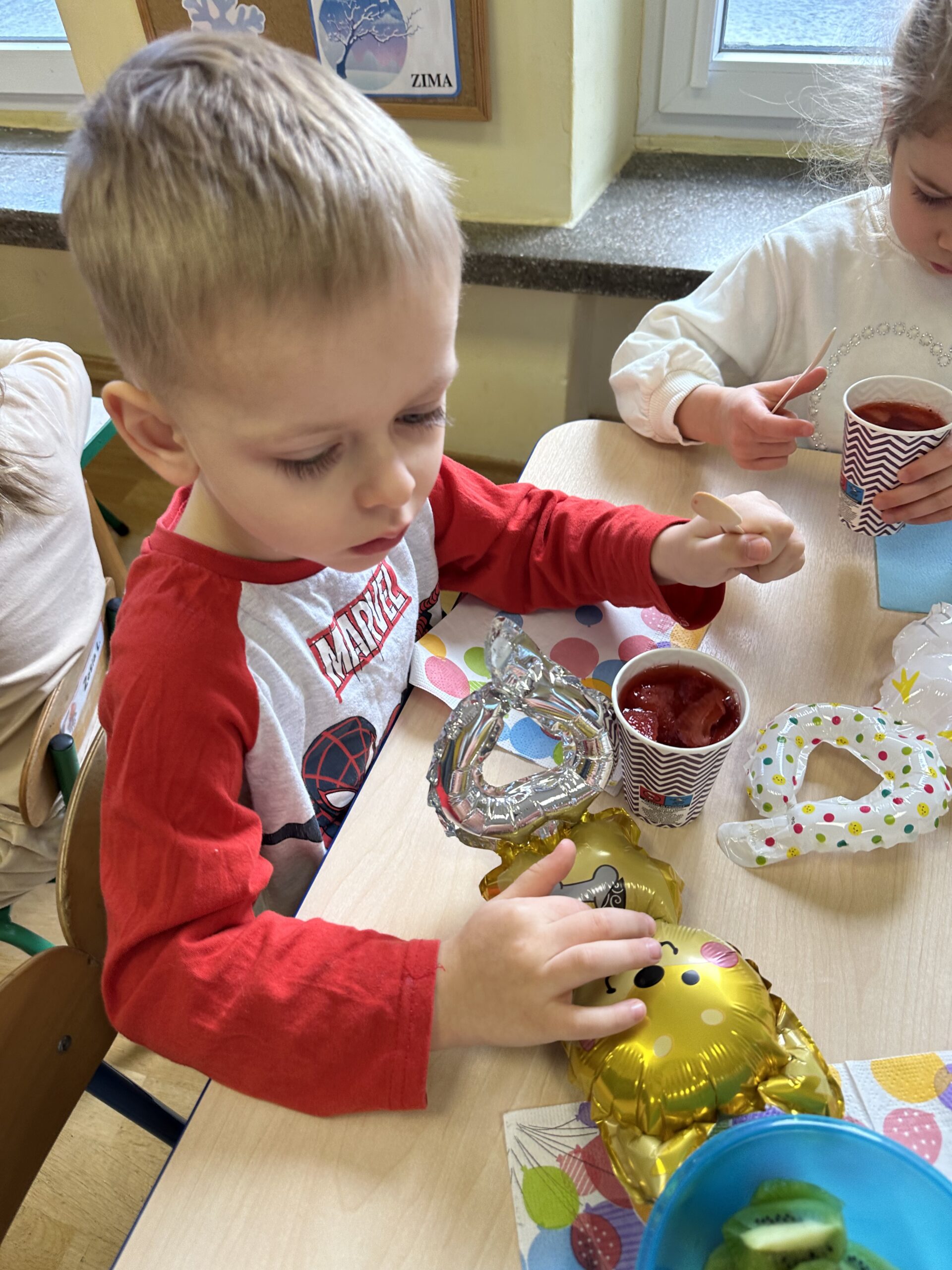 Ostatnio w naszej grupie obchodziliśmy 4. urodziny Kacpra. Świętowanie rozpoczęliśmy od złożenia życzeń. Kacper dla każdego z nas przygotował małą niespodziankę w postaci baloników. Sprawiły nam one wiele radości. Była super zabawa. Nie obyło się oczywiście bez zaśpiewania tradycyjnego „Sto lat”. Na koniec wspólnie spędziliśmy czas przy poczęstunku.