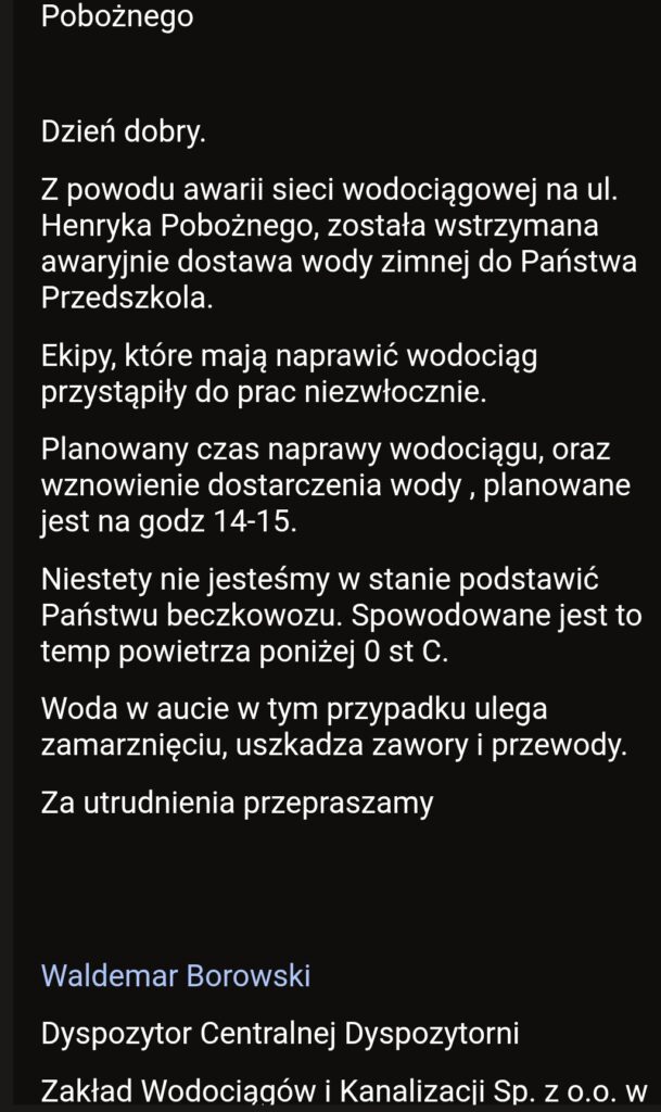 Placówka pełni dziś dyżur opiekuńczy, jednak z uwagi na brak dostępu do wody nie jesteśmy w stanie zapewnić standardowych warunków higieniczno-sanitarnych dla dzieci. Prosimy o uwzględnienie tej sytuacji przy podejmowaniu decyzji dotyczącej pobytu dziecka w przedszkolu.