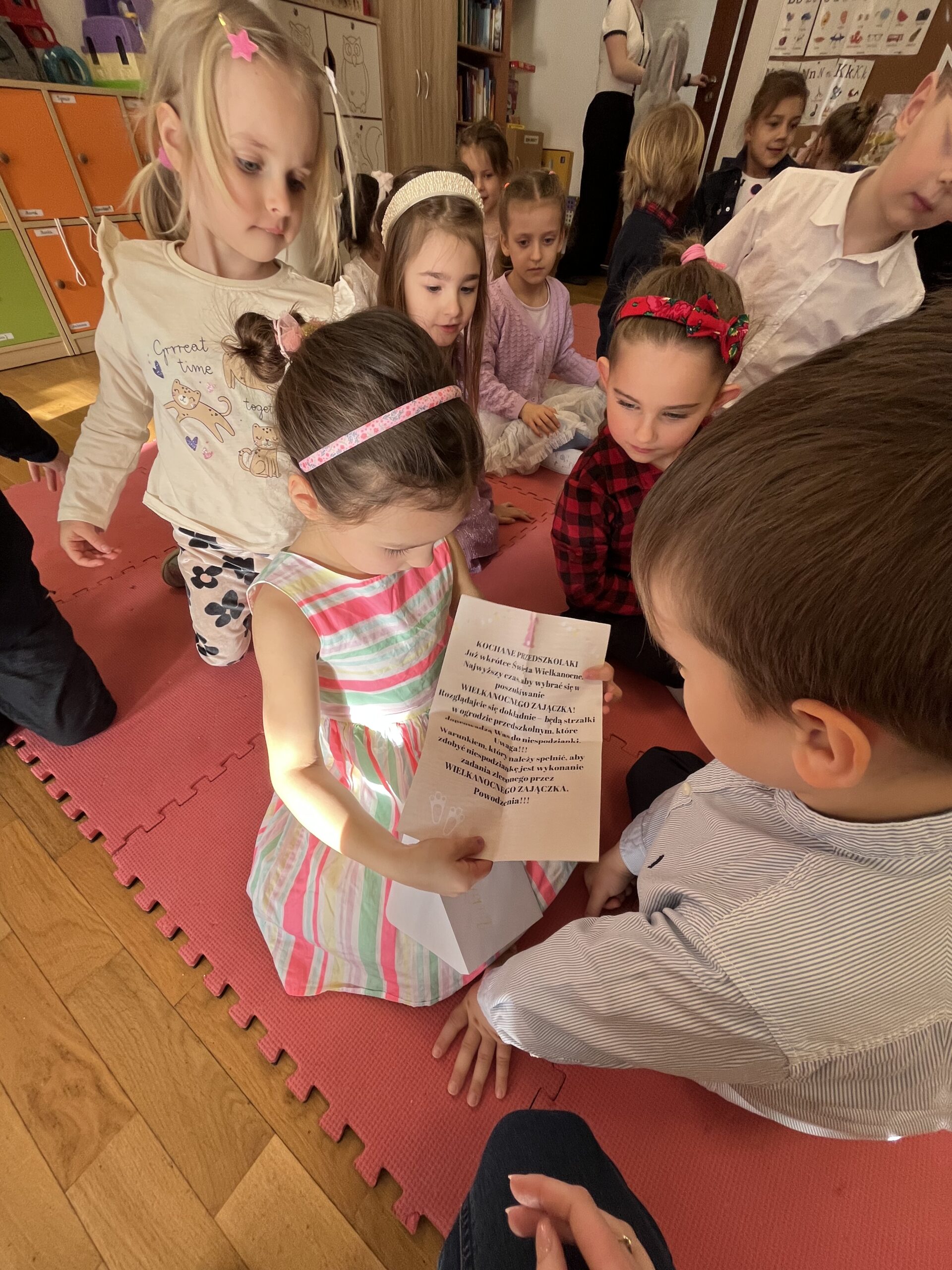 Nie zabrakło także niespodzianki – odwiedził nas wielkanocny zajączek, który przygotował dla dzieci ciekawe zadania do wykonania. Przedszkolaki z ogromnym zaangażowaniem brały udział w zabawach, rozwijając swoją spostrzegawczość i współpracę.
